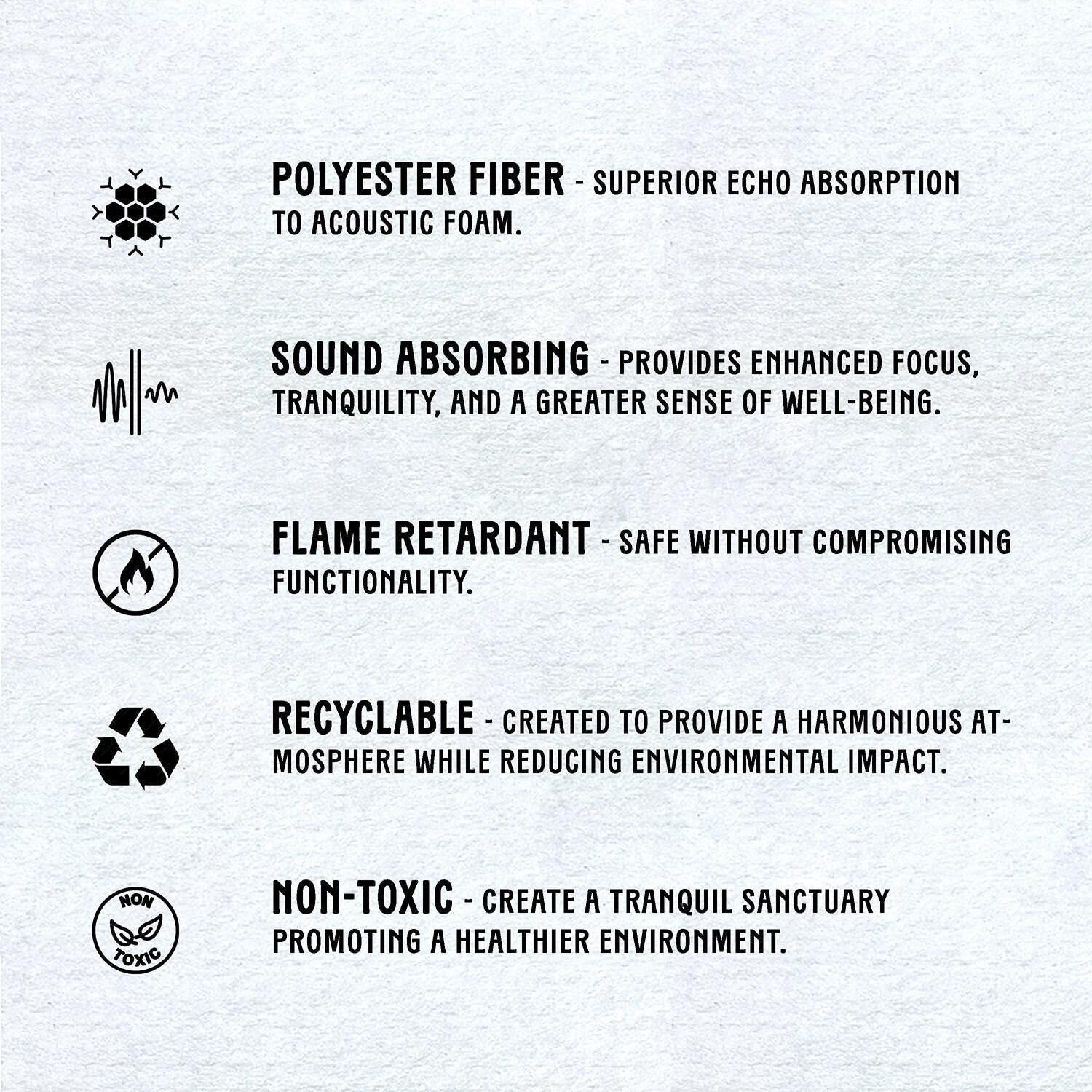 β’ π¦πππ ππ‘π ππ¨π₯ππππ: Crafted from flame-retardant materials, our sound-absorbing panels ensure superior acoustics and enhanced safety and peace of mind in any environment.