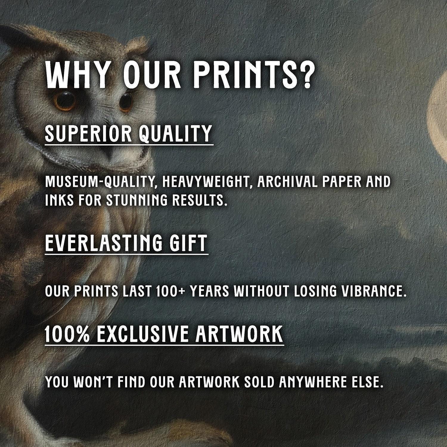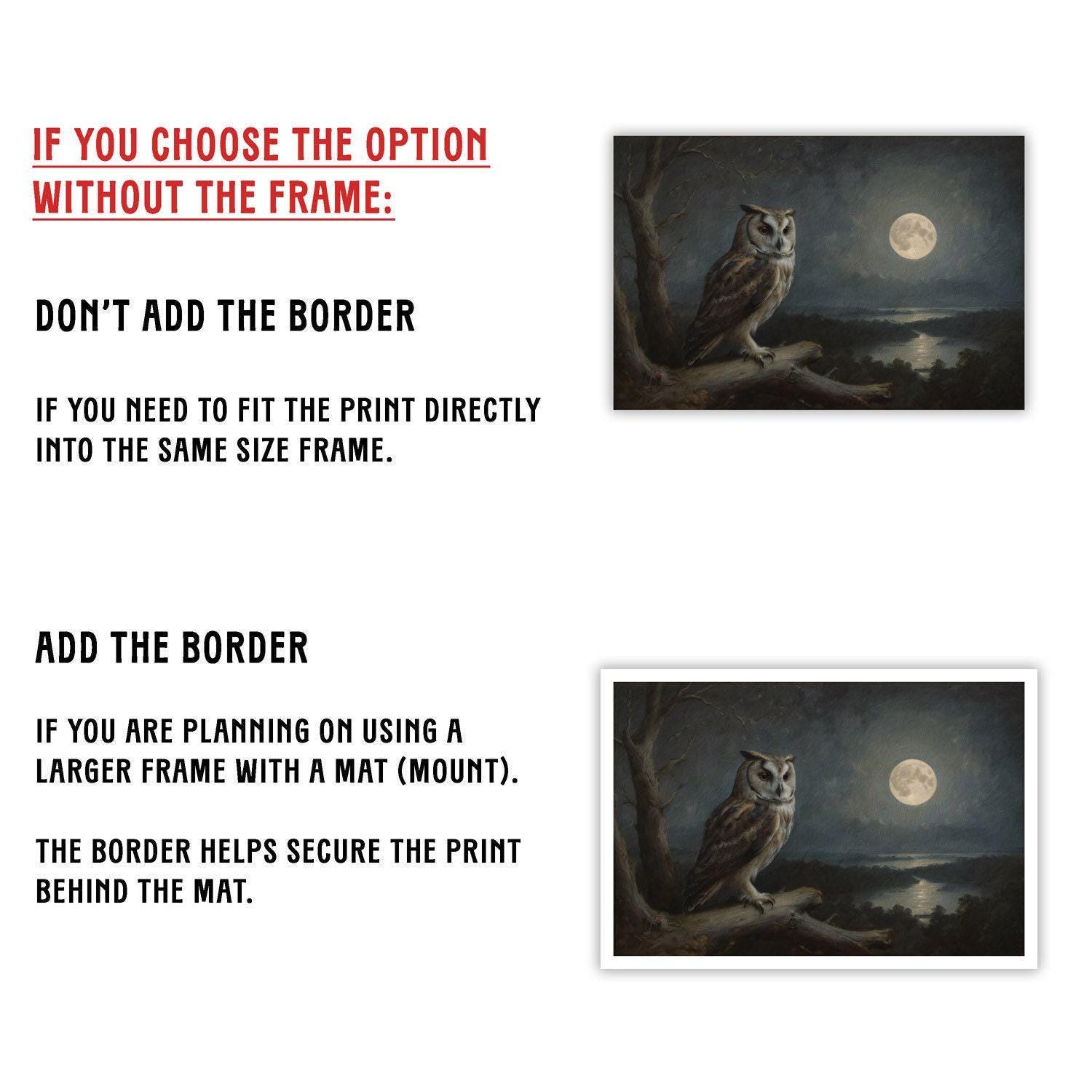 Elevate your space with this captivating full moon artwork, perfect for lovers of moody owl painting and eerie night scenes. Printed on archival paper art using museum-quality inks, this classic owl print promises lasting beauty and rich detail.