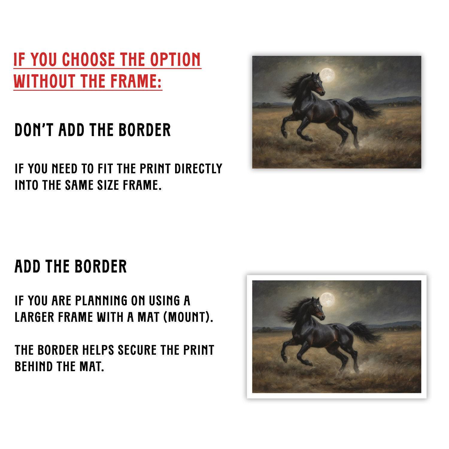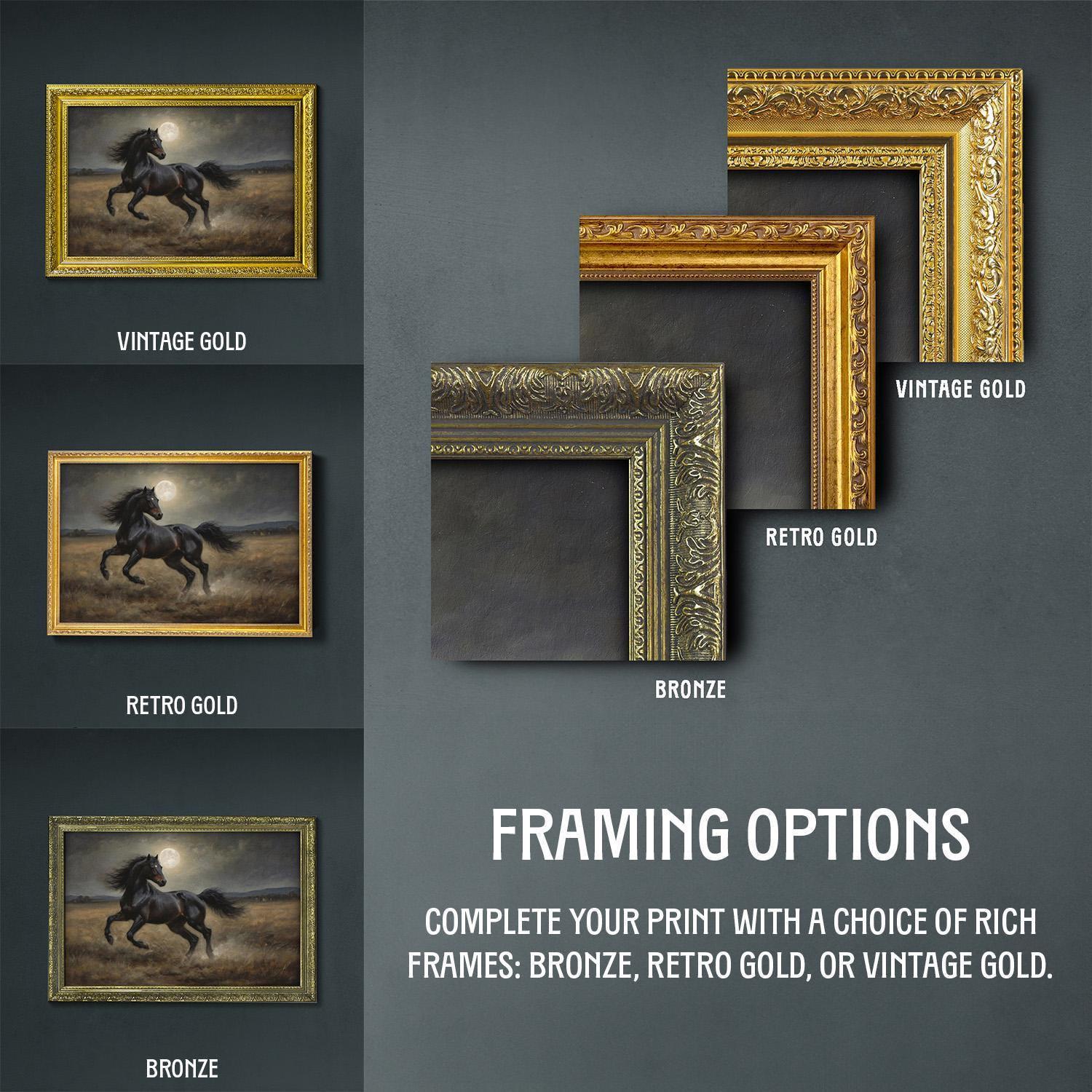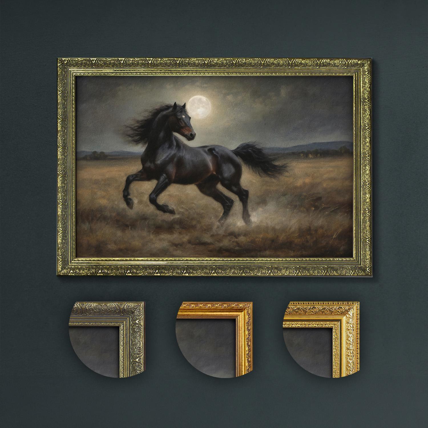 Discover the majestic black horse in moonlight, a vintage-inspired art print that brings dark academia and equestrian wall art elegance to your home.