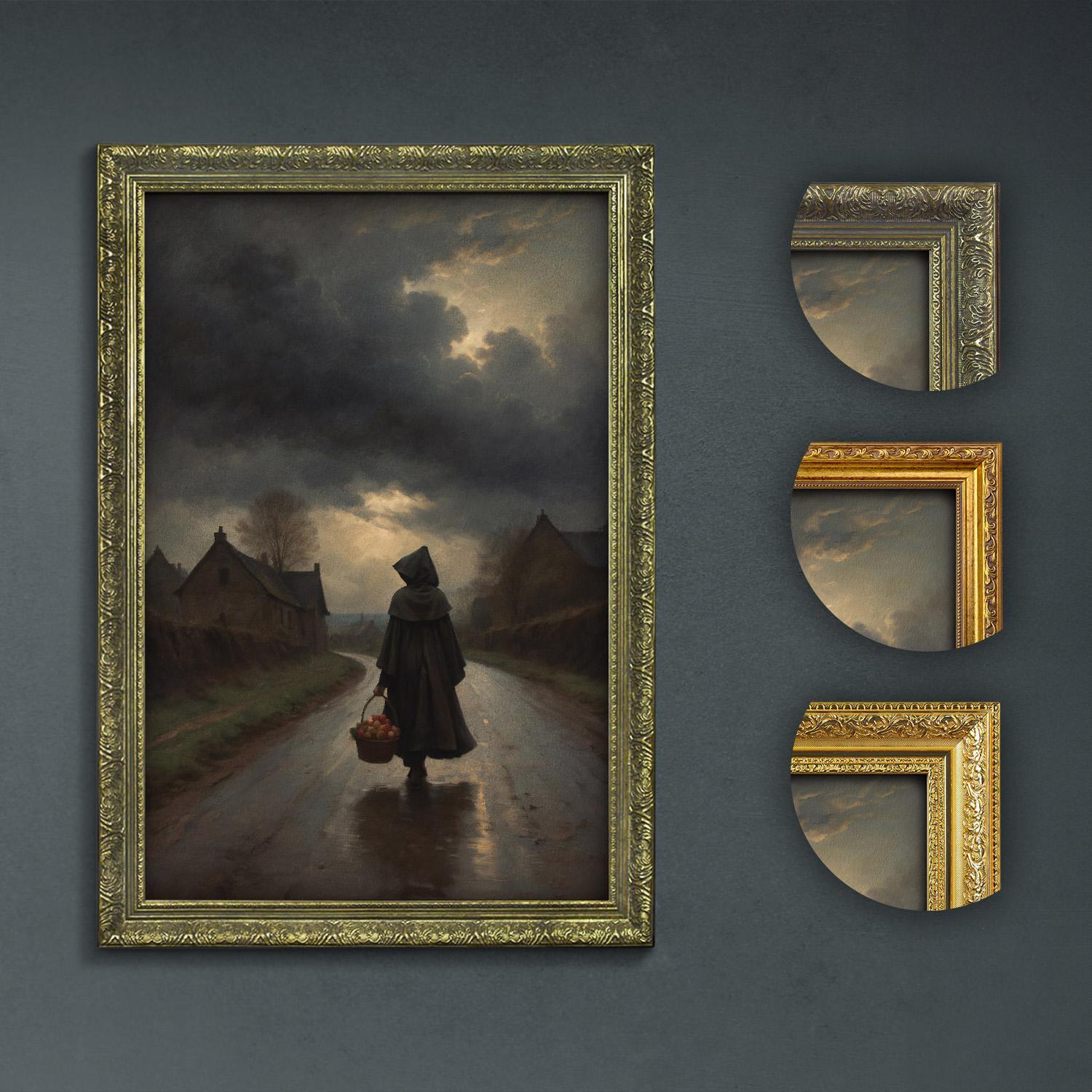Transform your space with this evocative dark academia art that beautifully captures a cloaked woman holding a lantern on a rainy night. Its vintage style and antique look bring a timeless, mysterious decor touch to any room, blending classic wall decor with eerie village art vibes.