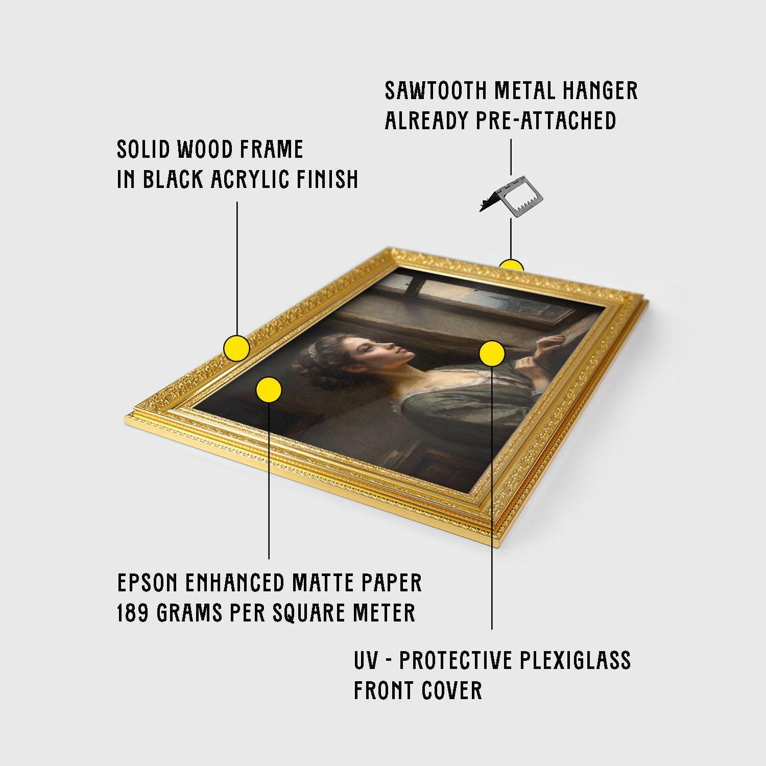 Discover the serene beauty of this reflective woman art print, blending romantic era elegance with a moody, vintage window view for timeless decor.