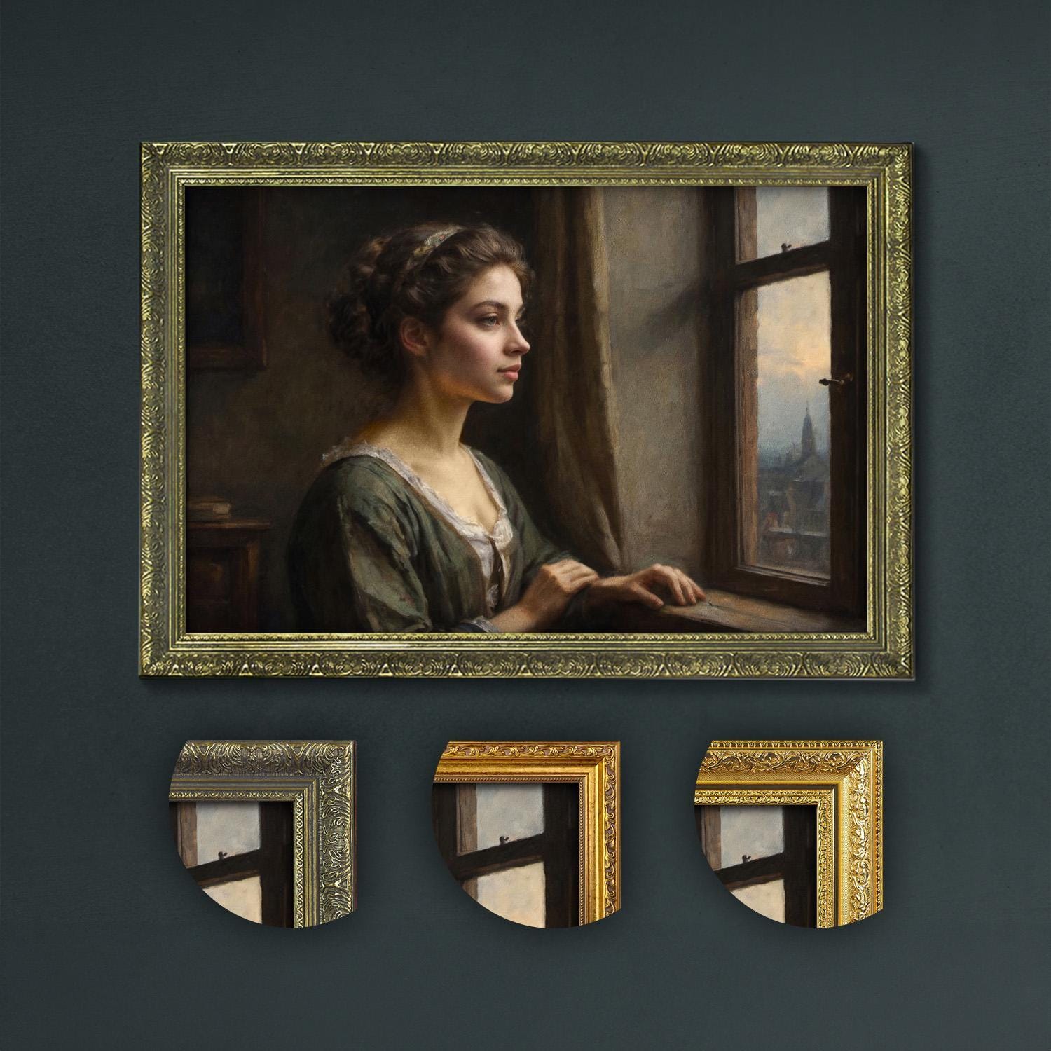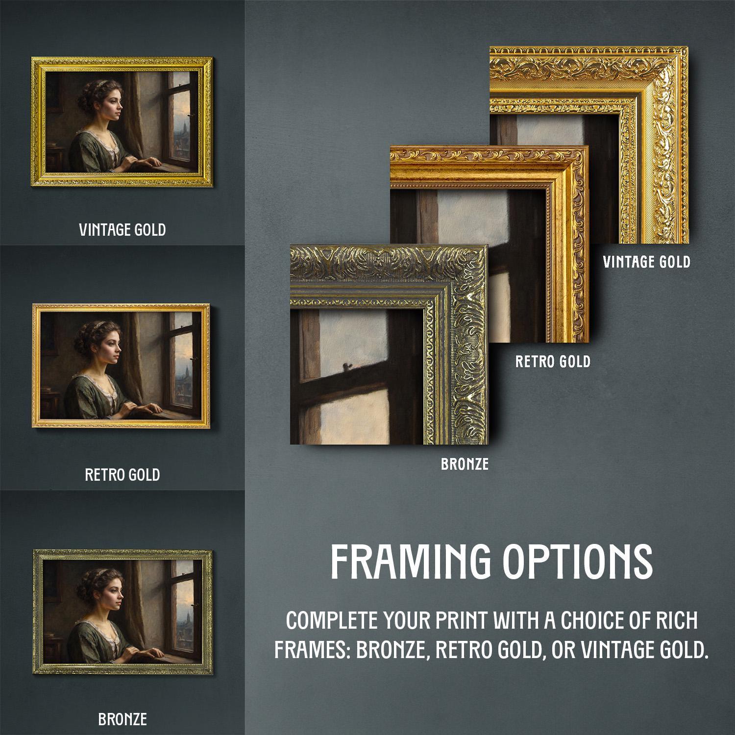 Discover the serene beauty of this reflective woman art print, blending romantic era elegance with a moody, vintage window view for timeless decor.