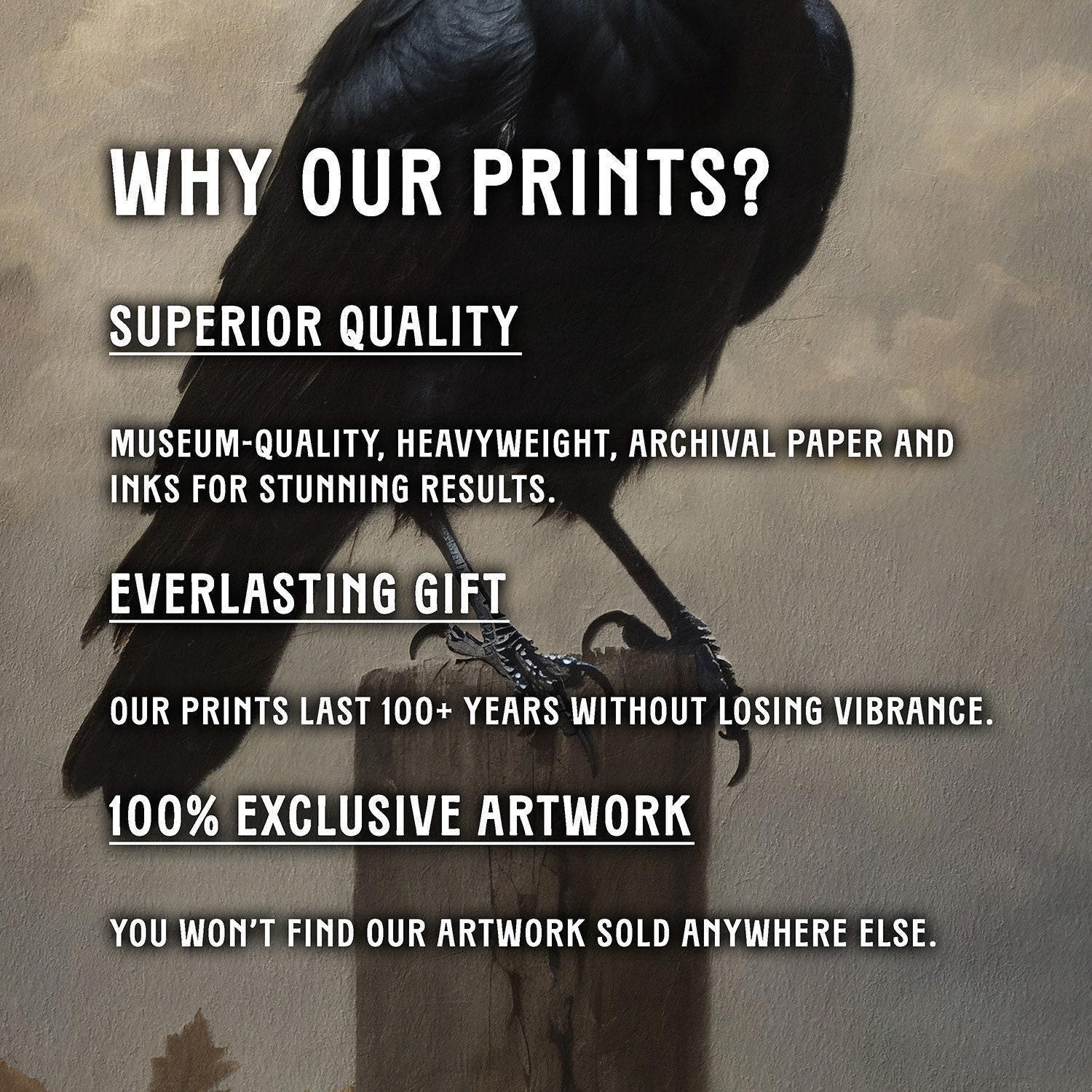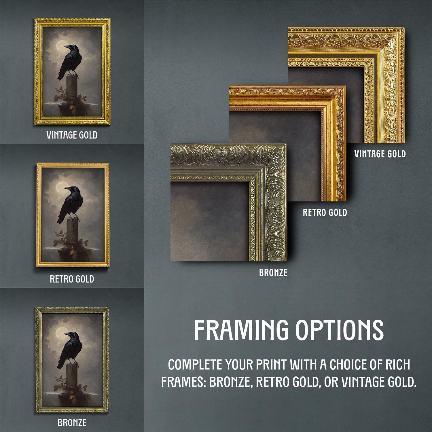 This exquisite artful print blends nostalgic scholarly elegance with gothic raven mystique, printed on luxurious archival paper using museum-quality inks for a timeless, fade-resistant finish. Whether you're enhancing your personal space or searching for a unique dark academia gift, this piece offers a captivating focal point that complements vintage gold frame, retro gold art, or bronze frame print options.