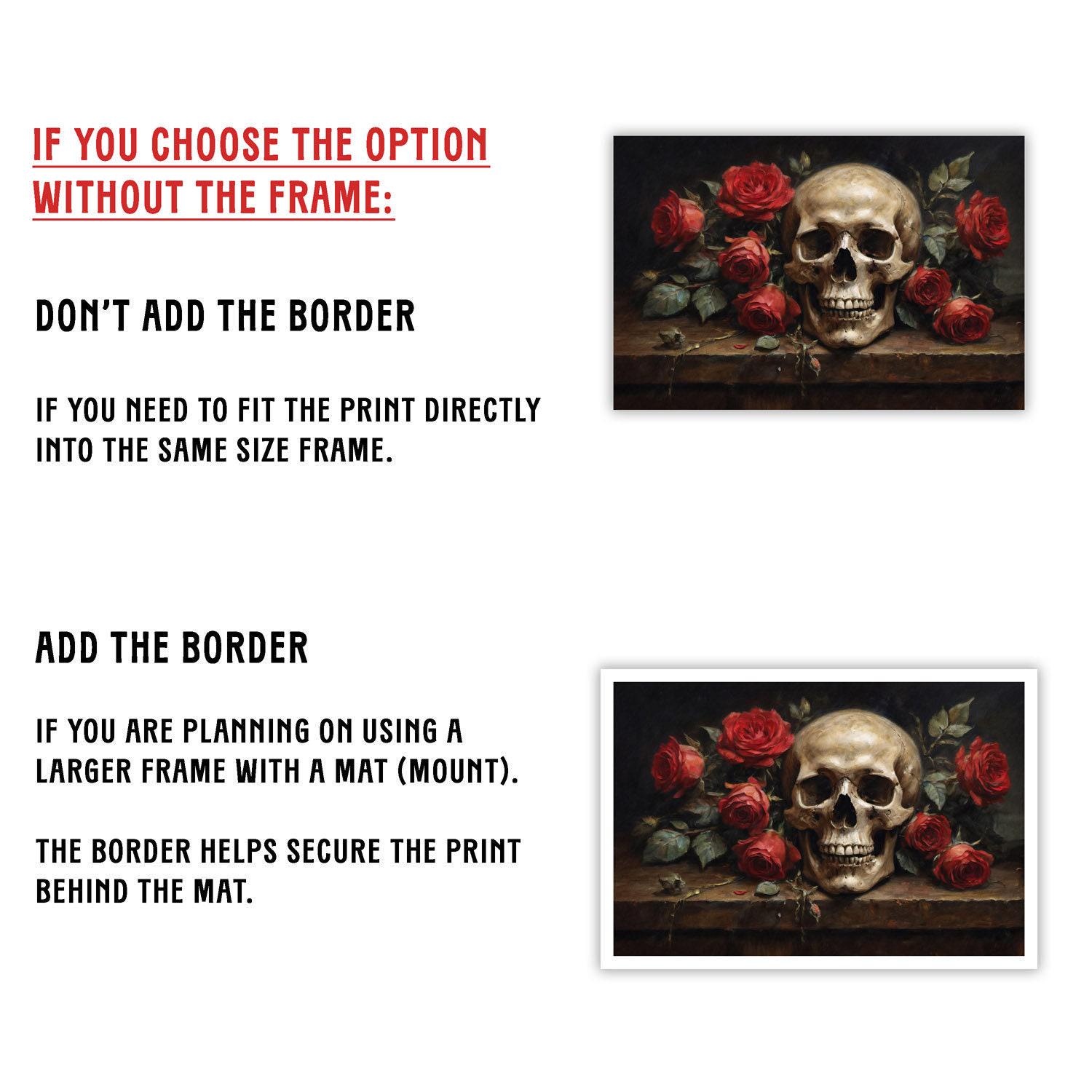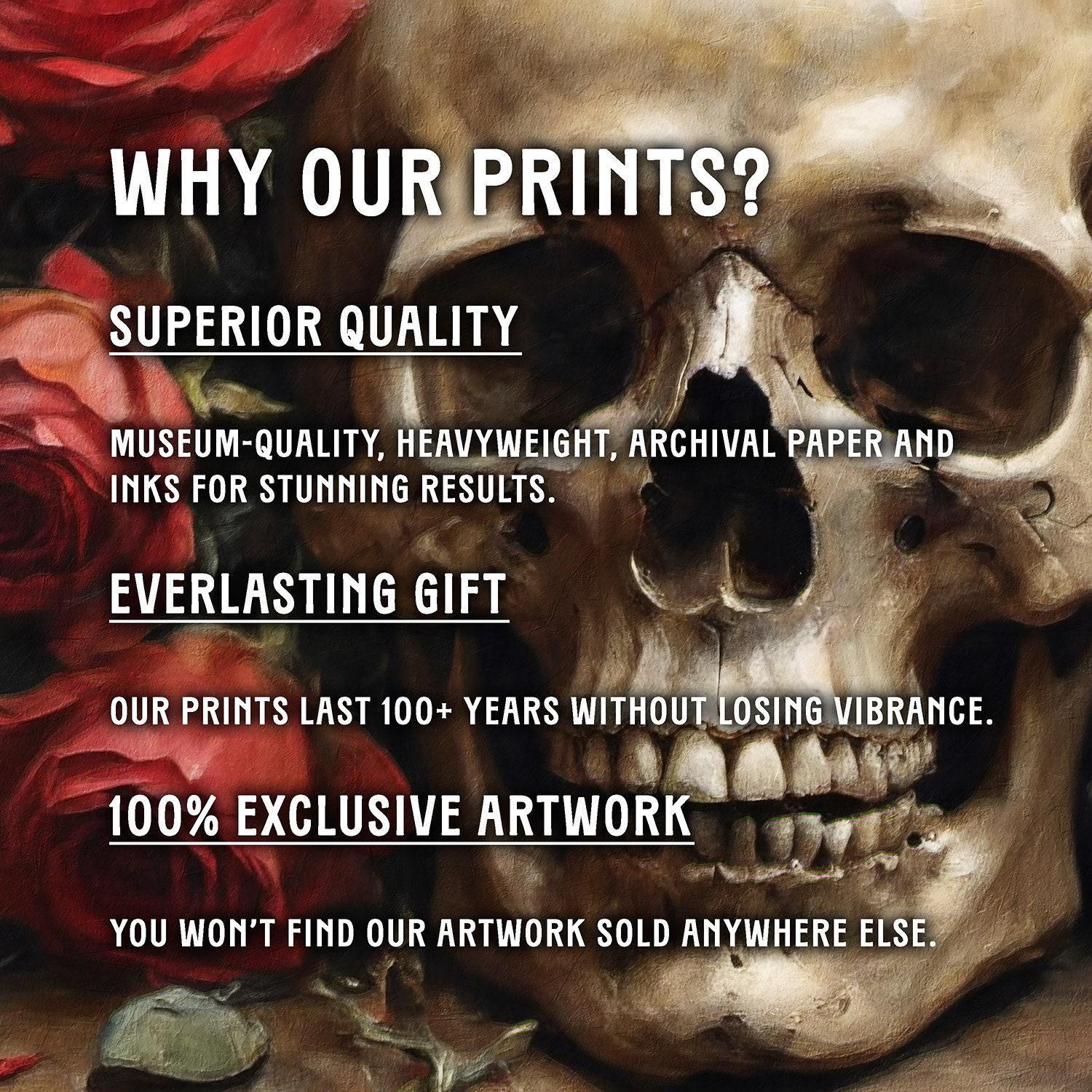 This exquisite art print captures the timeless allure of antique skull print aesthetics with lush, dark roses that evoke a mysterious and luxurious wall art vibe. Ideal for adding a moody, sophisticated touch to any space, this piece embodies the essence of dark academia artful style.