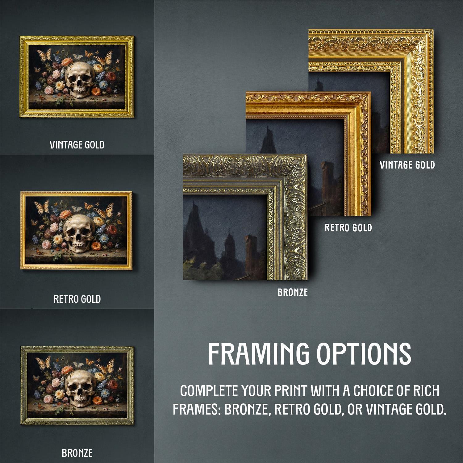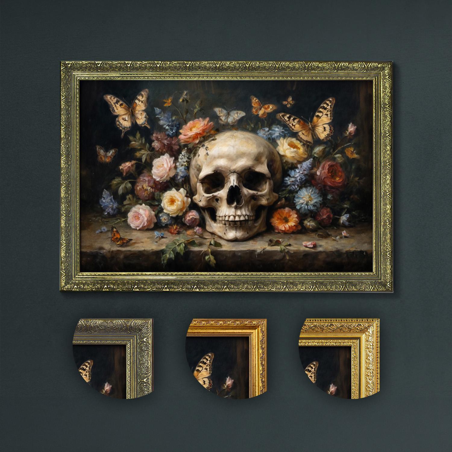 Immerse yourself in moody dark art and dark academia decor with this captivating skull and butterflies print, framed in vintage gold, retro gold, or bronze for timeless charm.
