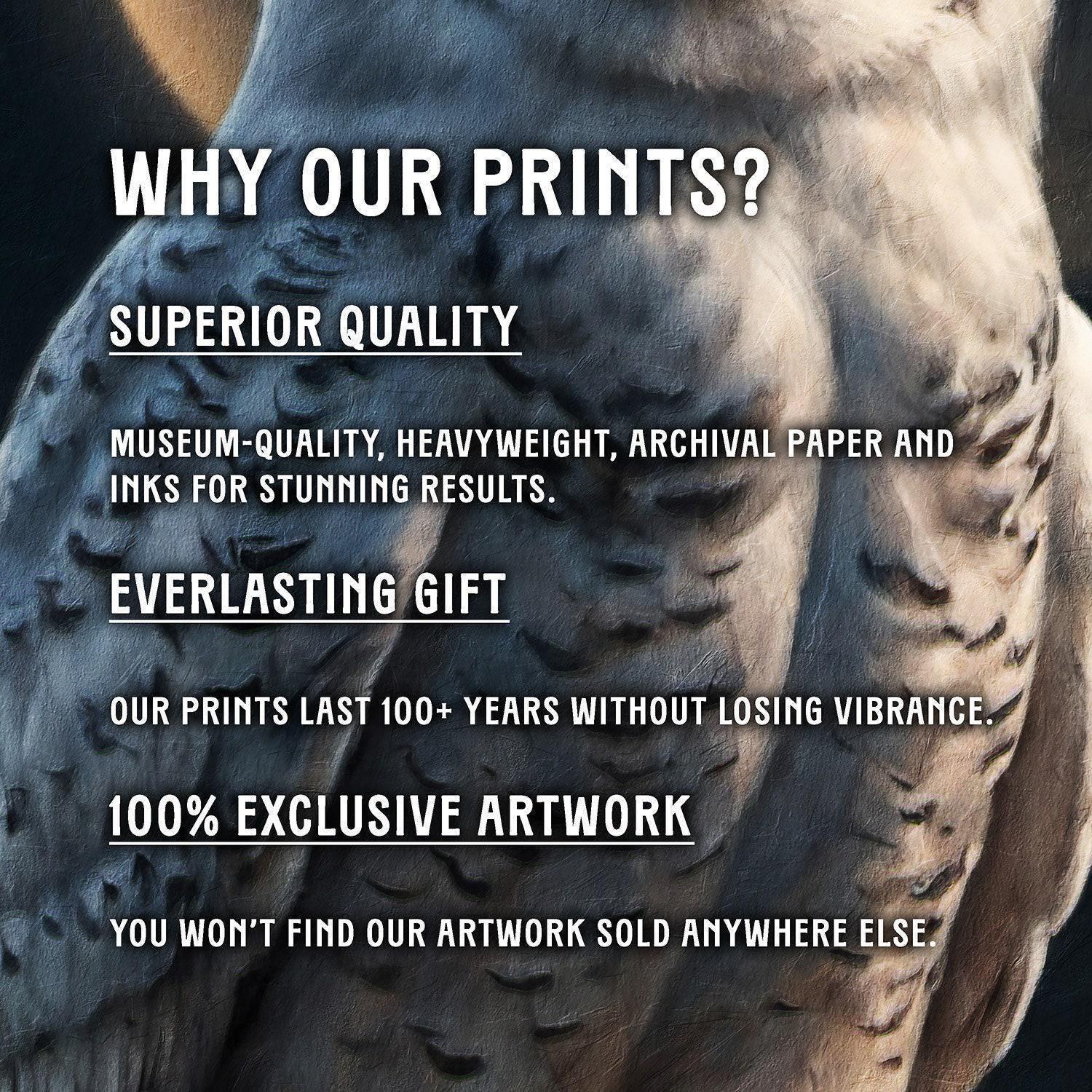 Our art prints are produced on museum-quality paper using archival inks to guarantee they last a lifetime without fading or losing color.