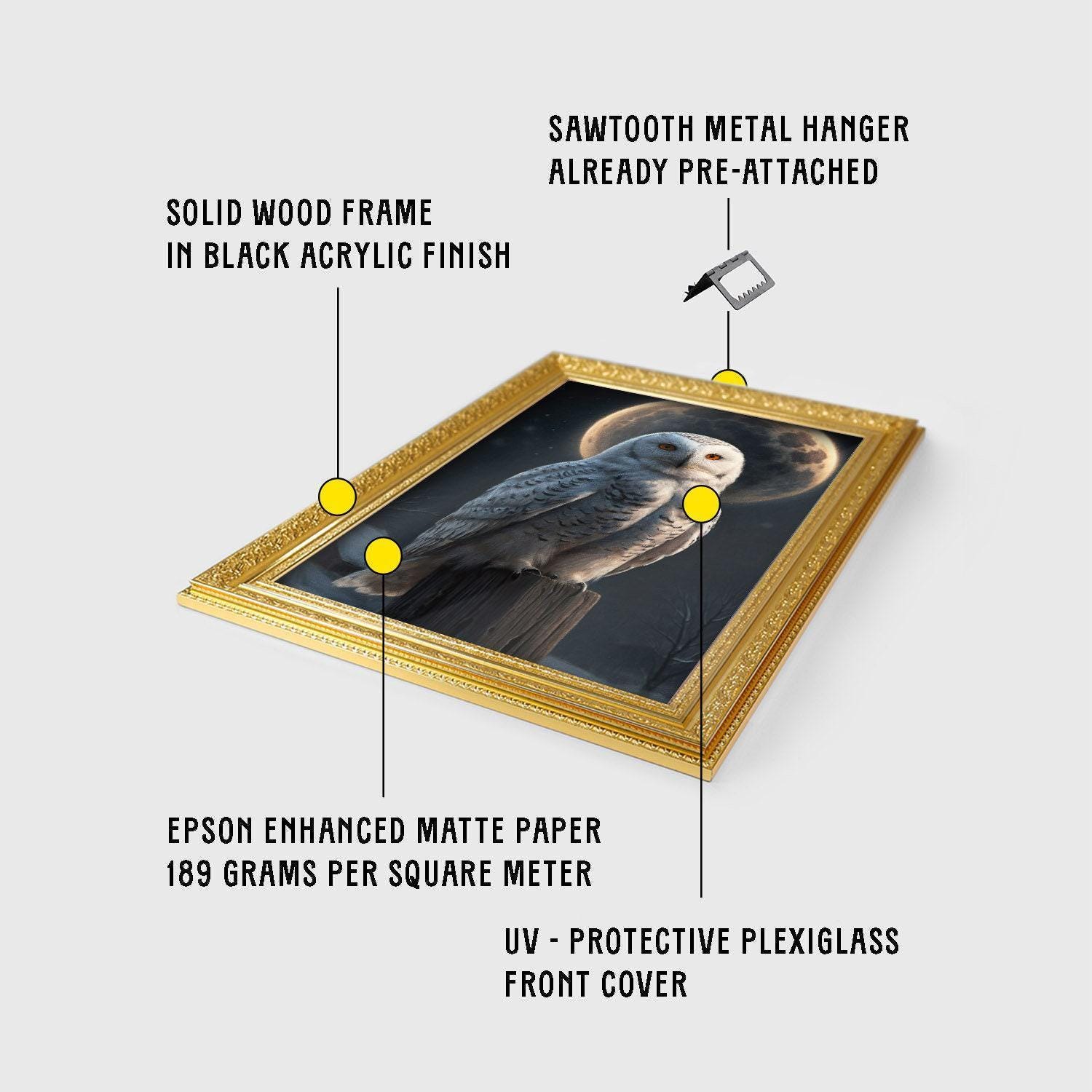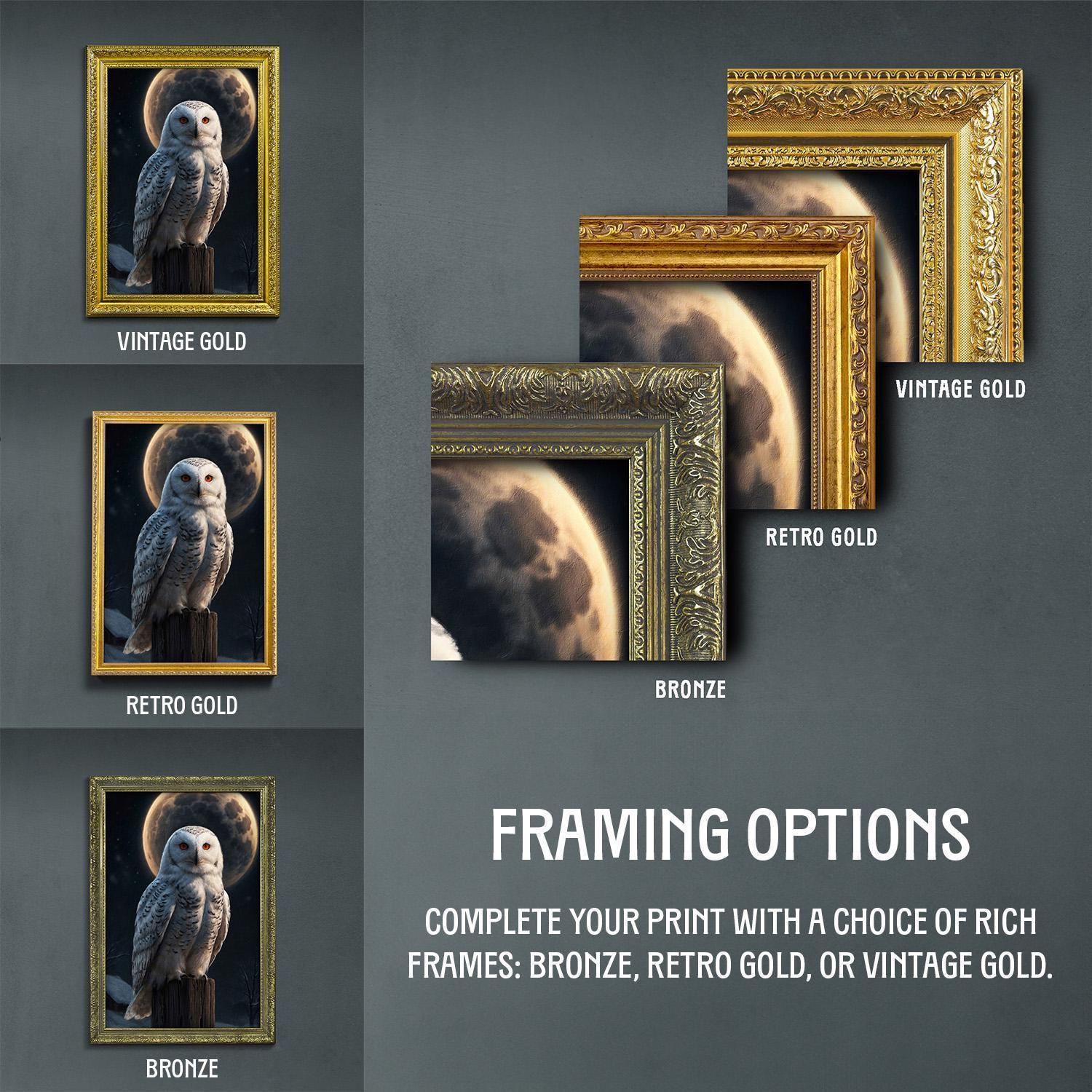 Elevate your space with this captivating snowy owl moon wall print, expertly crafted to blend vintage style with a moody witchy decor vibe. Framed in your choice of bronze, retro gold, or vintage gold, this artful print adds timeless charm and nostalgic wall art appeal to any room.