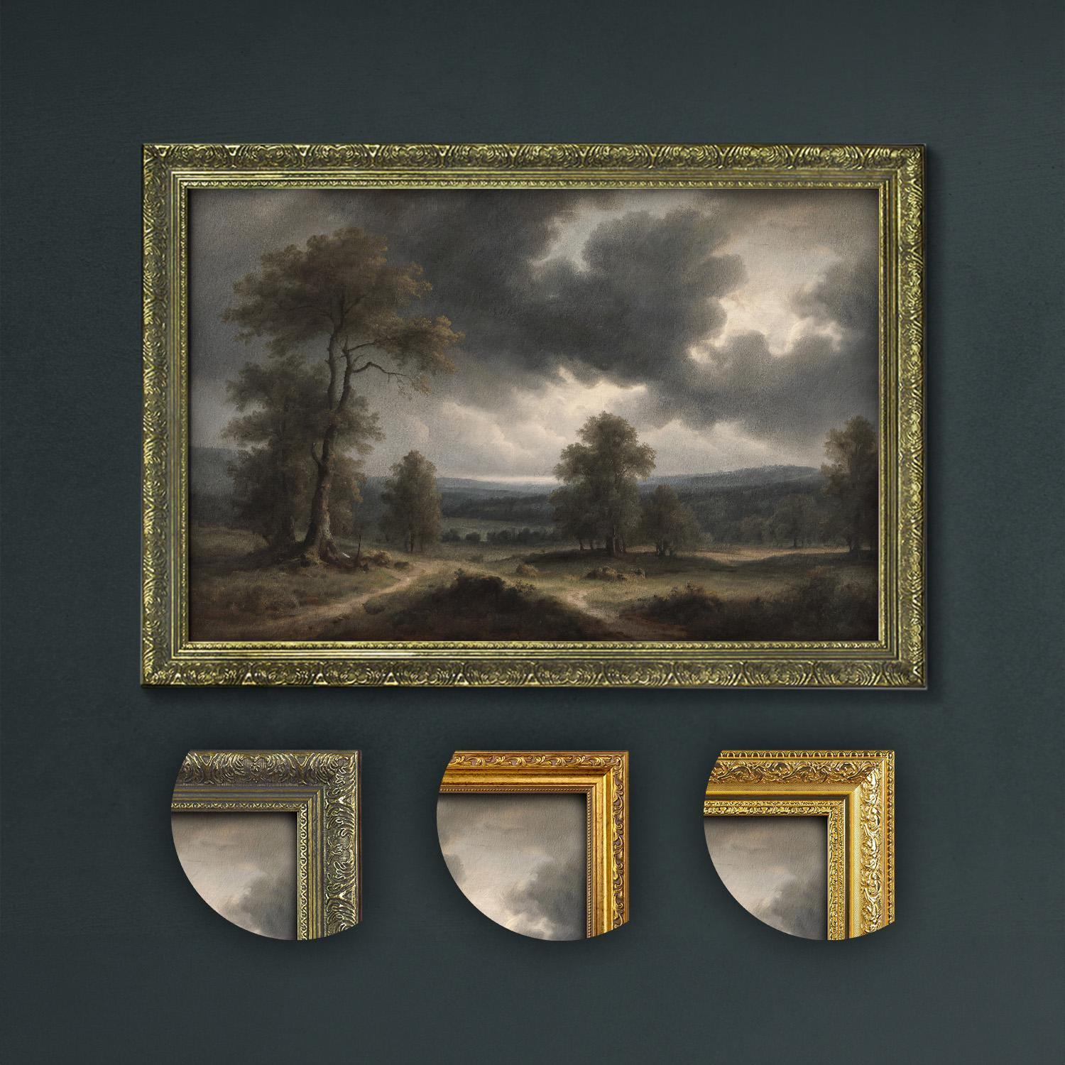 Experience the stormy landscape with dark sky over tranquil fields in this dramatic clouds art print, perfect for moody, atmospheric wall art and dark academia decor.