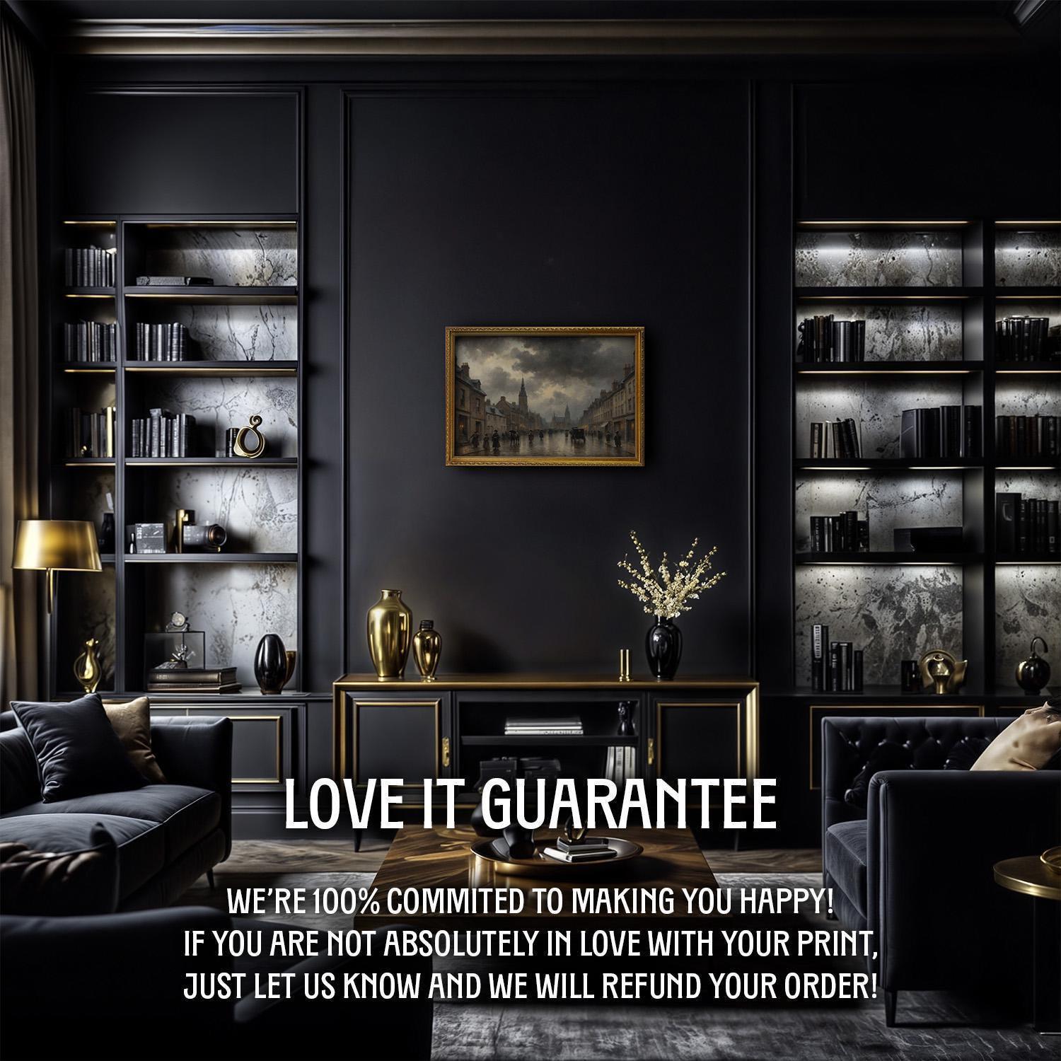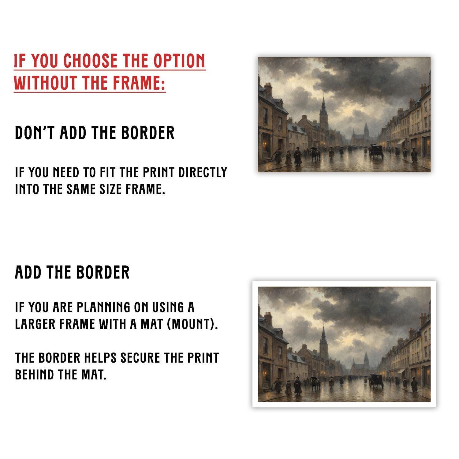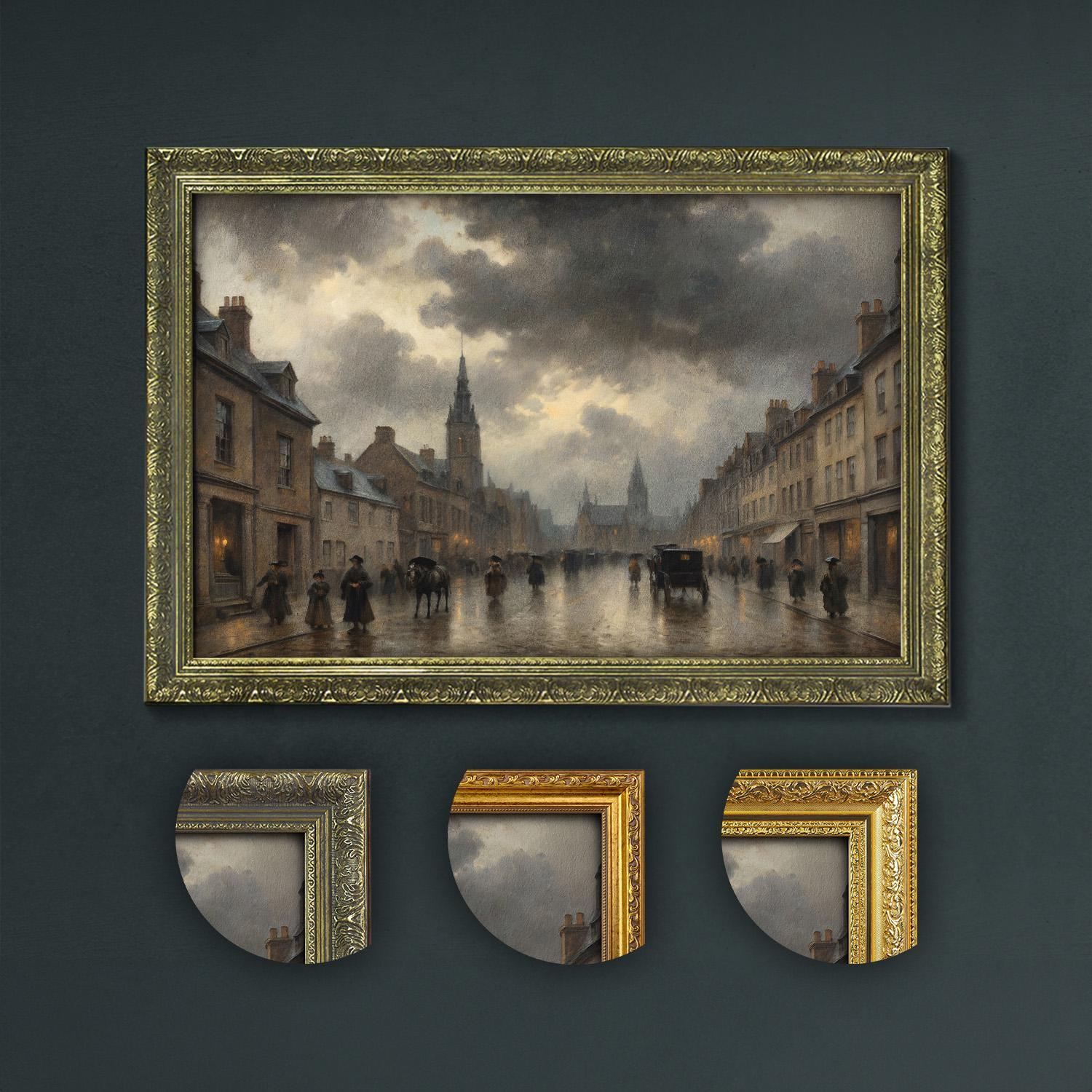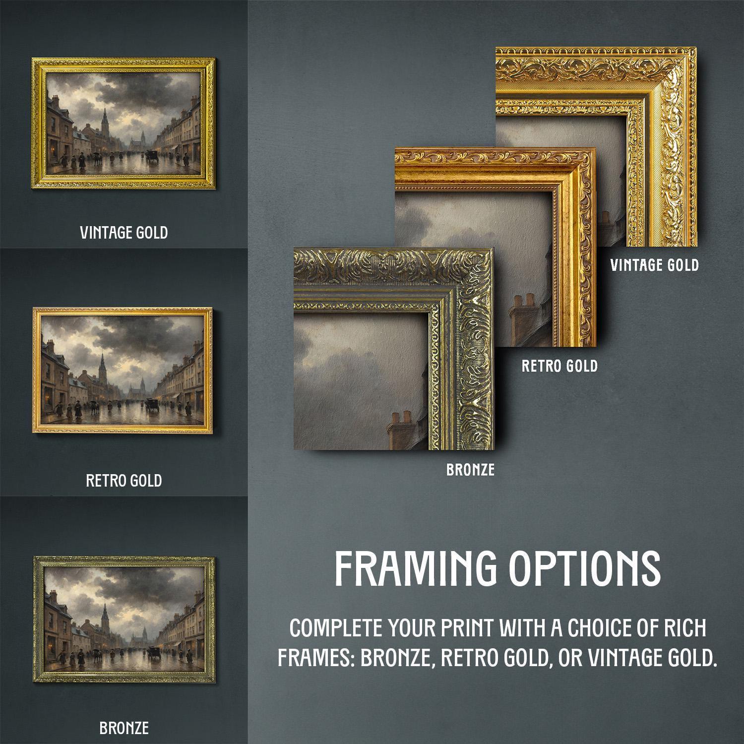 Step into a rainy street scene with this dark academia art print, where vintage town charm meets romantic urban decor on museum-quality archival paper.