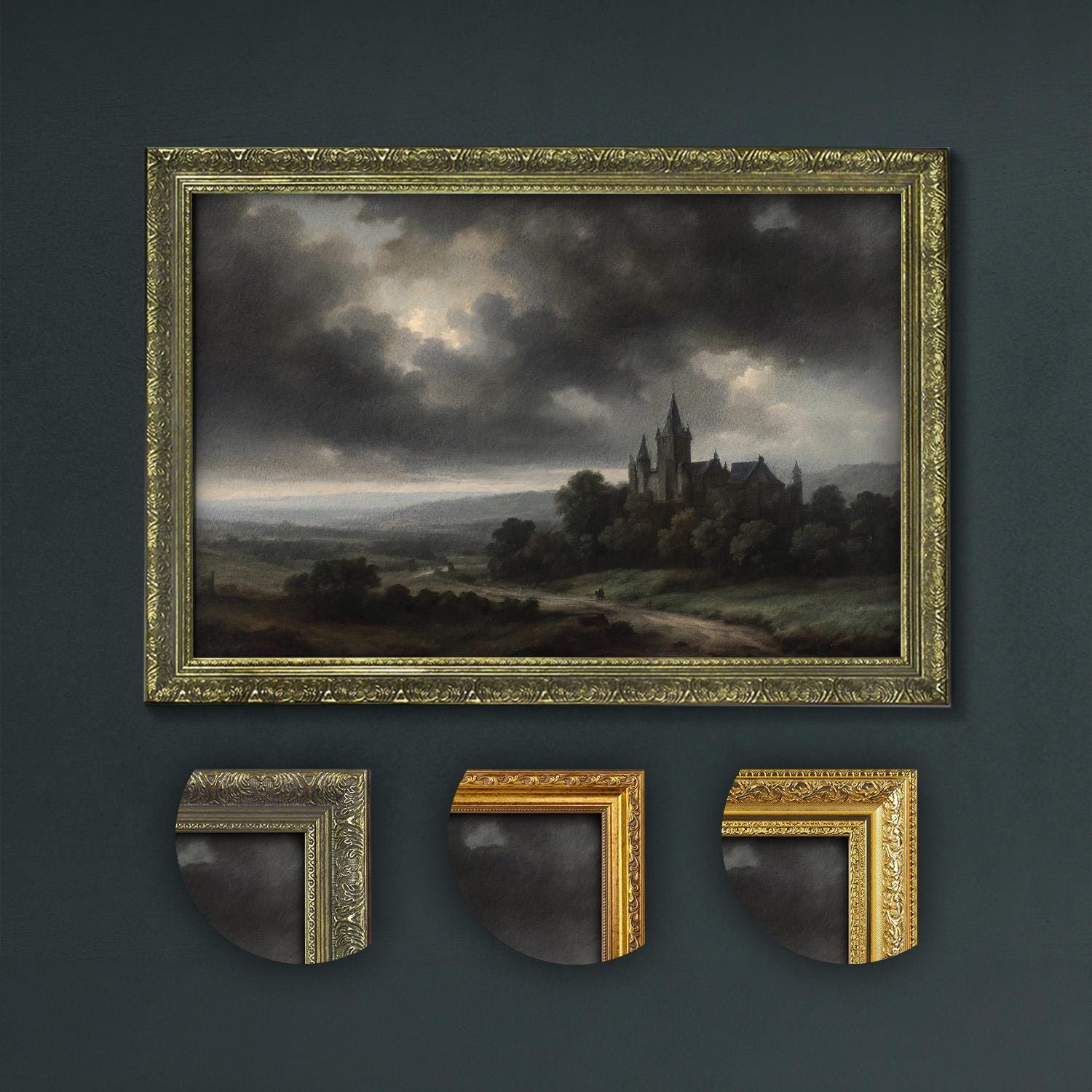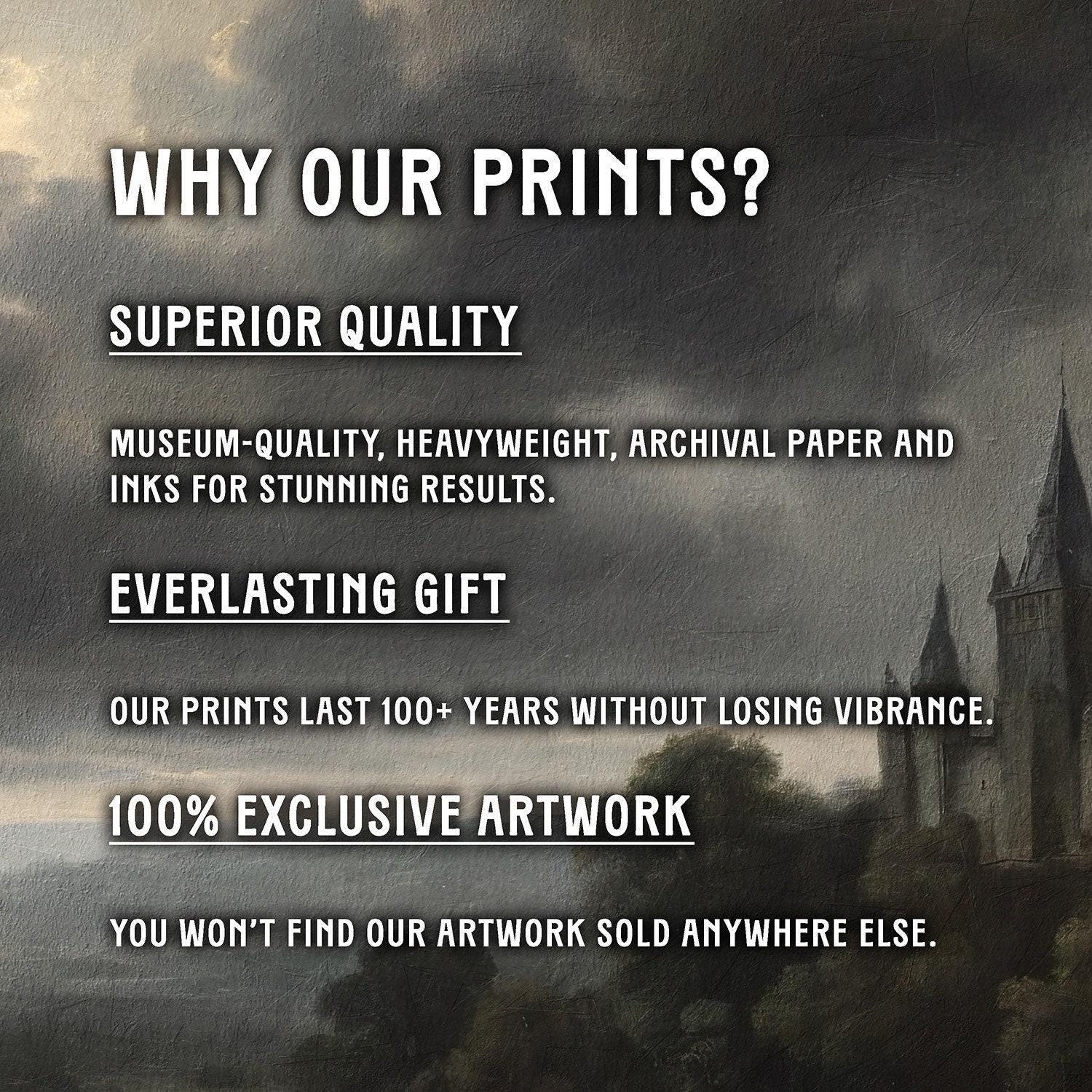 Step into the enchanting world of dark academia with this majestic gothic castle art print, featuring a stormy landscape and moody sky artwork that brings vintage castle decor and atmospheric home art to life.