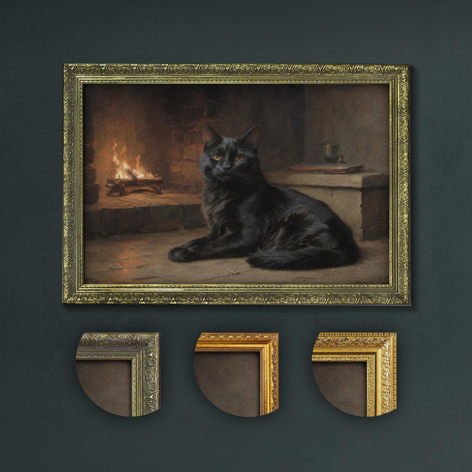 Experience the serene charm of a black cat lounging by the fireplace, blending cozy cat art and elegant feline art to enrich your dark academia home decor.