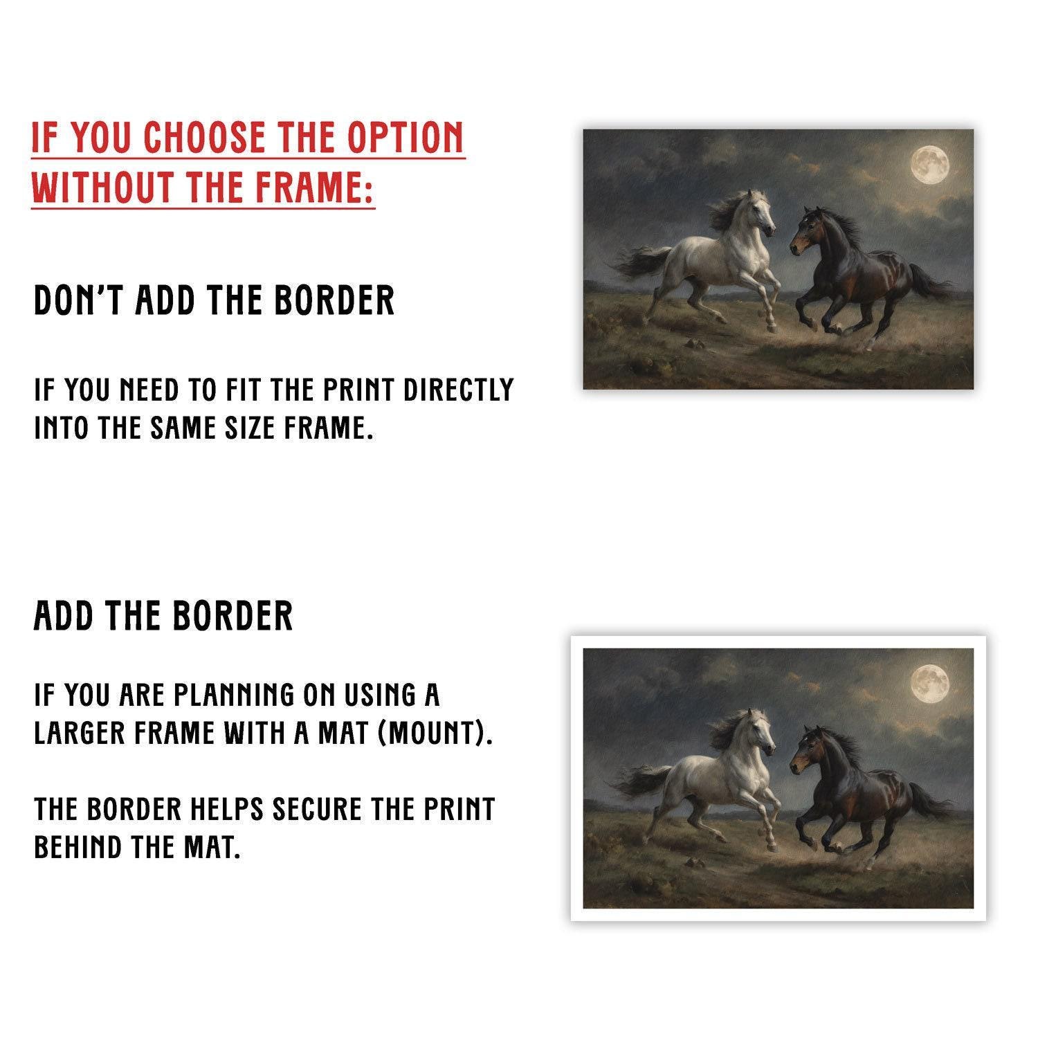 Step into a moonlit gallop where majestic horses race beneath a glowing full moon, perfect for lovers of gothic horse print and dark equestrian art.