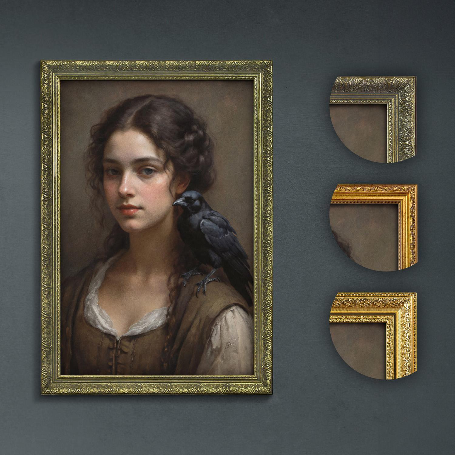 Elevate your home or office with this mysterious lady art that beautifully merges classic portraiture with dark academia artful style. This dramatic portrait features a timeless renaissance style woman paired with a striking raven, creating an antique style decor piece that draws the eye and sparks conversation.