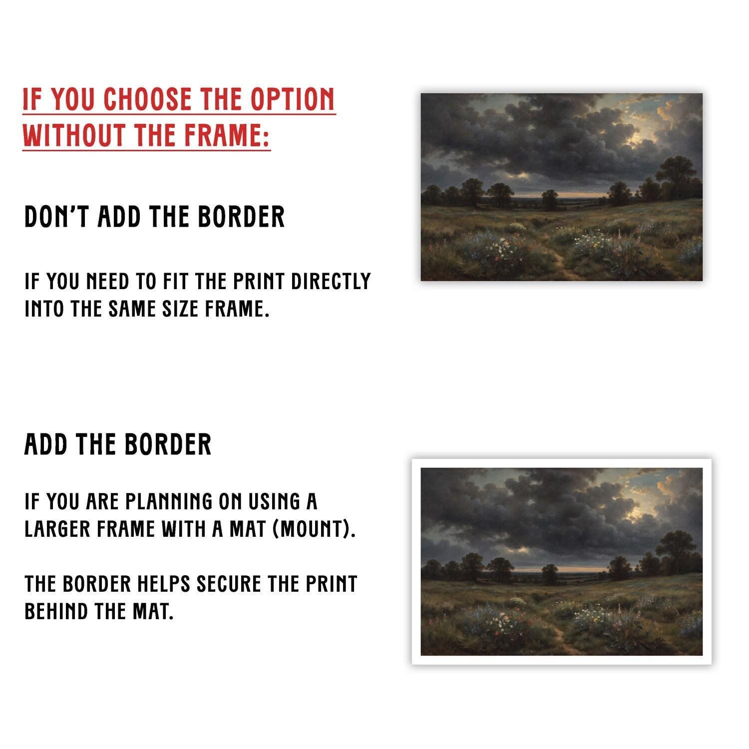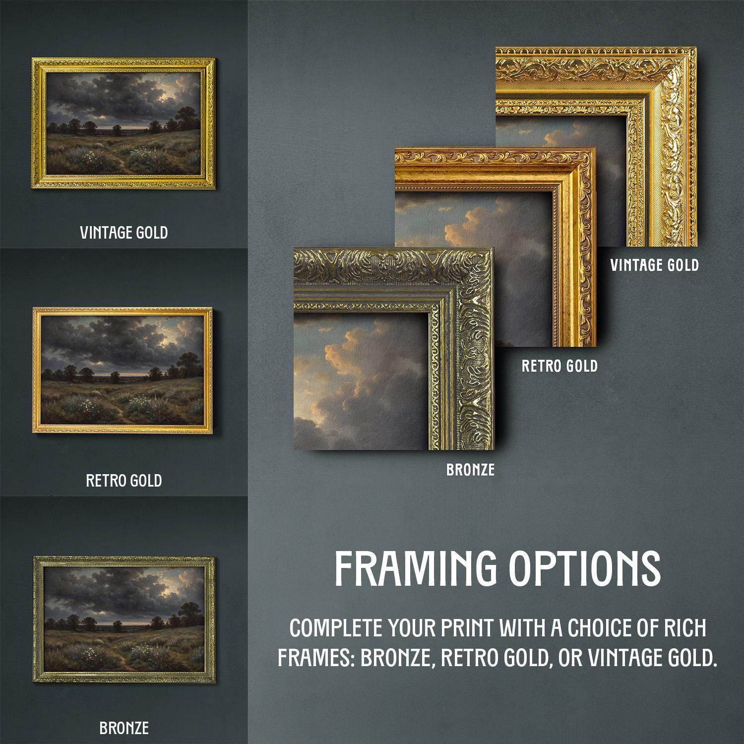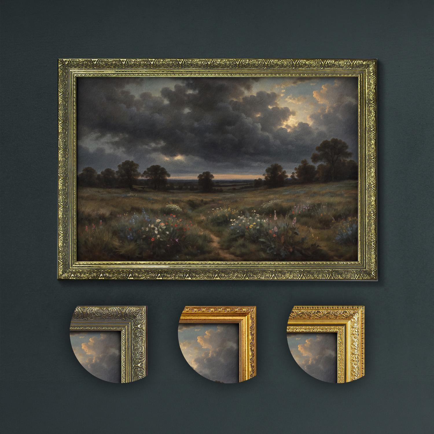 Step into a dark academia twilight landscape where stormy skies meet wildflowers, creating a gothic flower print that adds moody, vintage charm to your natural wall decor.