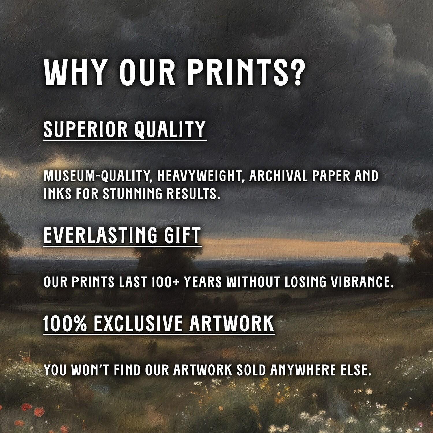 Our art prints are produced on museum-quality paper using archival inks to guarantee they last a lifetime without fading or losing color.