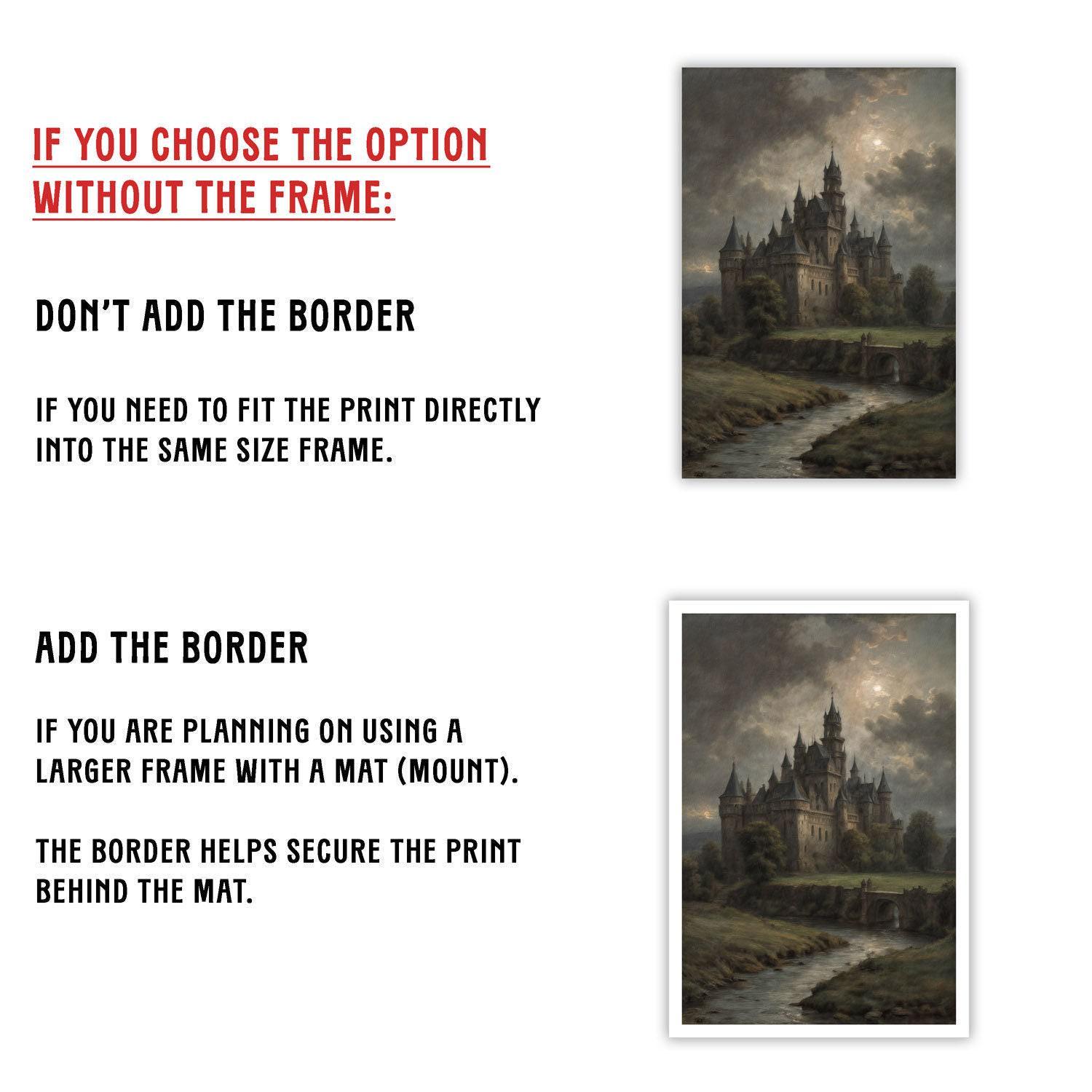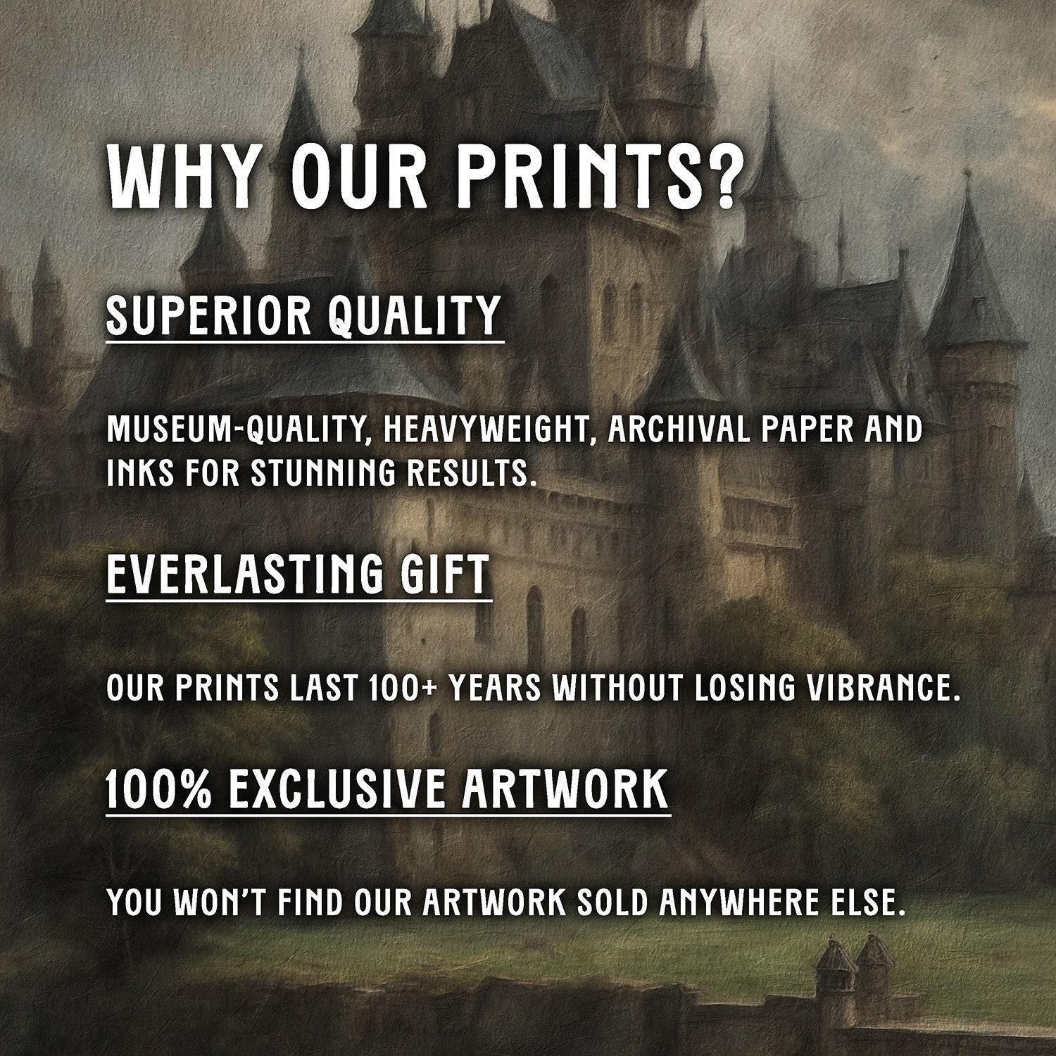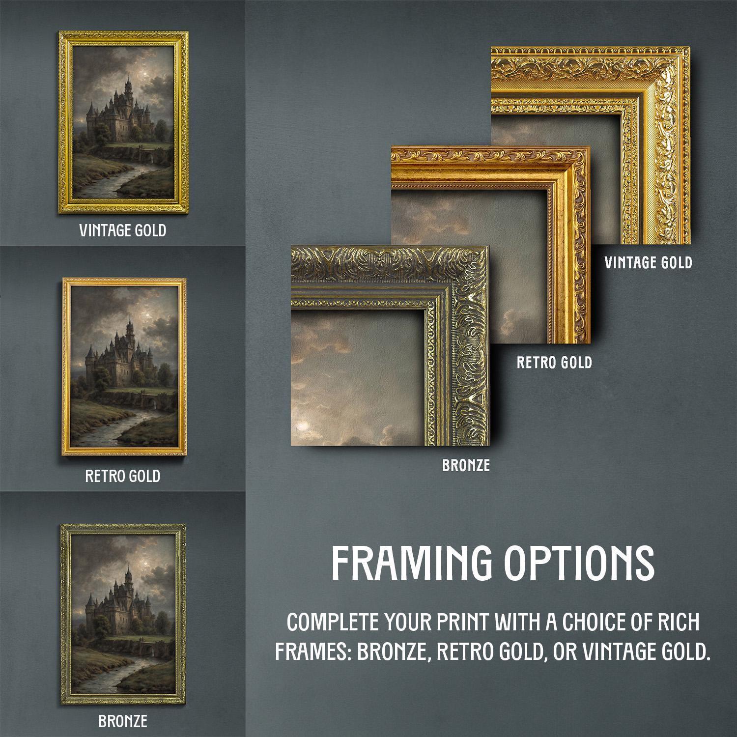 Elevate your home or office with this captivating artful print, showcasing a mysterious castle bathed in moonlight. Printed on heavy archival paper with museum-quality inks, this luxurious art print offers lasting beauty and timeless scholarly elegance. Choose from three exquisite frame optionsβbronze frame art, retro gold frame, or vintage gold frameβto perfectly match your unique style.