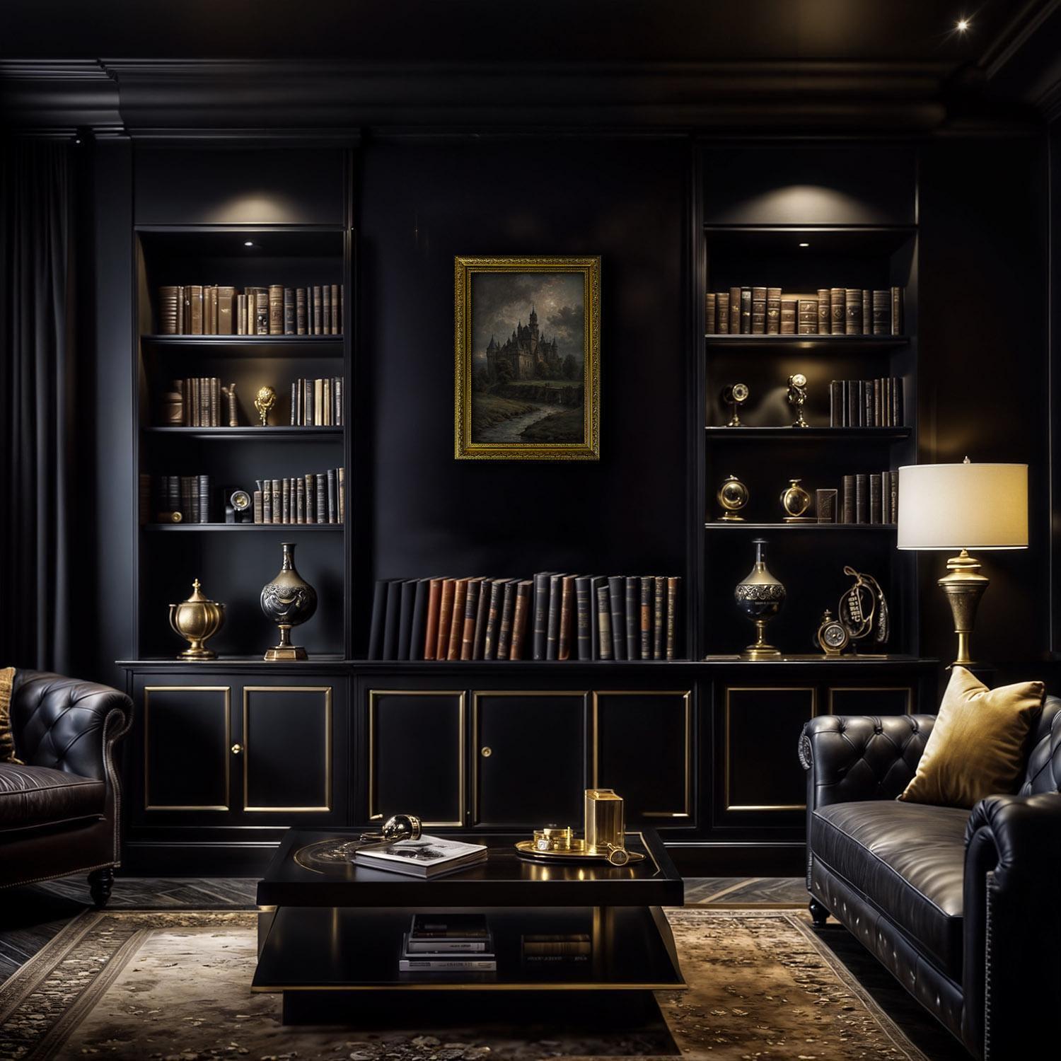 Transform your space with moody dark wall art featuring a castle under the moon, blending dark academia decor and dark witchy vibes for an enchanting touch.