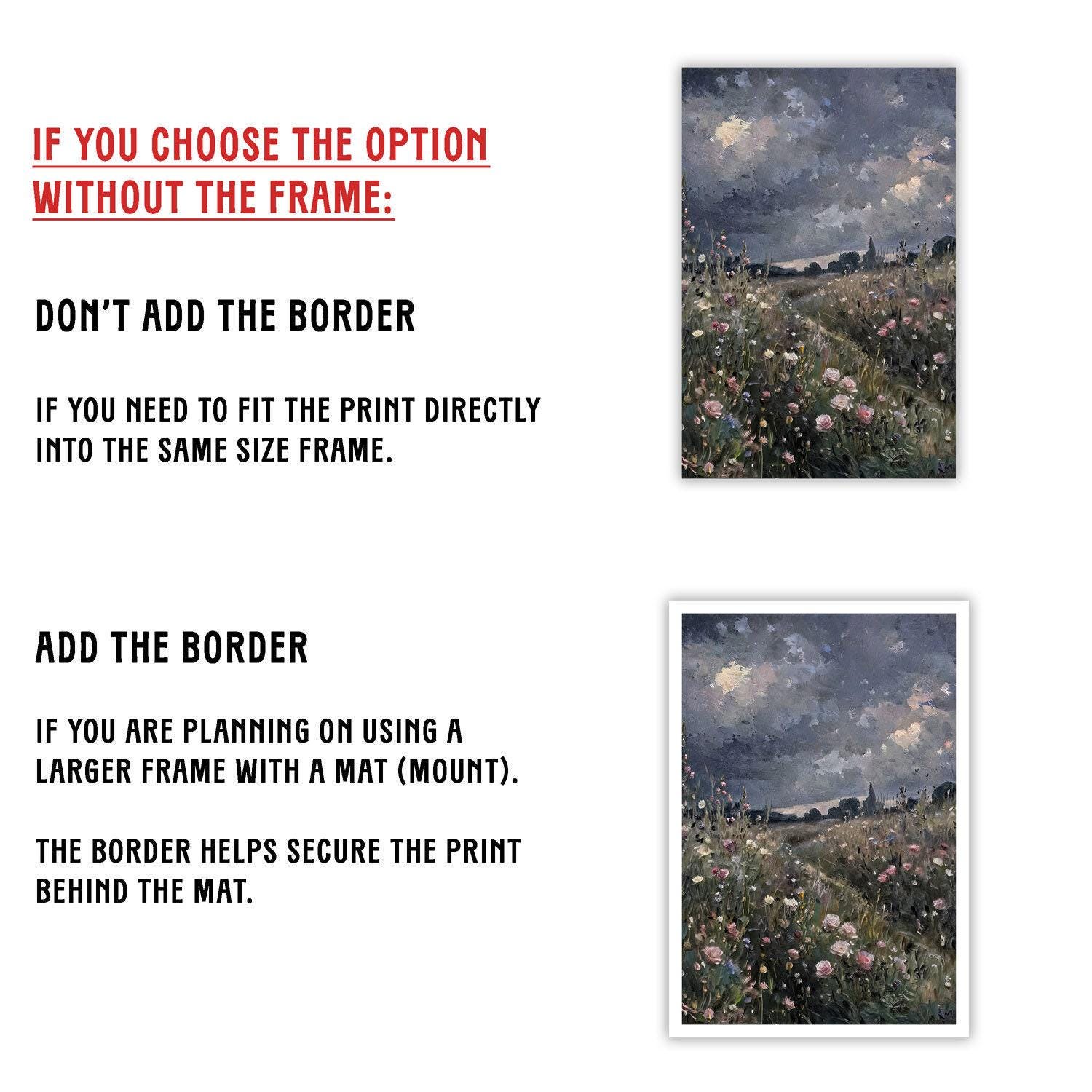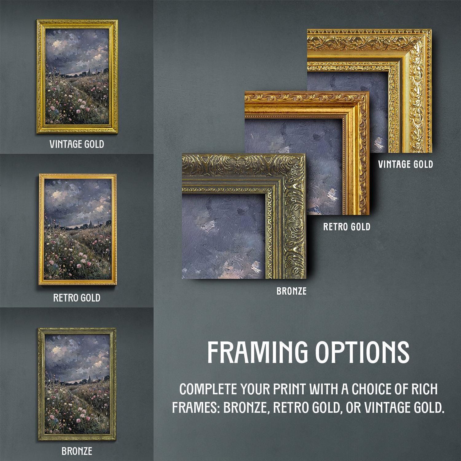 Step into a timeless flower field painting where a path winds through lush blooming flowers beneath a moody sky, perfect for chic wall art and academic decor.