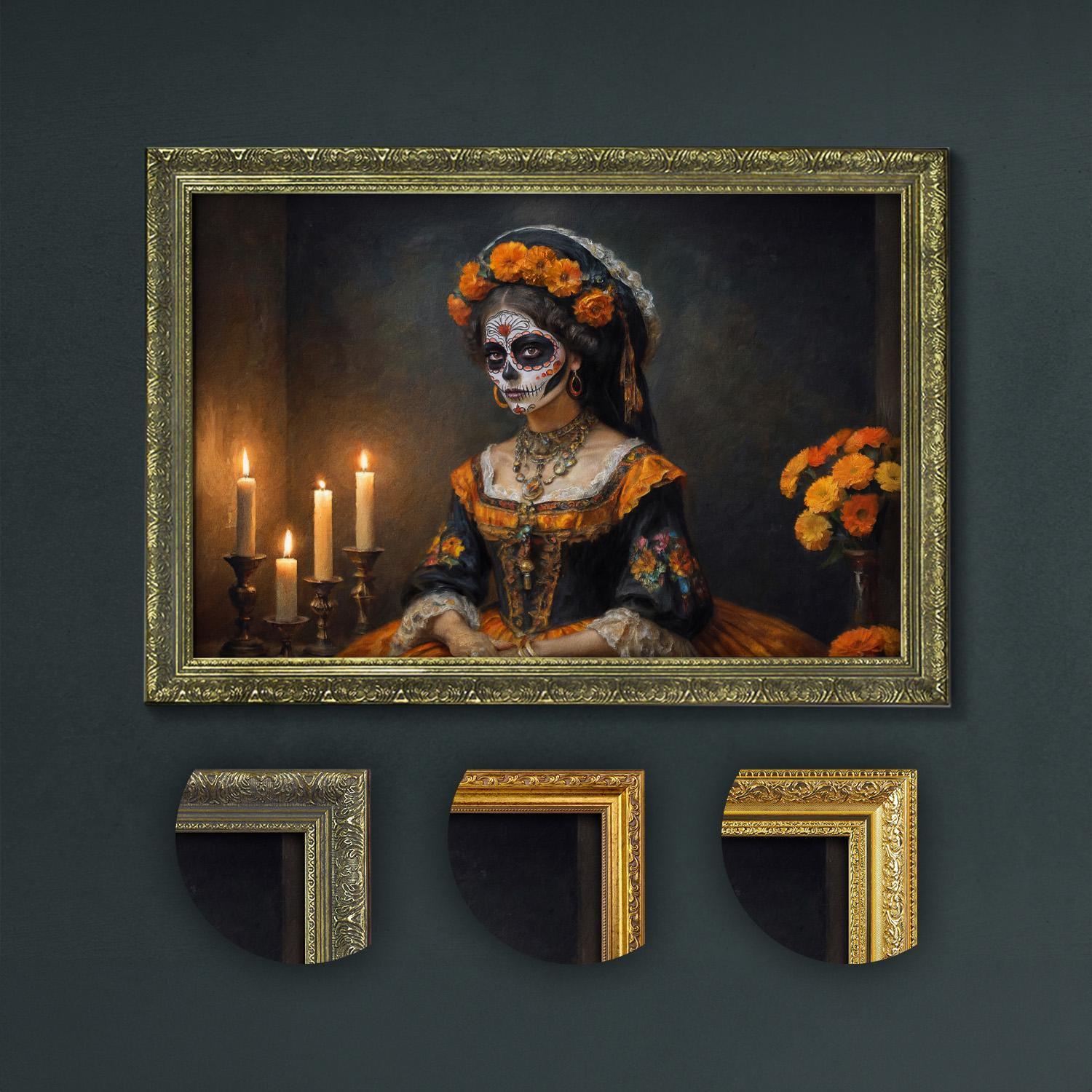 Celebrate the haunting beauty of elegant Day of the Dead art with Catrina and candles, blending traditional Mexican Dia de Los Muertos and gothic dark academia decor.