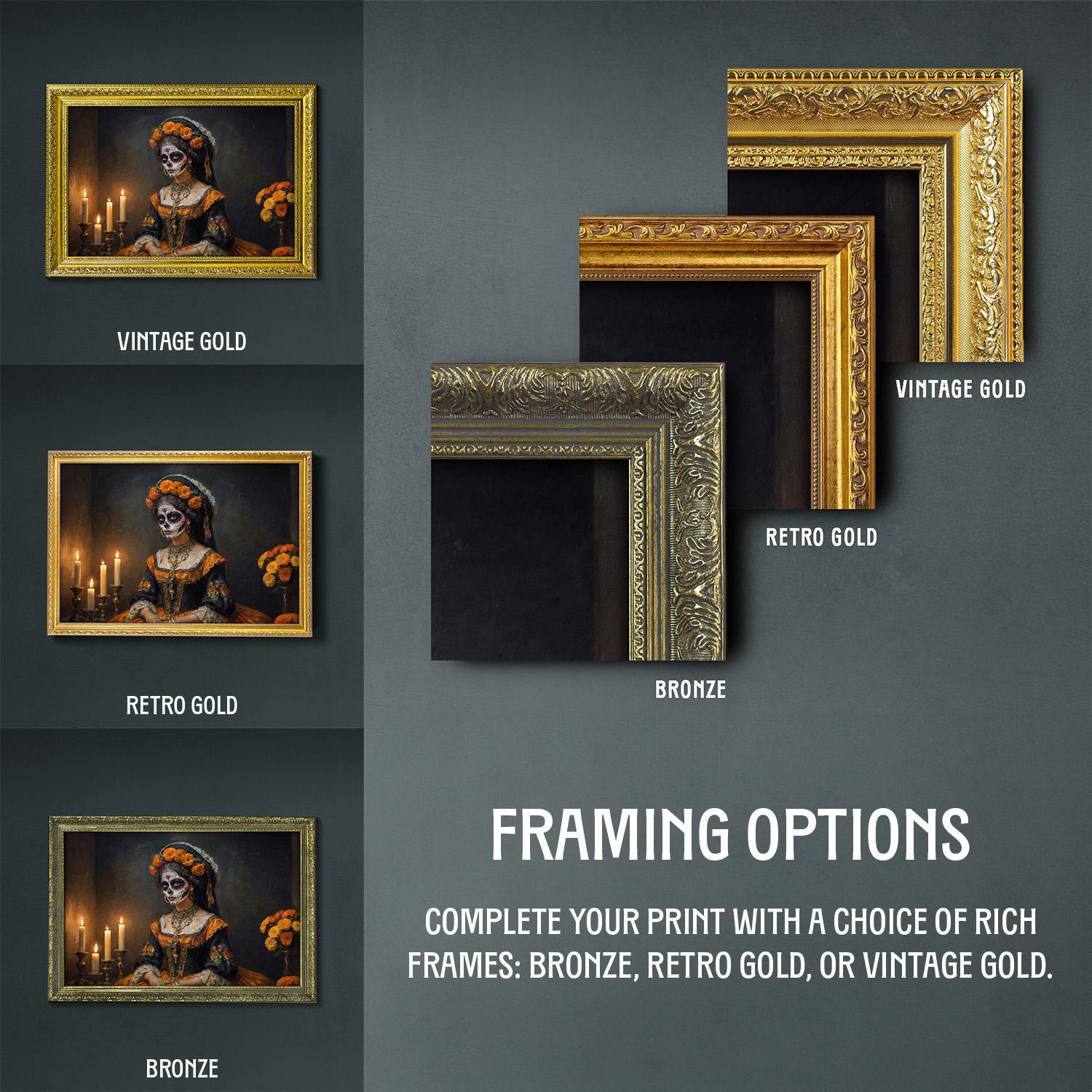 β’ Choice of bronze, retro gold, and vintage gold frame.