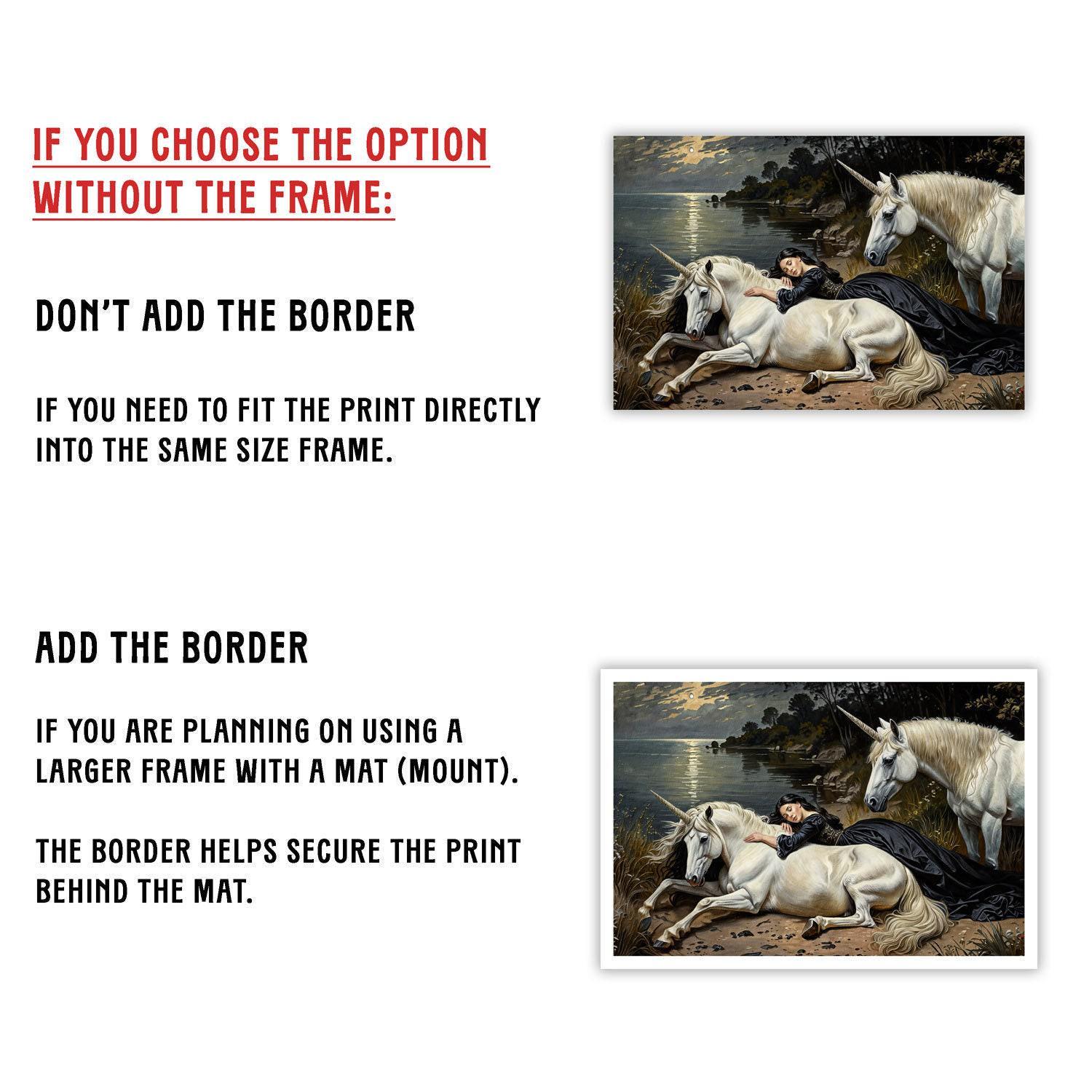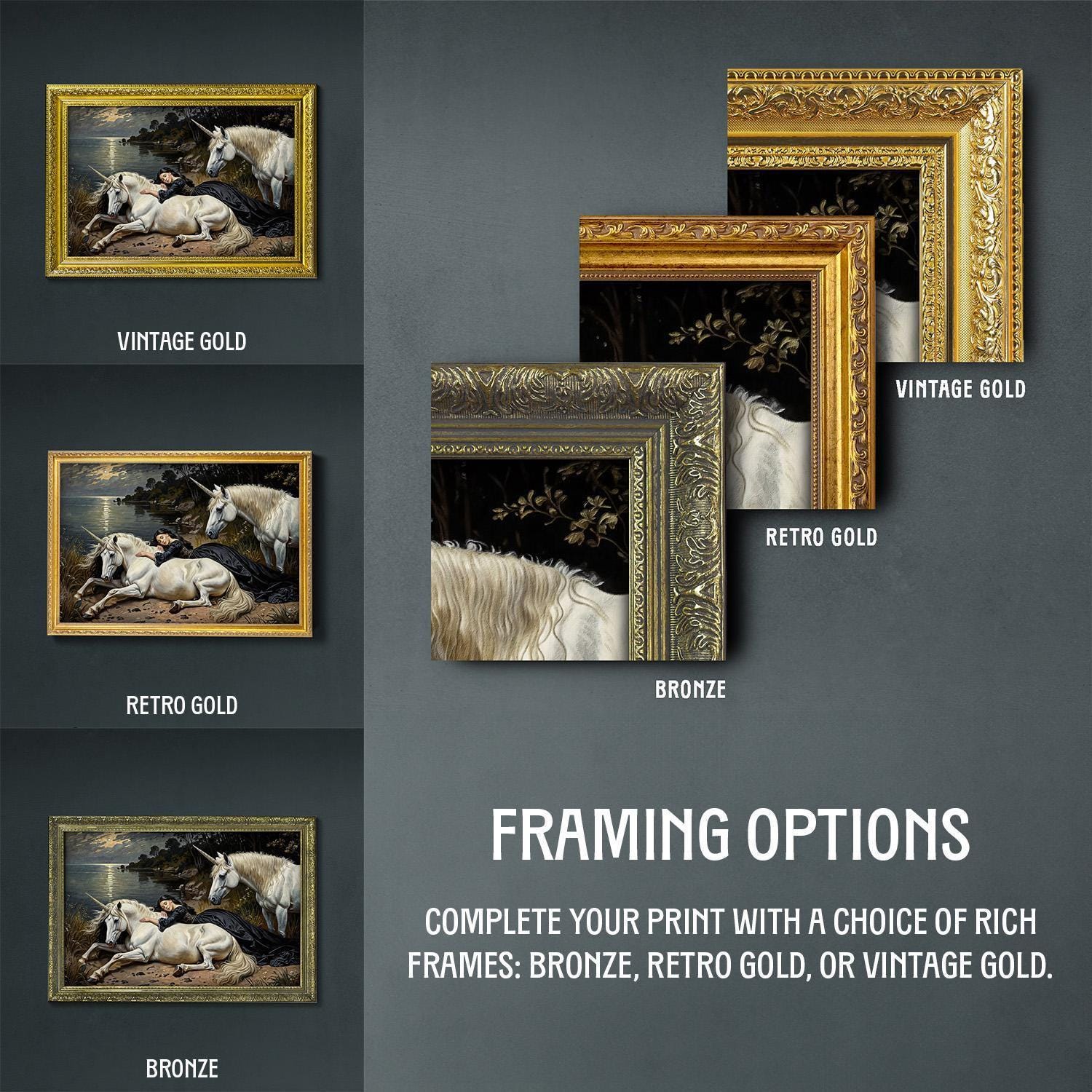 Immerse yourself in the moody world of dark academia with this artful print featuring a serene girl sleeping by the lake between two unicorns, perfect for gothic decor lovers.