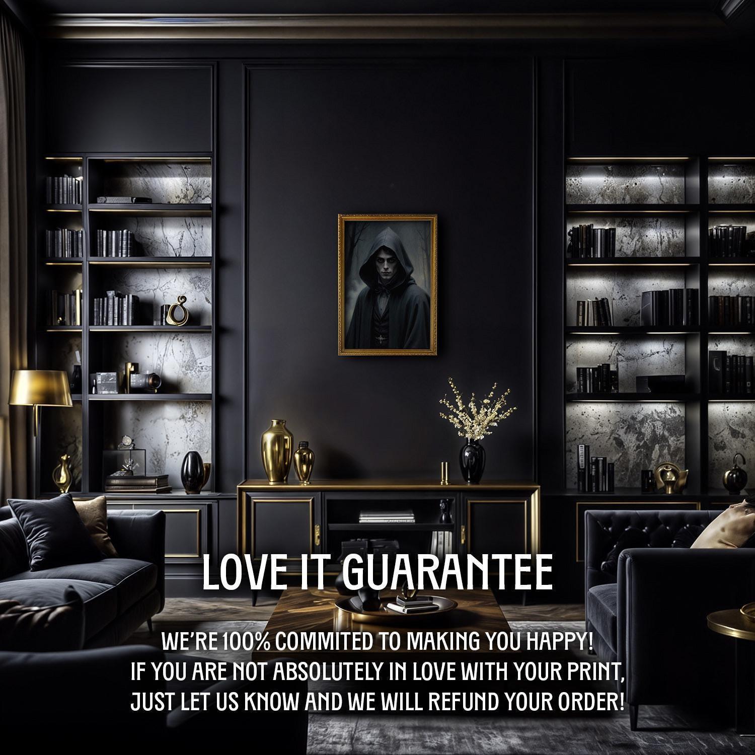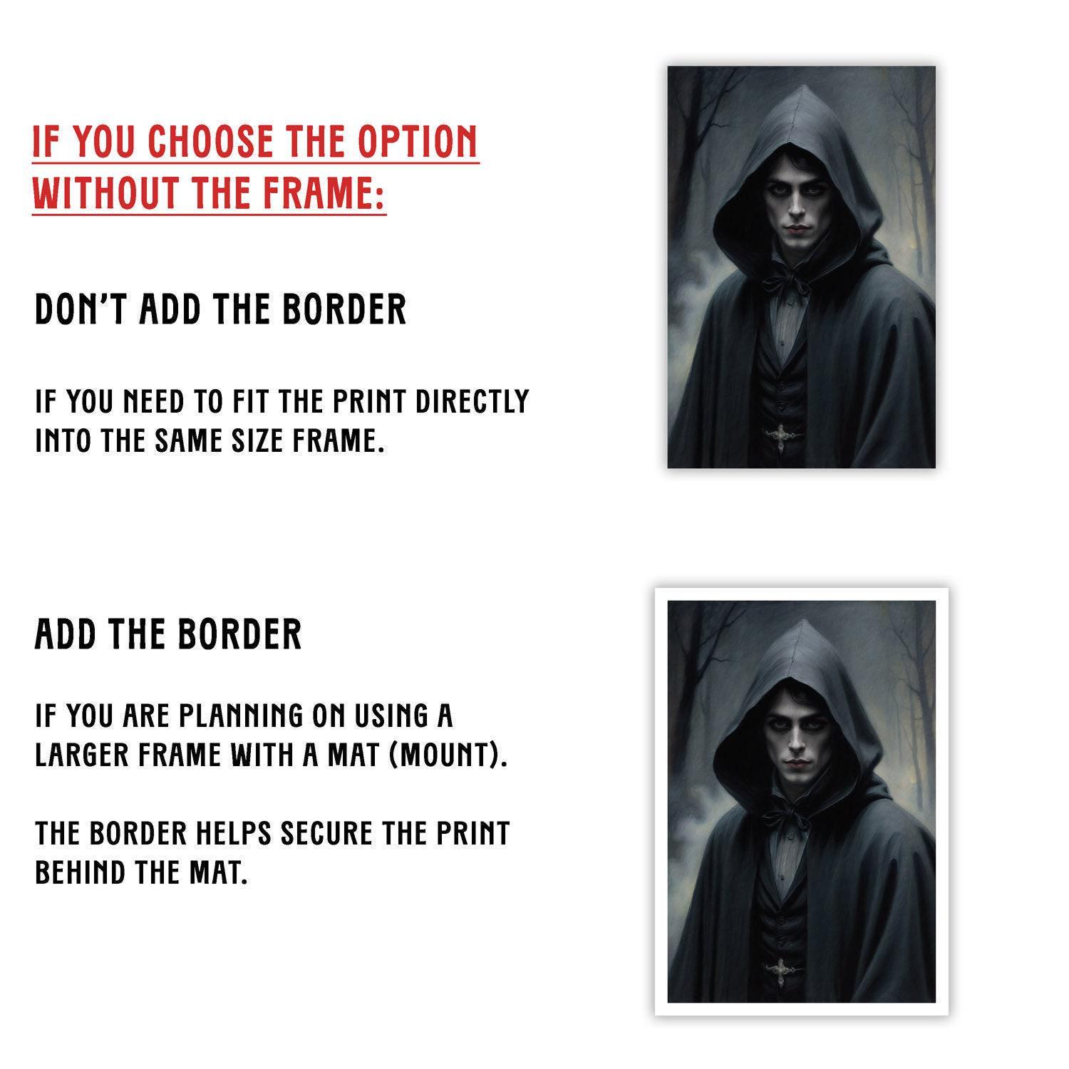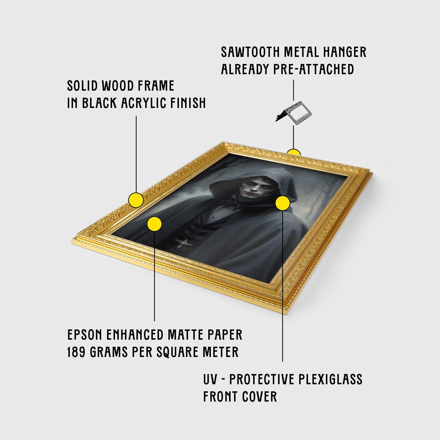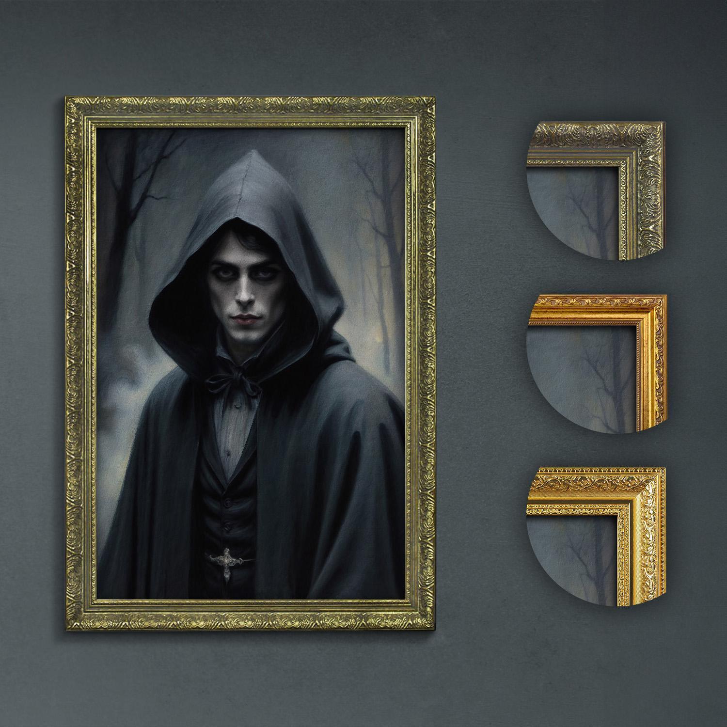Discover the haunting allure of this mysterious cloaked figure art print, perfect for dark academia lovers seeking eerie wall decor and gothic portrait art.