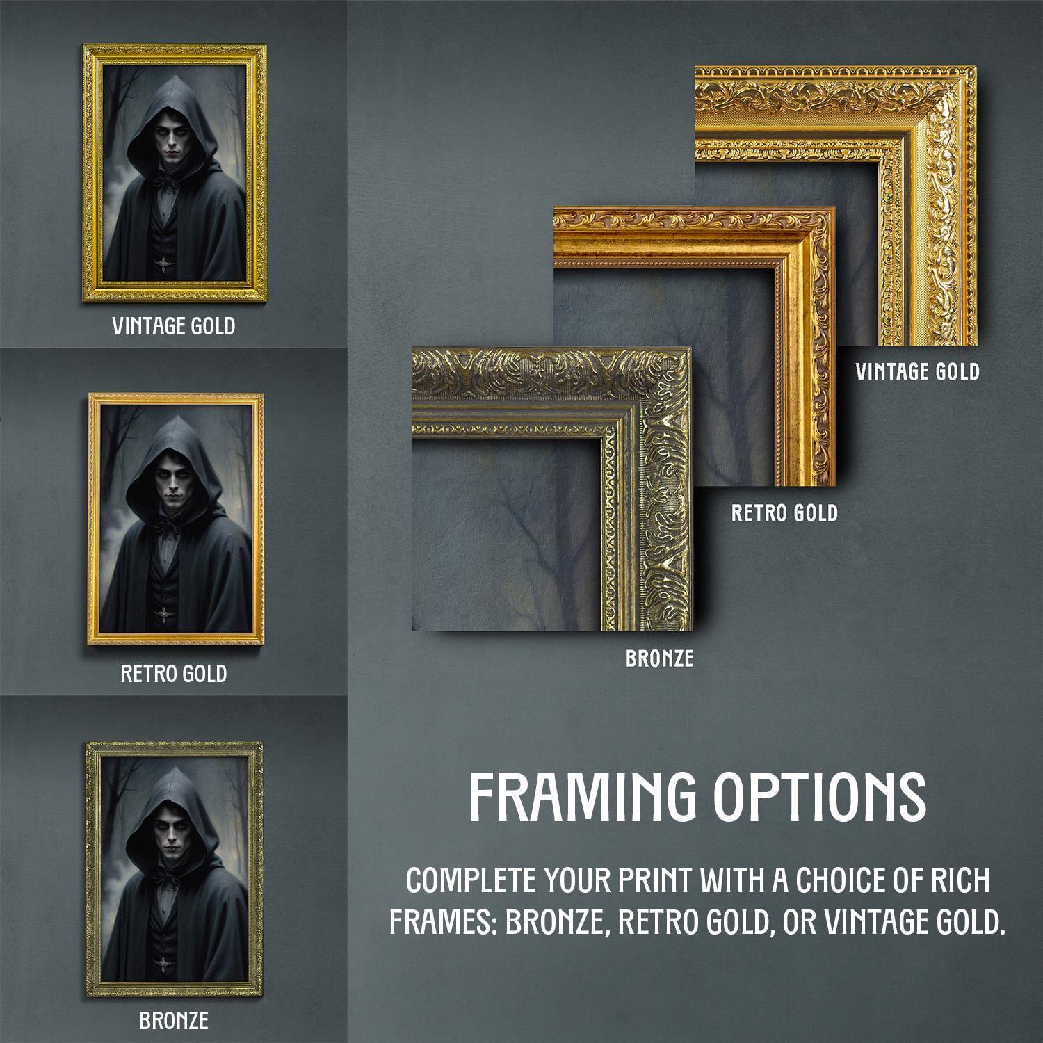 β’ Choice of bronze, retro gold, and vintage gold frame.