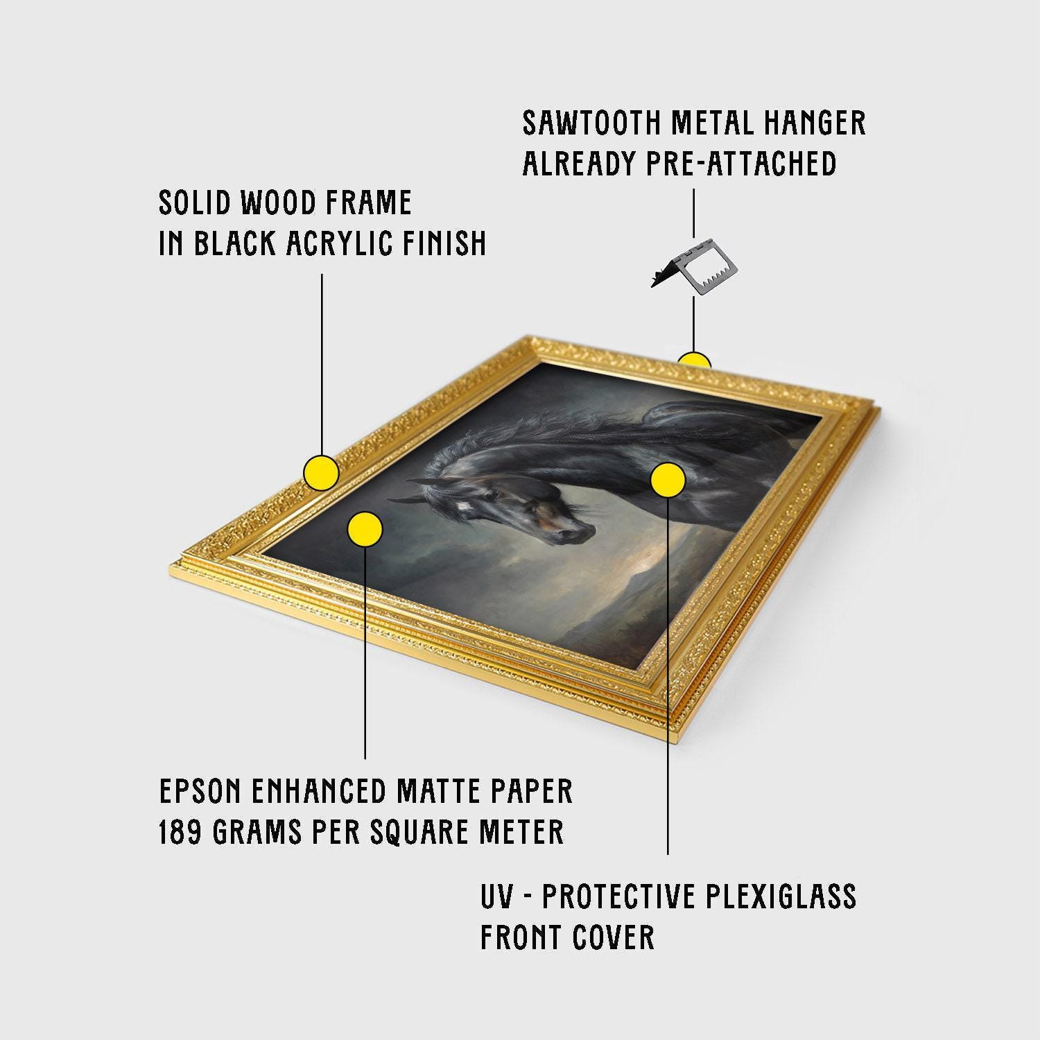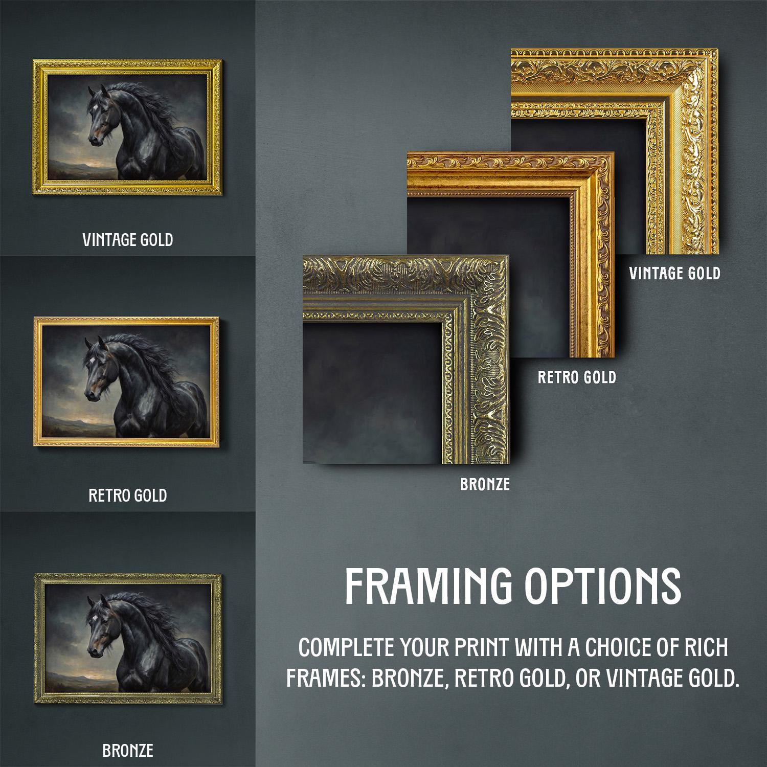 Step into a world where gothic horse decor meets timeless elegance with this captivating black stallion art print. Inspired by dark academia art and dramatic horse wall aesthetics, this piece brings a moody, antique style print to your living space, perfect for those who cherish rustic horse artwork with a mysterious edge. Each print evokes the spirit of equestrian room art, blending vintage charm with modern craftsmanship.
