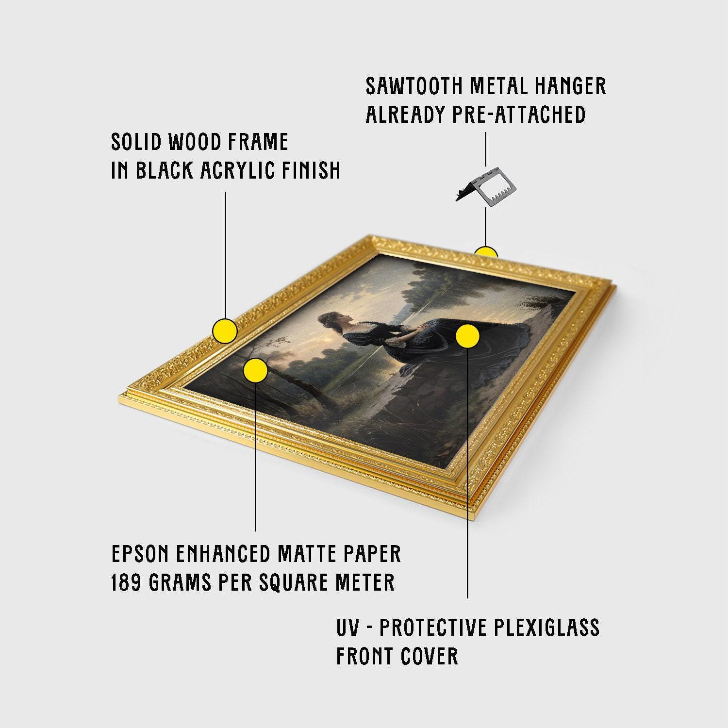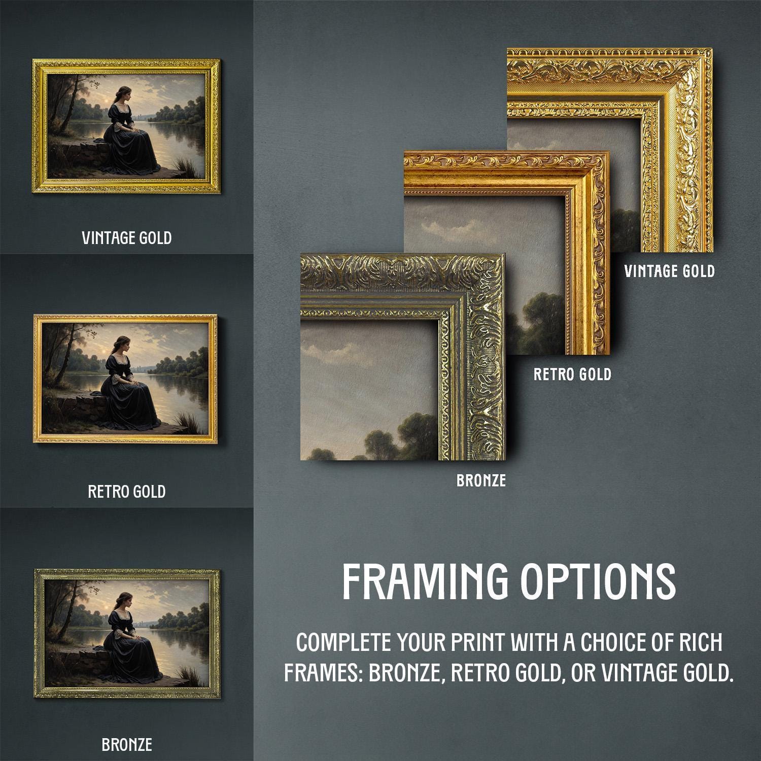 β’ Choice of bronze, retro gold, and vintage gold frame.