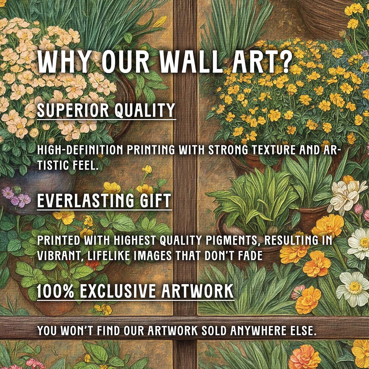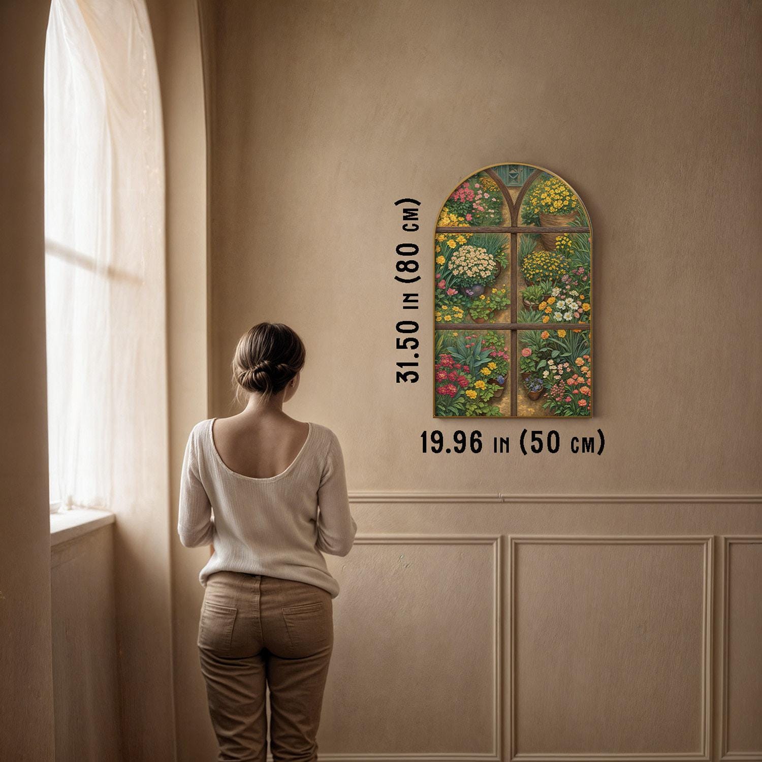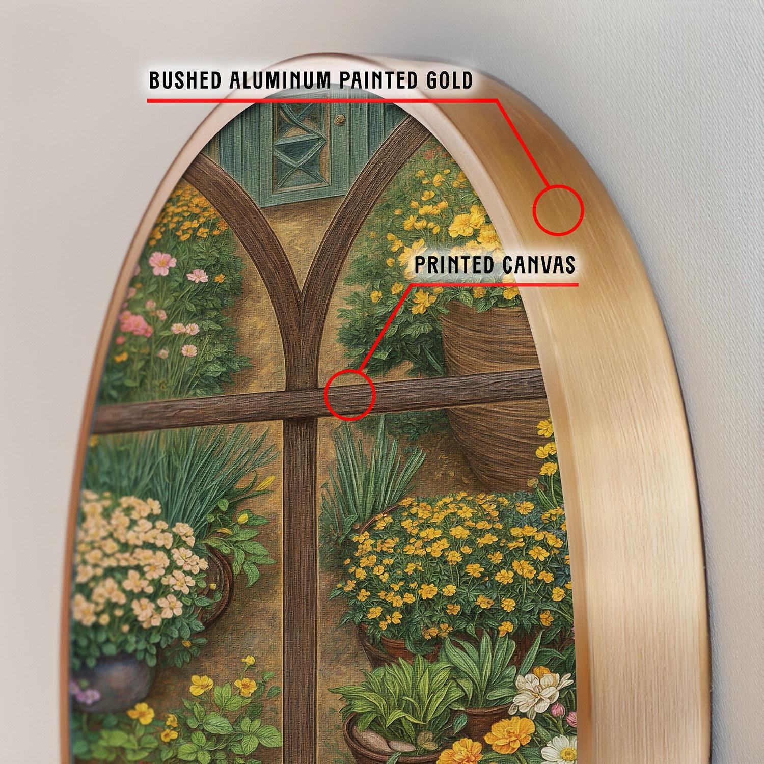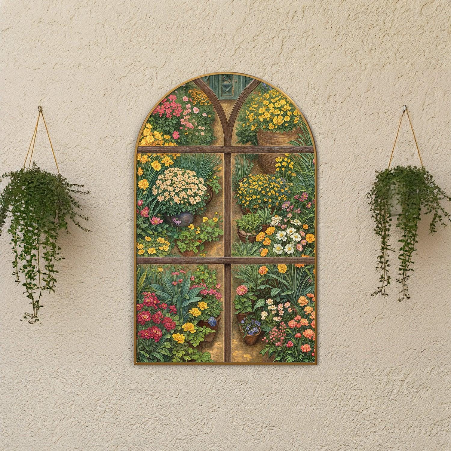 This arched floral canvas art featuring a colorful garden window design brings a fresh, botanical vibe to any room, ideal for nature lovers and spring decor enthusiasts.