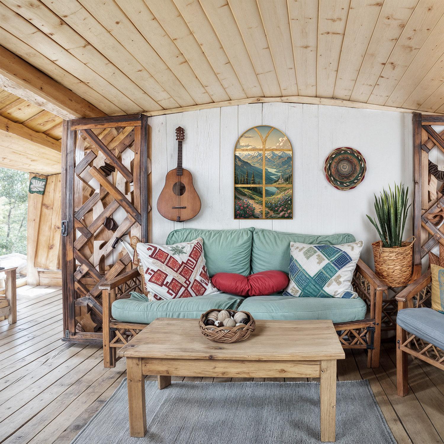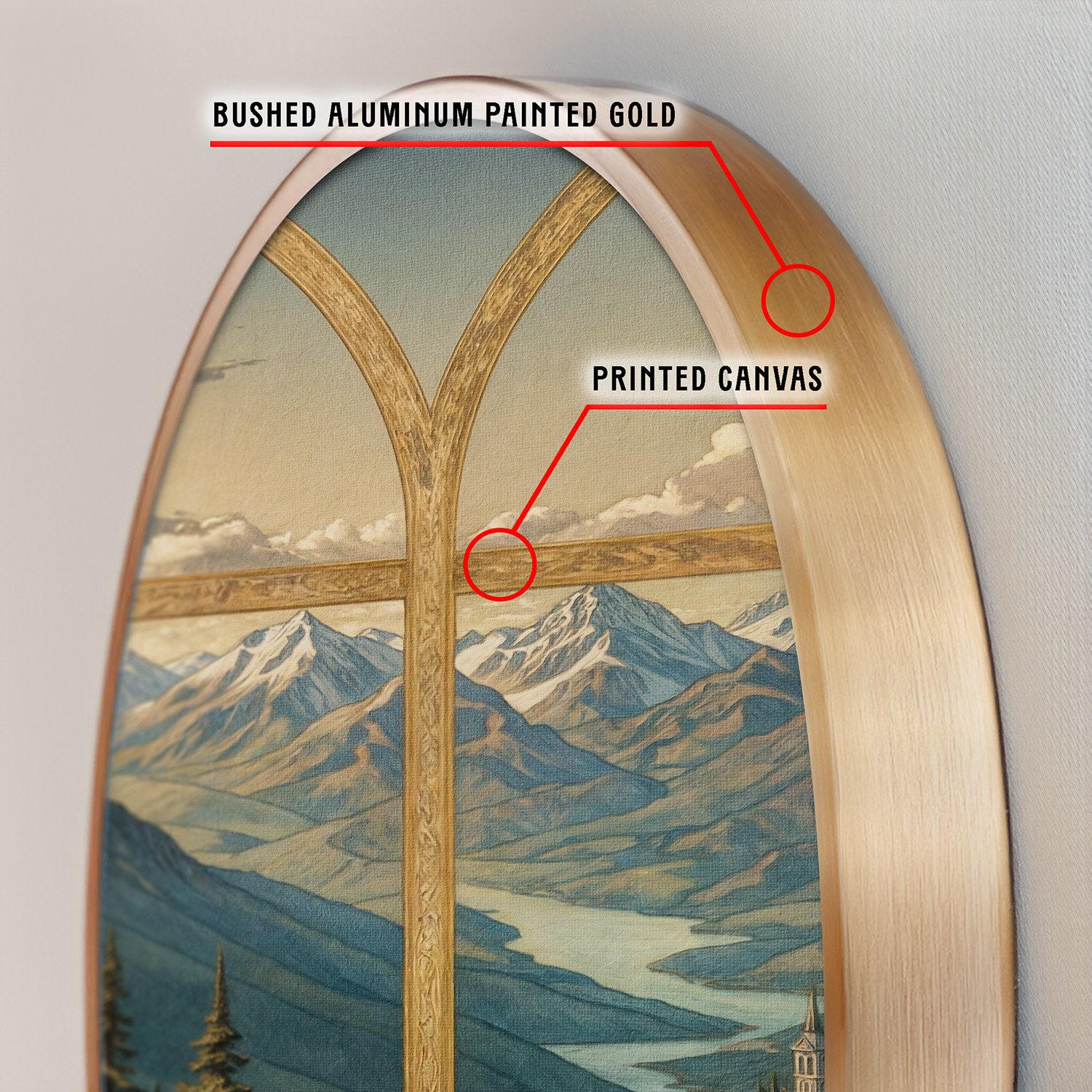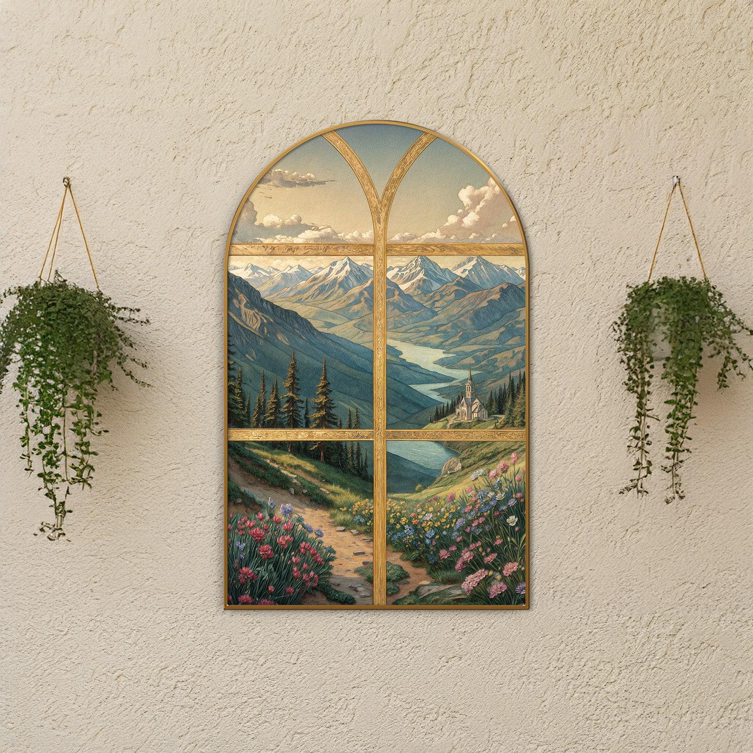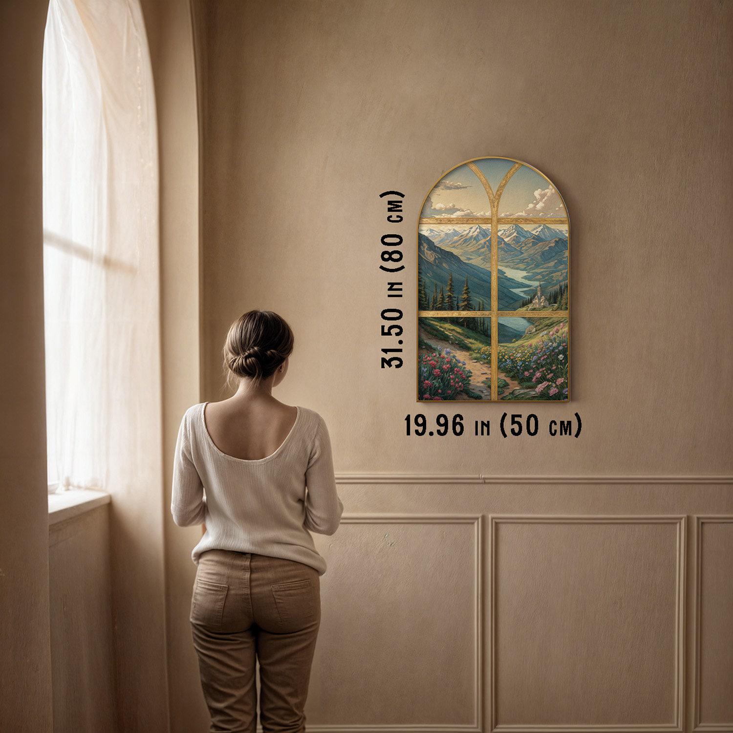 Elevate your decor with our stunning arched canvas print showcasing a beautiful mountainous landscape viewed through the window. This canvas comes with a frame made of brushed gold aluminum, adding an air of timeless sophistication to any space. Immerse yourself in the captivating allure of nostalgia and elegance with this exquisite piece, perfect for those who appreciate the beauty of nature.
