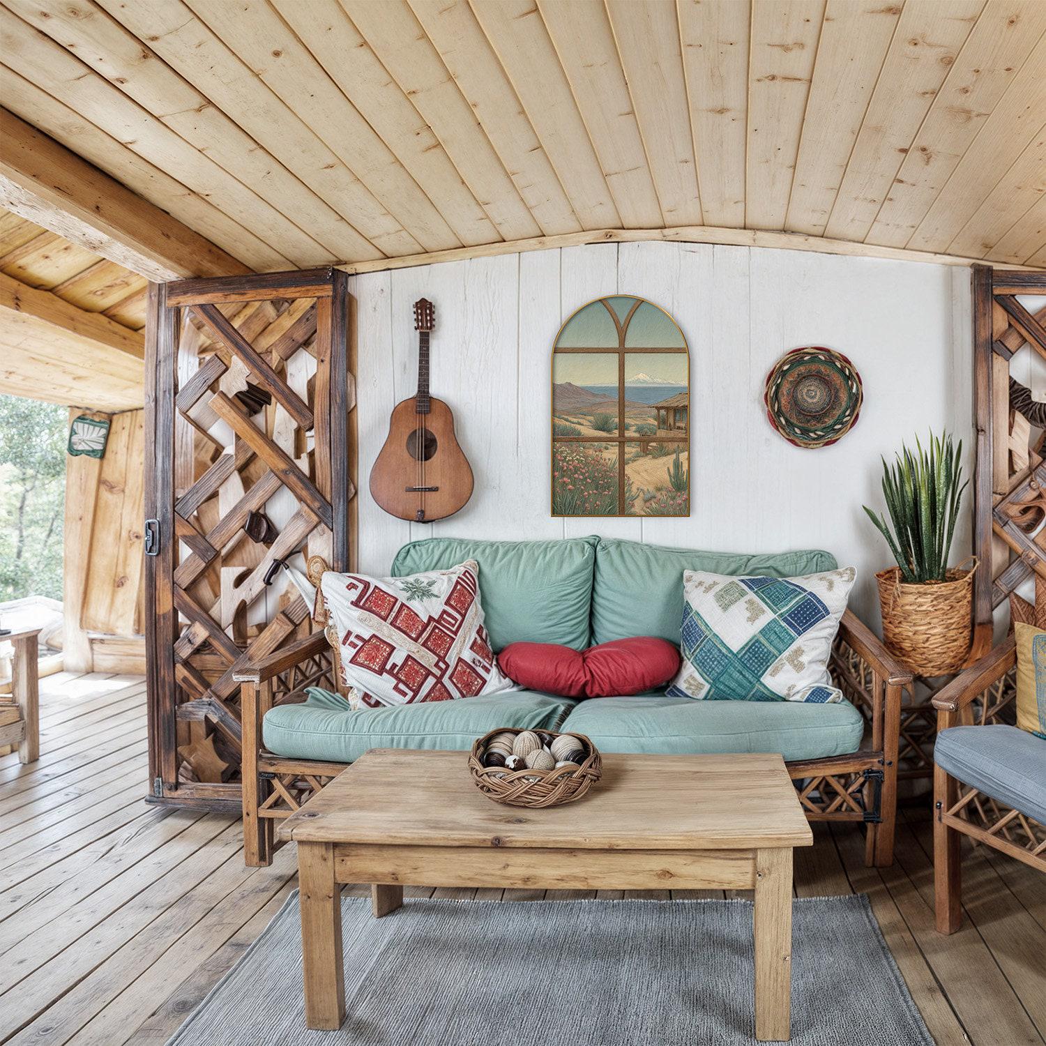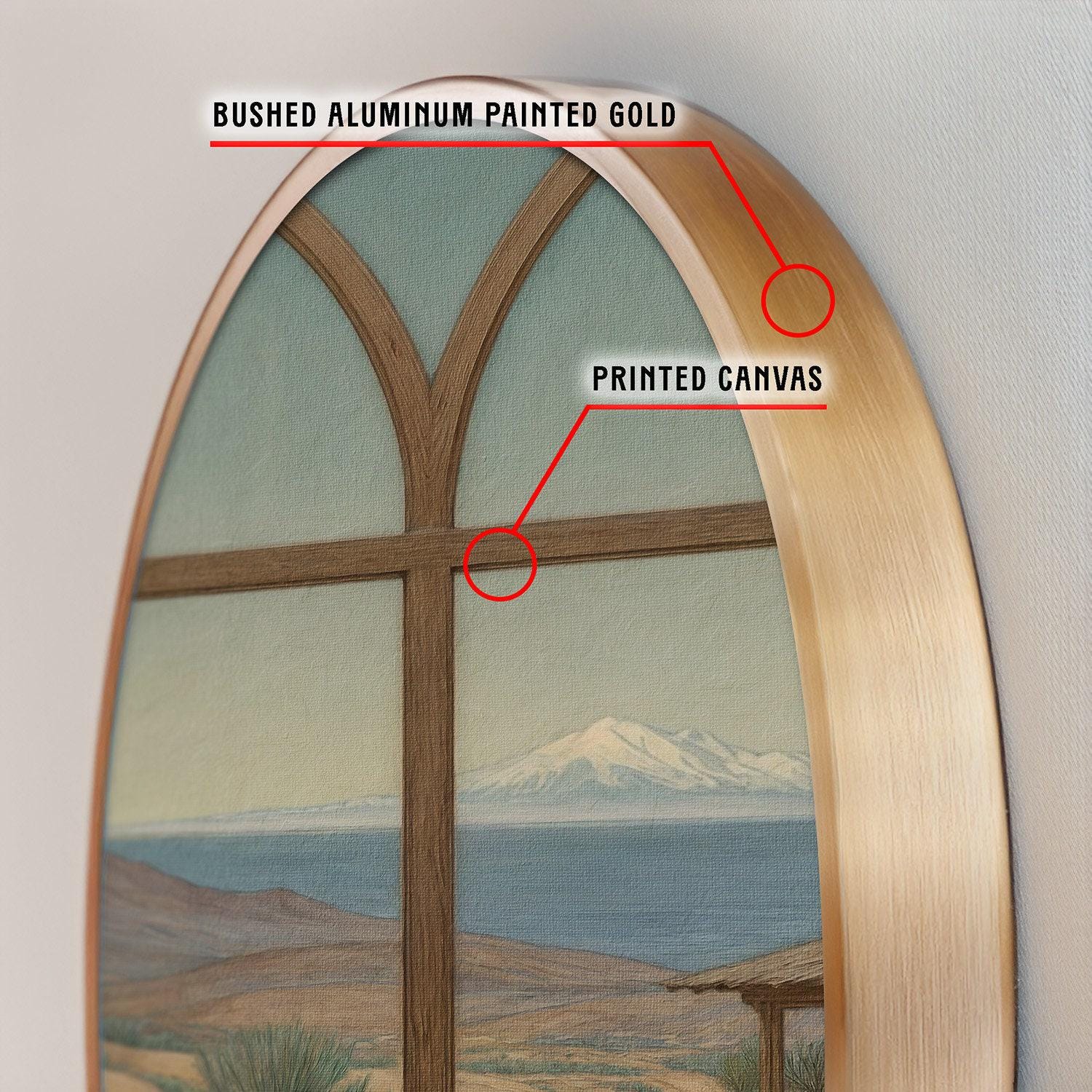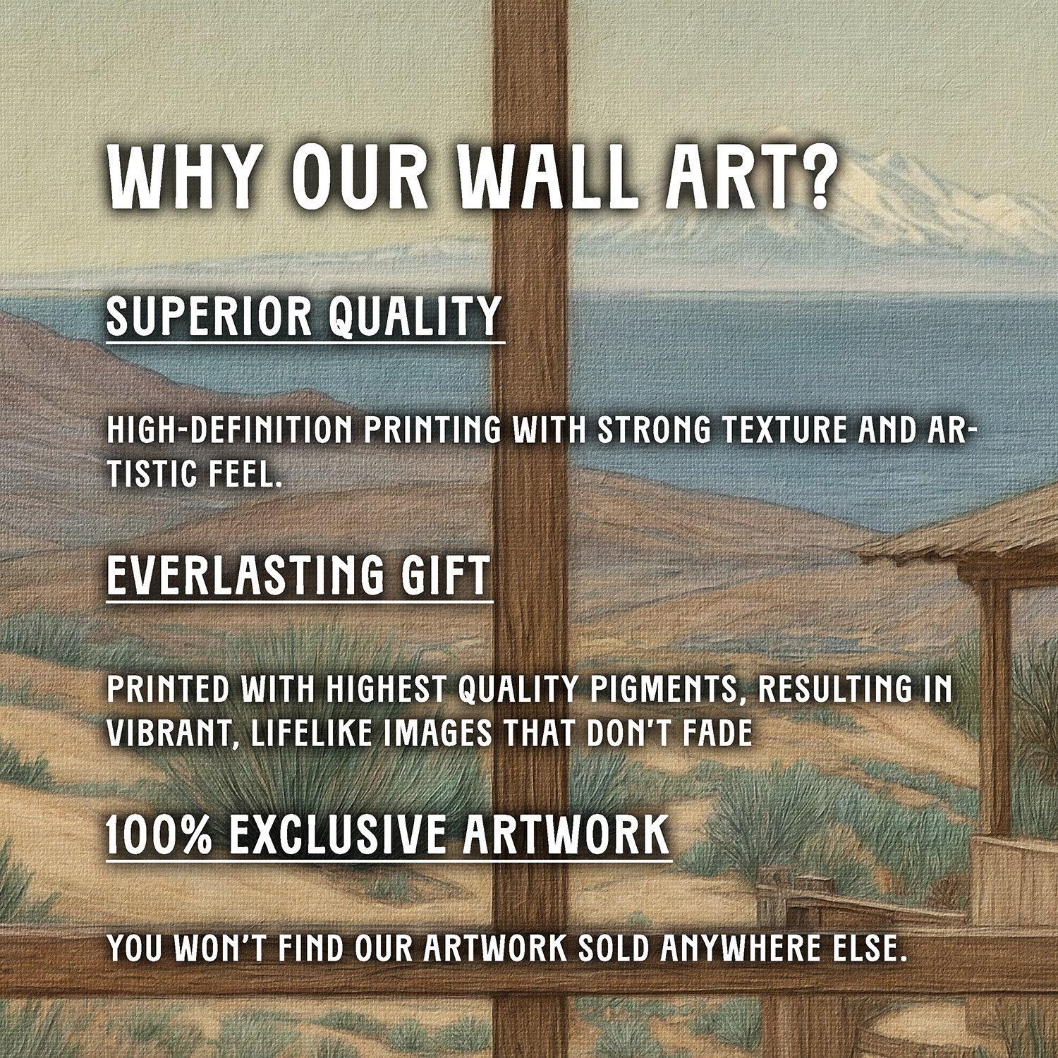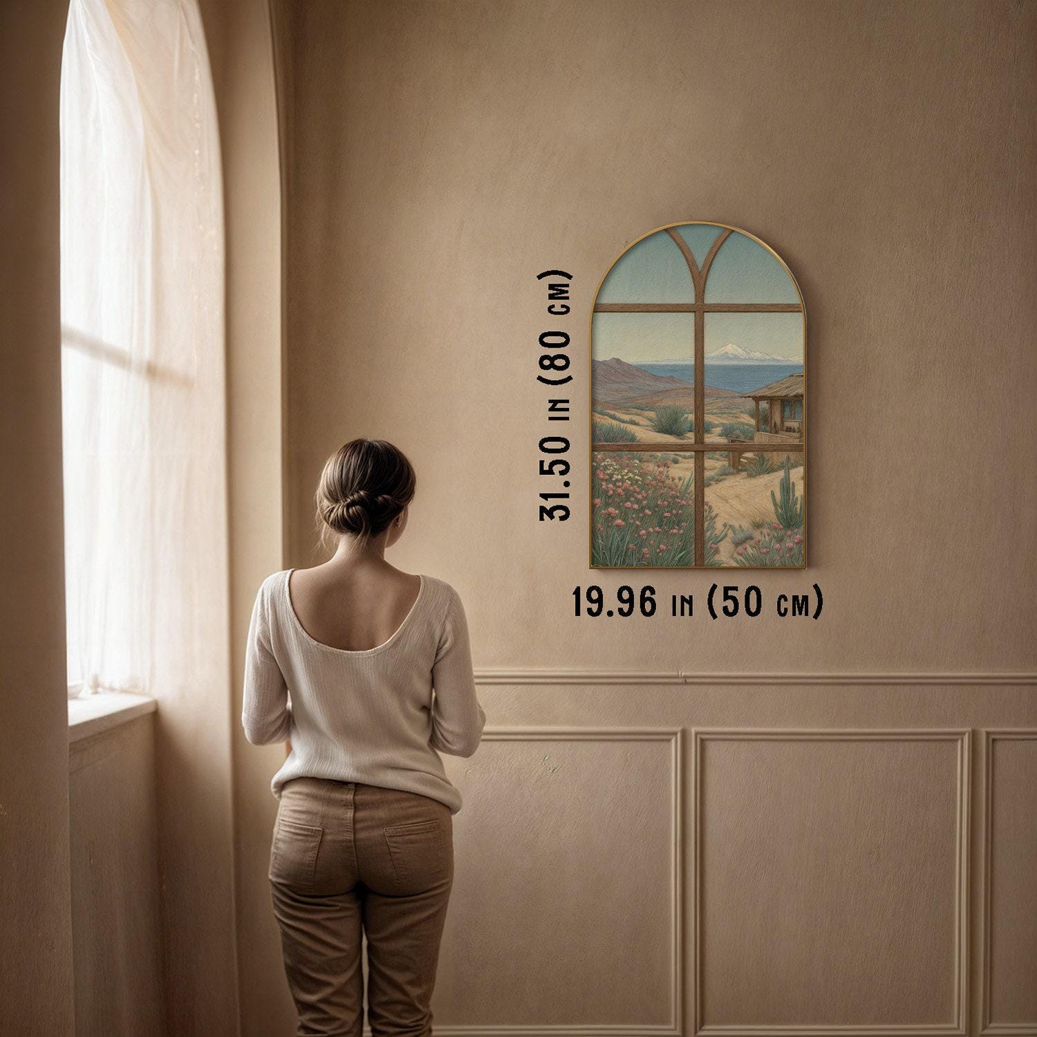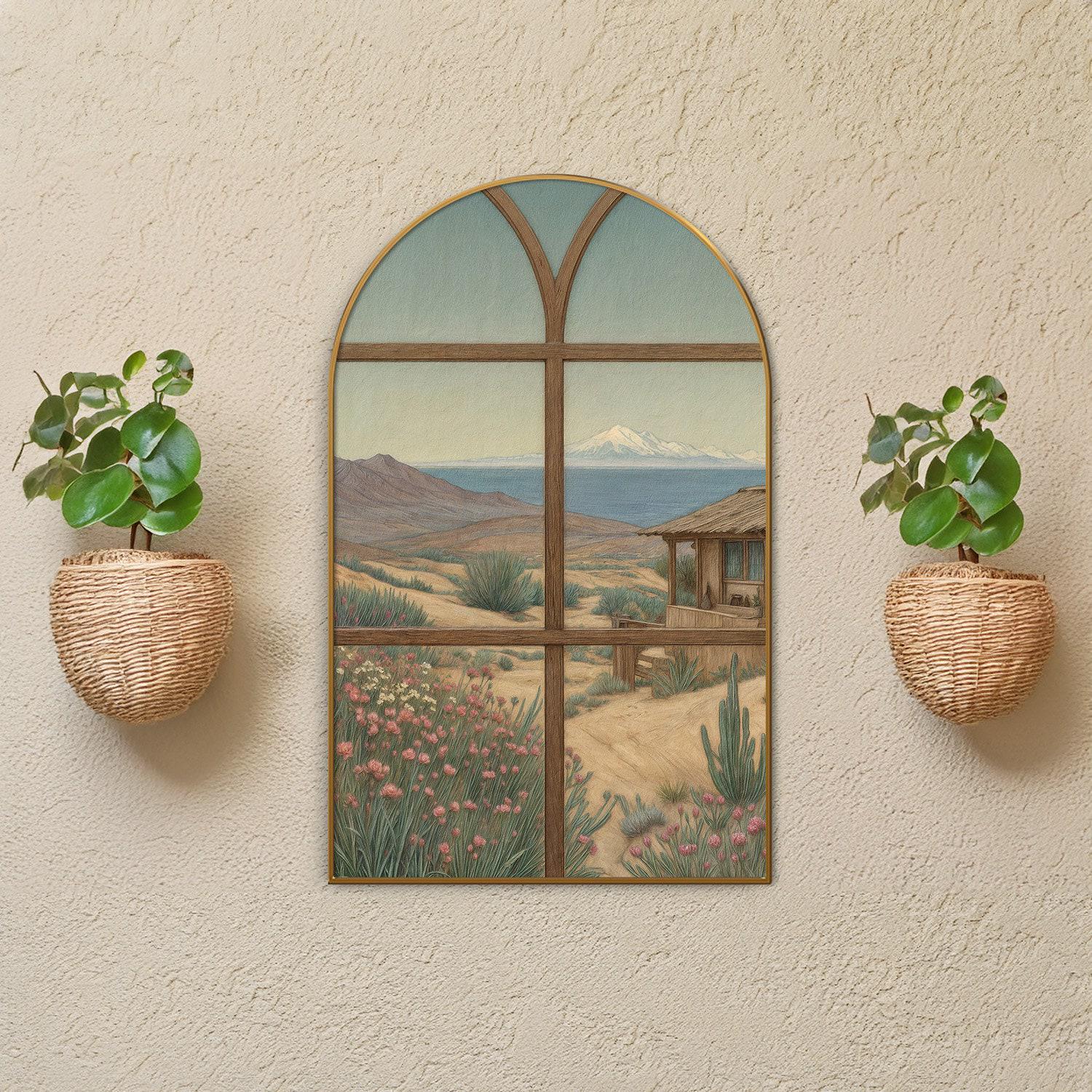 This arched desert landscape canvas art captures a tranquil mountain scene with rustic cabin details, perfect for adding a Southwestern touch to any home.