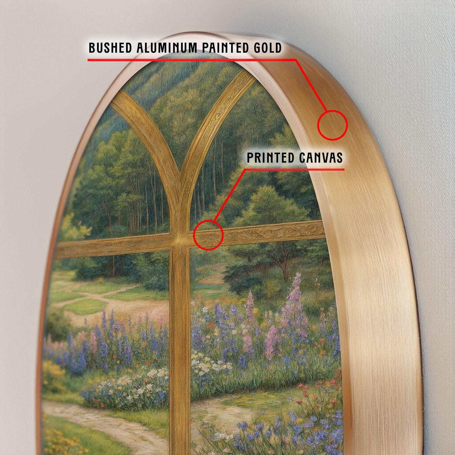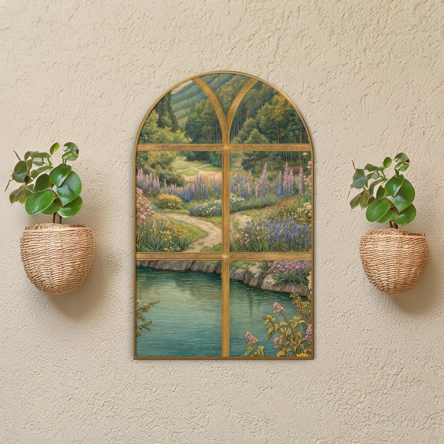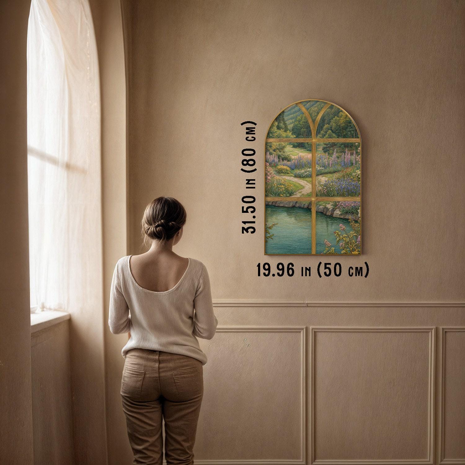 Step into a serene world where nature meets timeless elegance with this arched window canvas print. Featuring a tranquil pond landscape print framed in brushed gold aluminum, this piece brings a touch of luxury wall hanging to any room. Perfectly ready to hang, it captures a unique window view that invites calm and reflection.