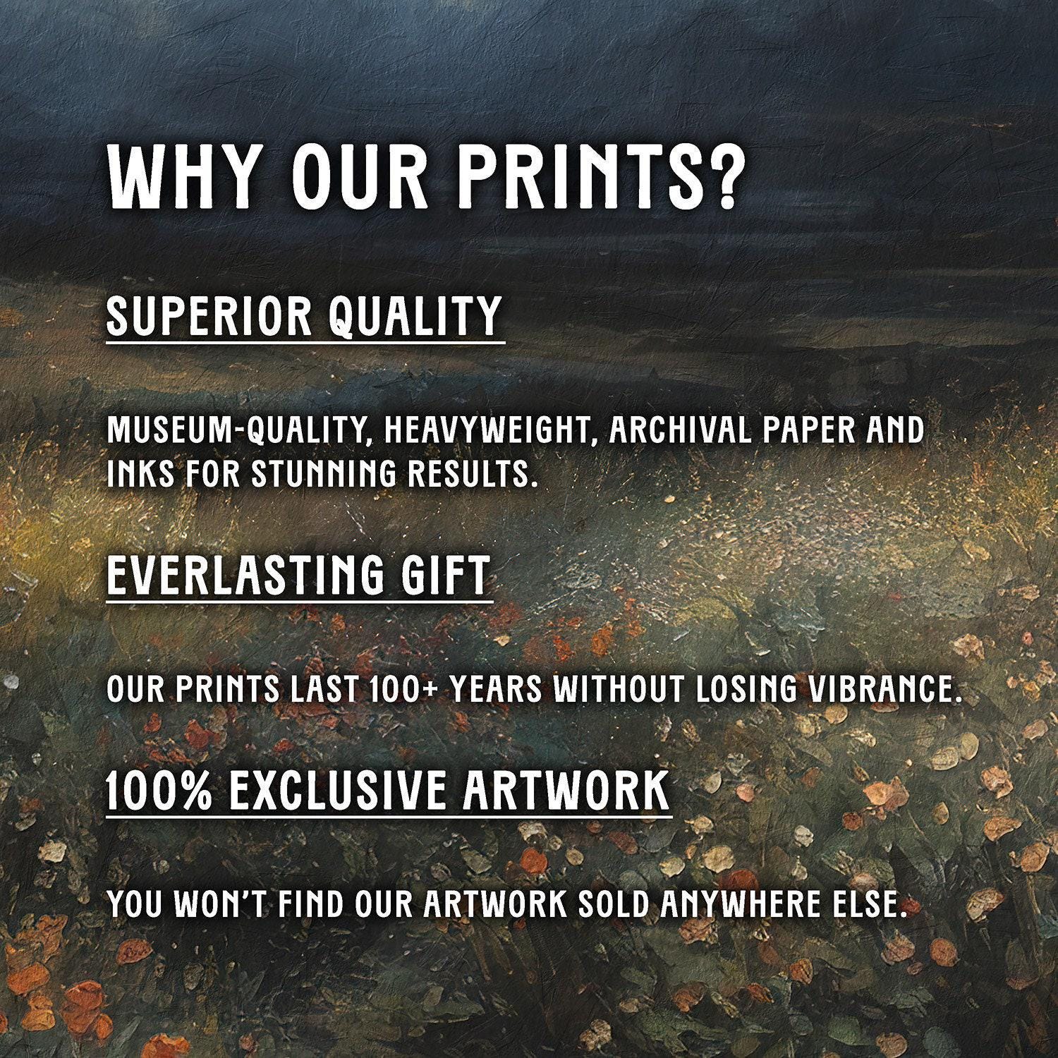 Our art prints are produced on museum-quality paper using archival inks to guarantee they last a lifetime without fading or losing color.