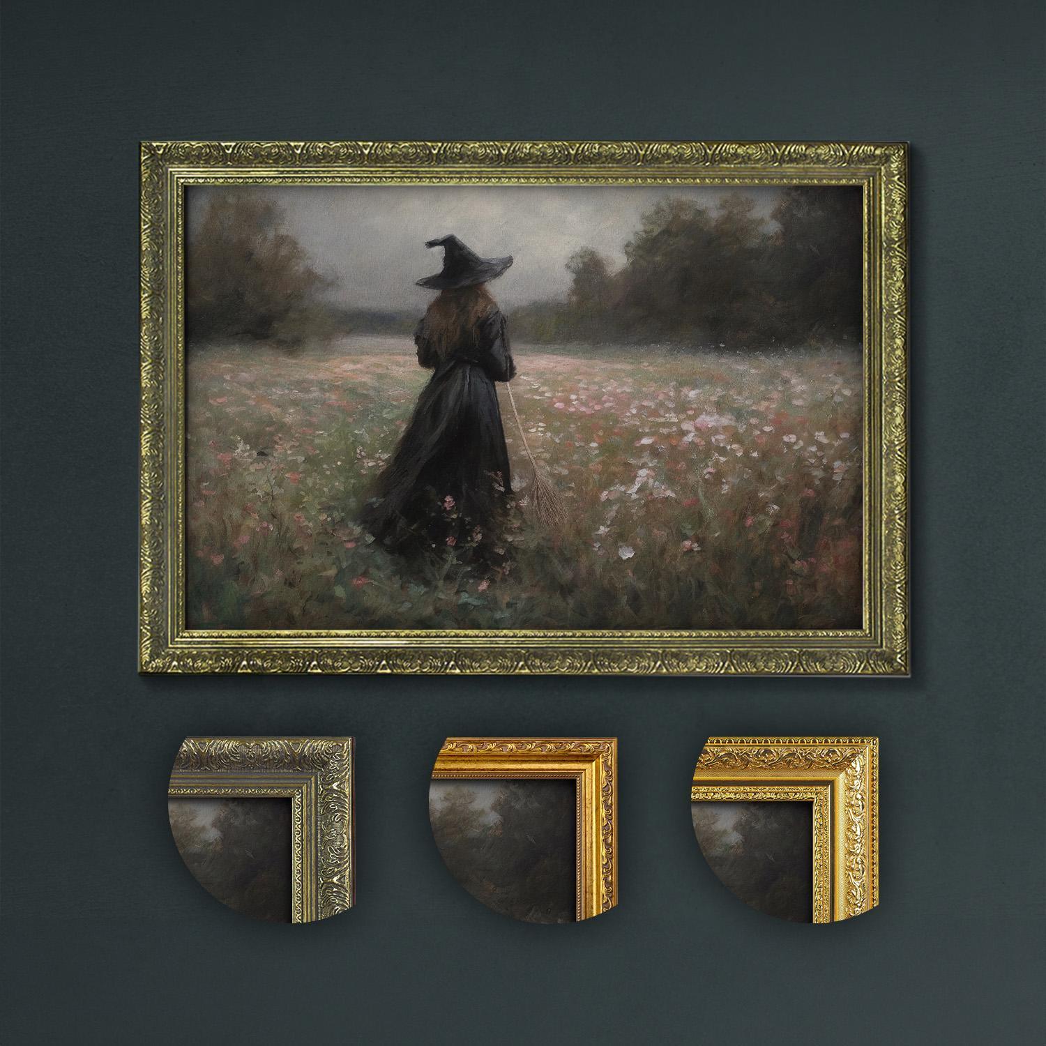 Step into a misty meadow where a solitary witch wanders, bringing moody witchy decor and dark academia artful charm to your gothic home with vintage style.