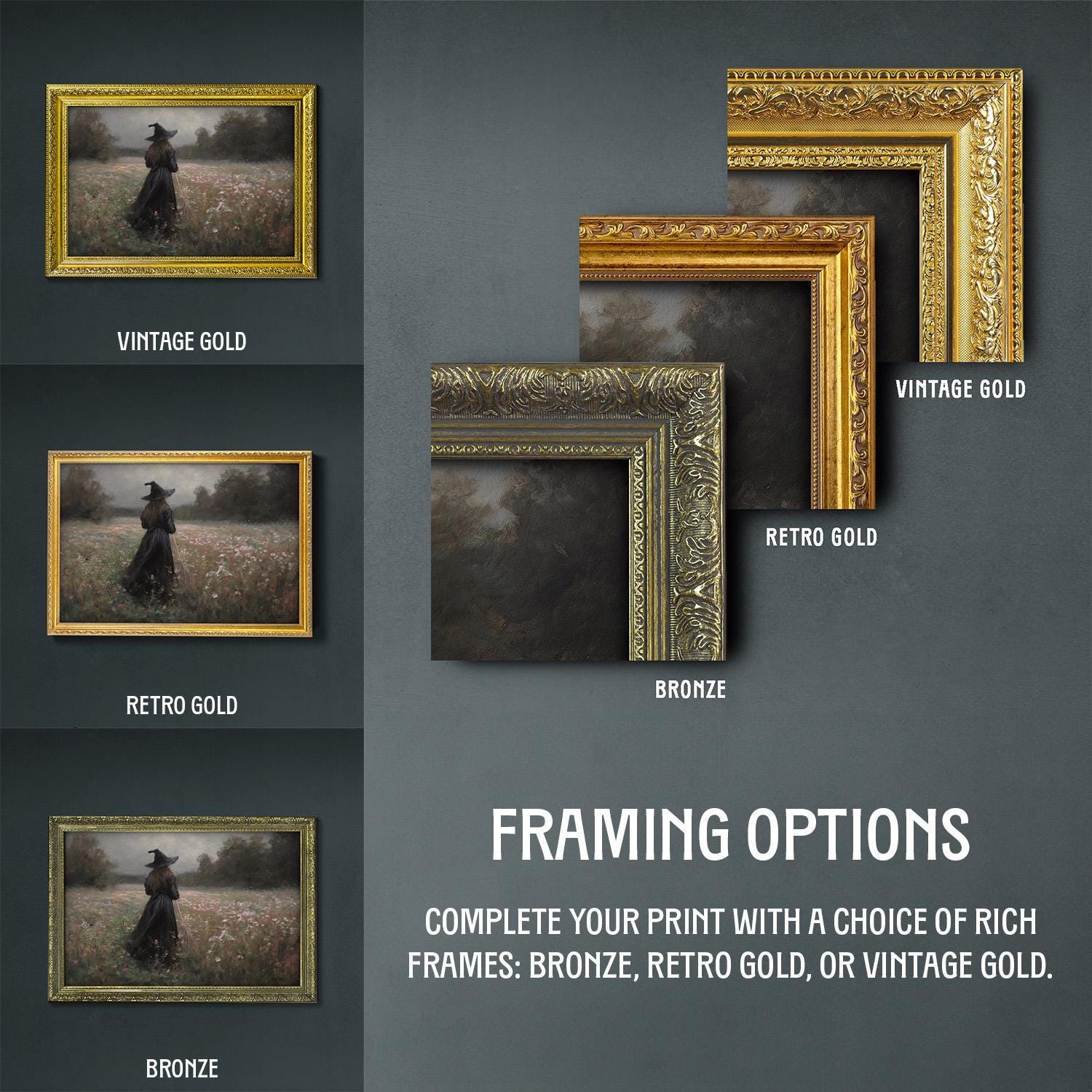 β’ Choice of bronze, retro gold, and vintage gold frame.