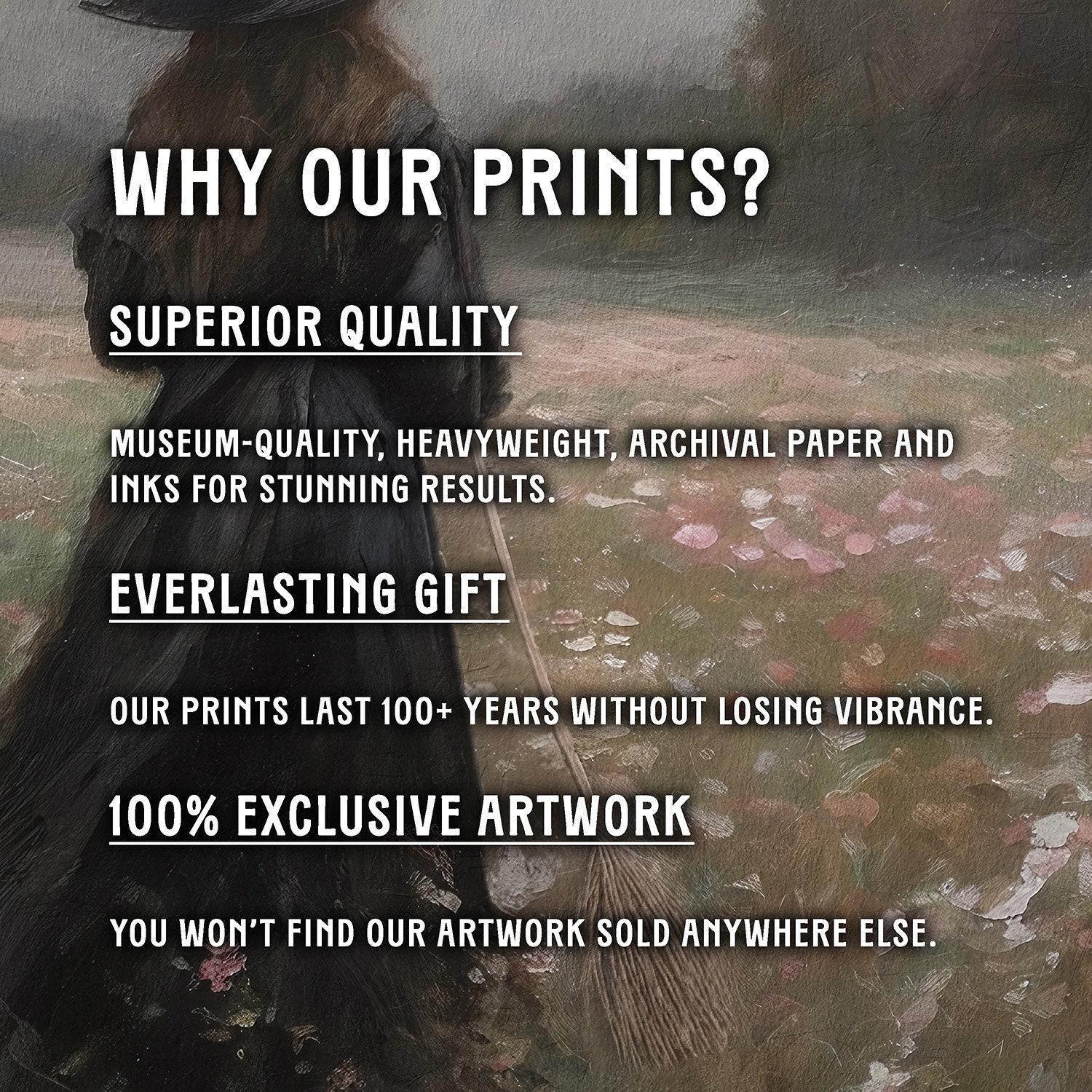 Our art prints are produced on museum-quality paper using archival inks to guarantee they last a lifetime without fading or losing color.