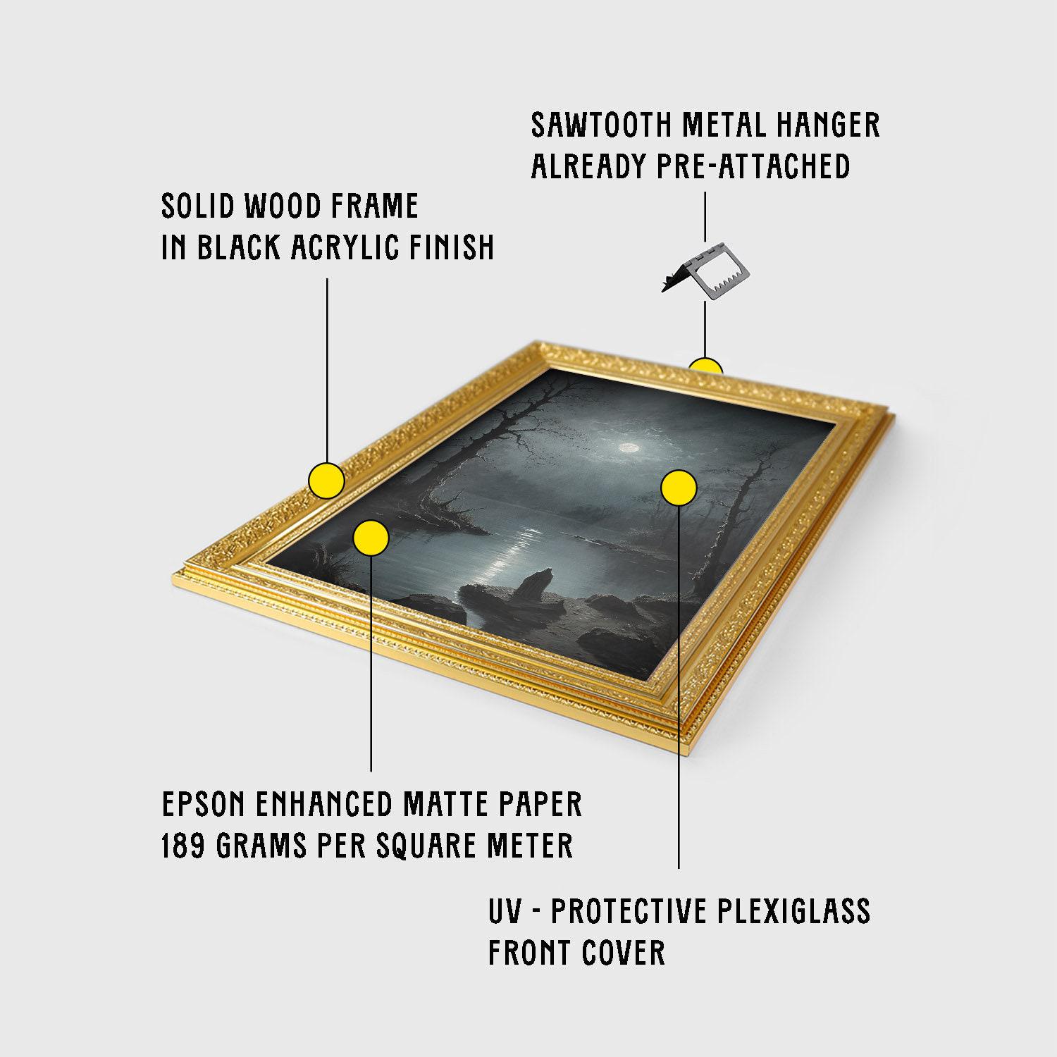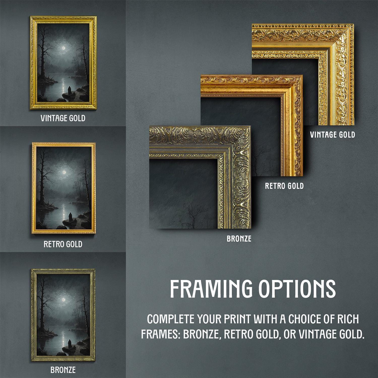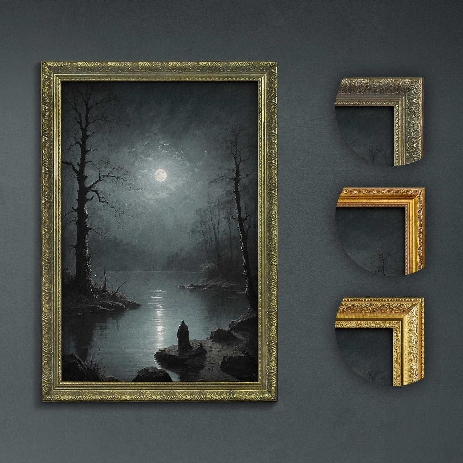 Discover the mystical charm of this moonlit lake print, where gothic dark academia meets vintage nature art in a serene, moody forest scene.