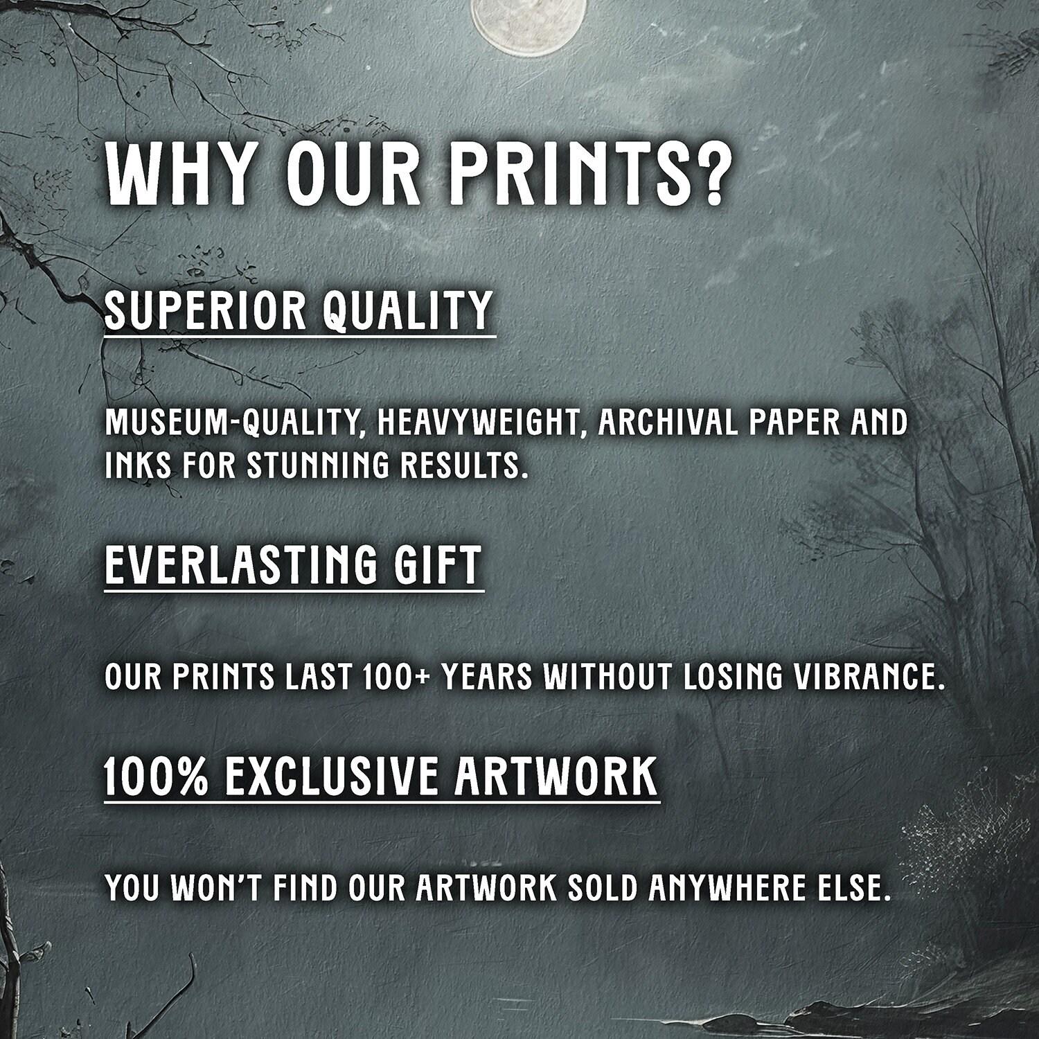 Our art prints are produced on museum-quality paper using archival inks to guarantee they last a lifetime without fading or losing color.