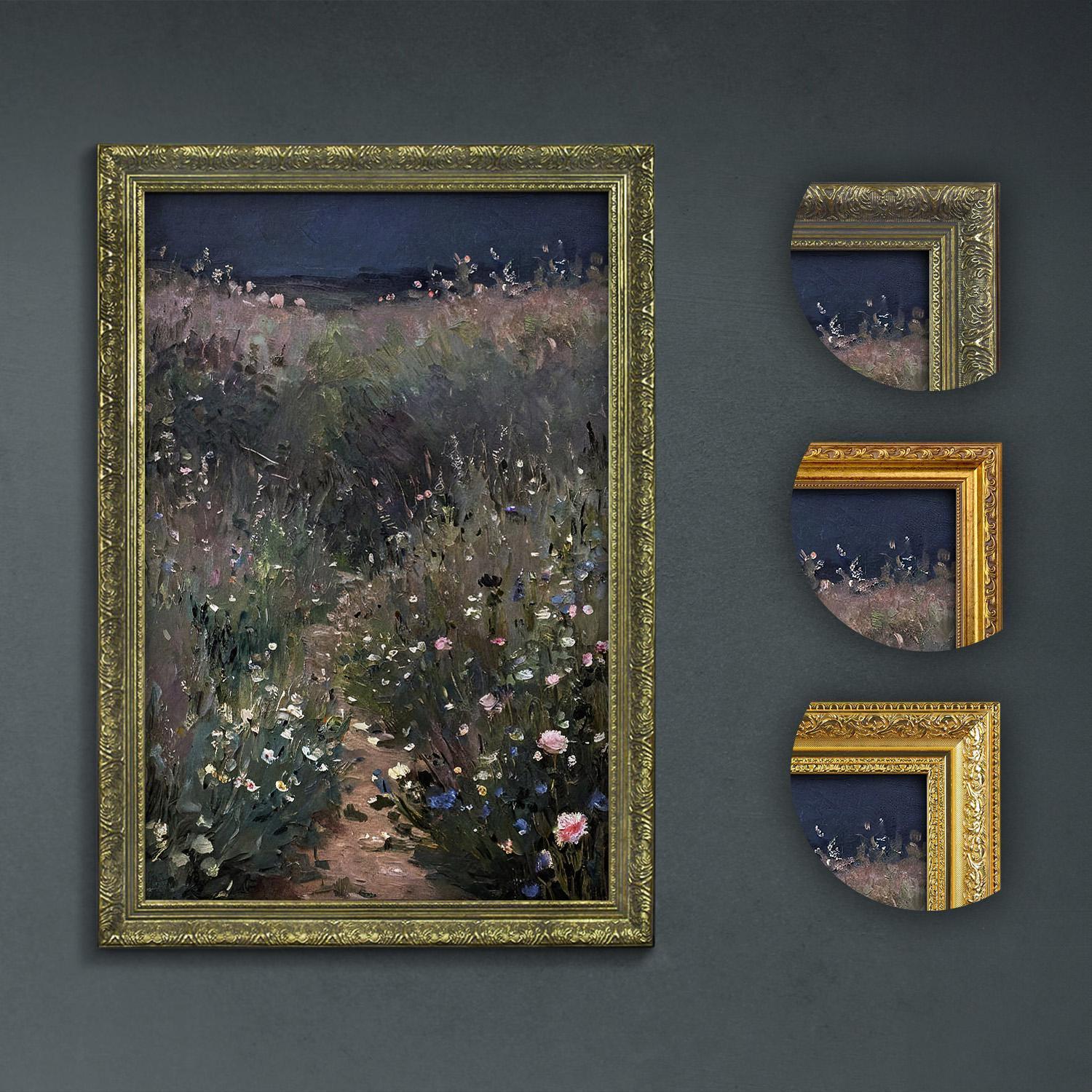 Step into the enchanting world of impasto flower field art, where textured wildflowers and a dusky sky create a rustic, vintage charm perfect for elegant wall decor and dark academia artful vibes.