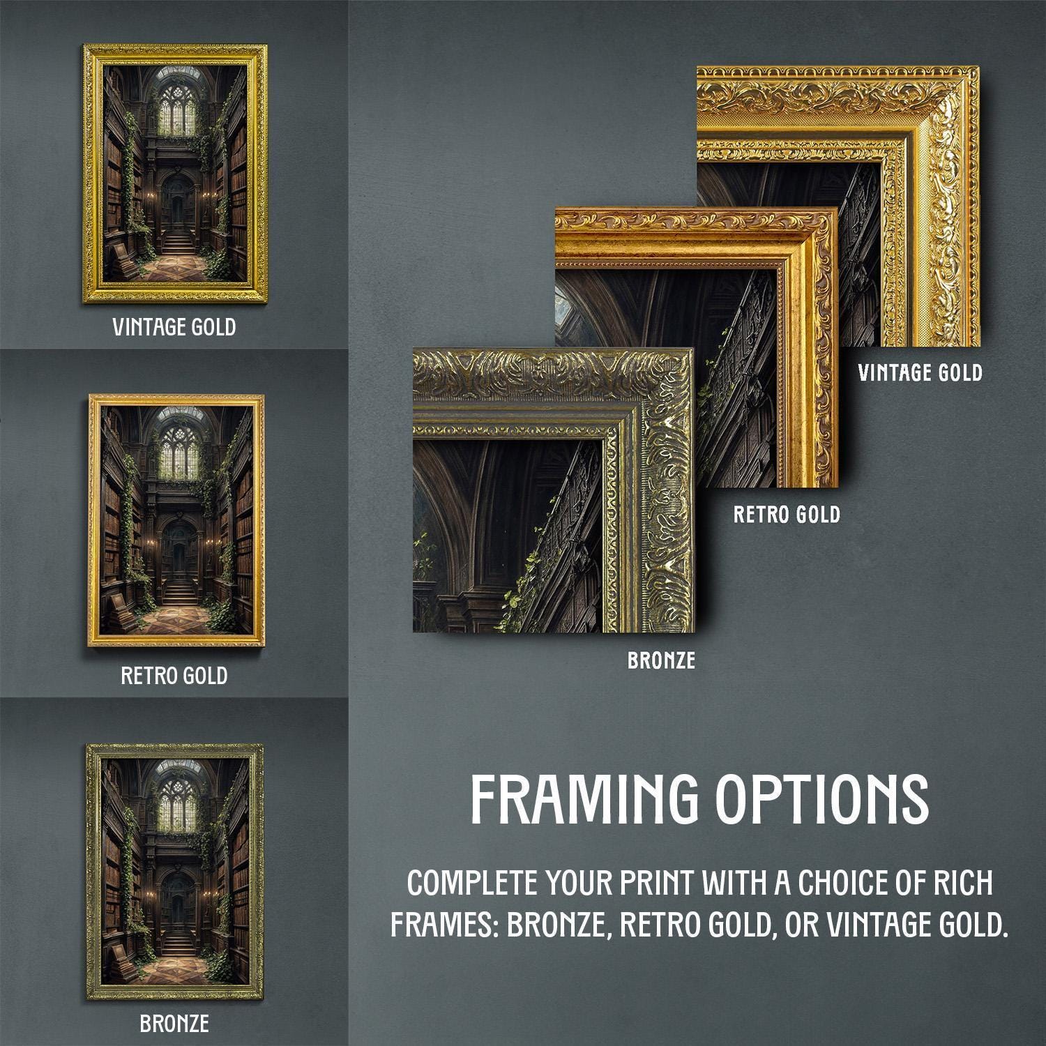β’ Choice of bronze, retro gold, and vintage gold frame.