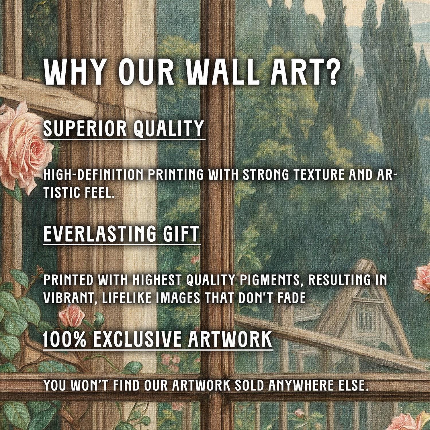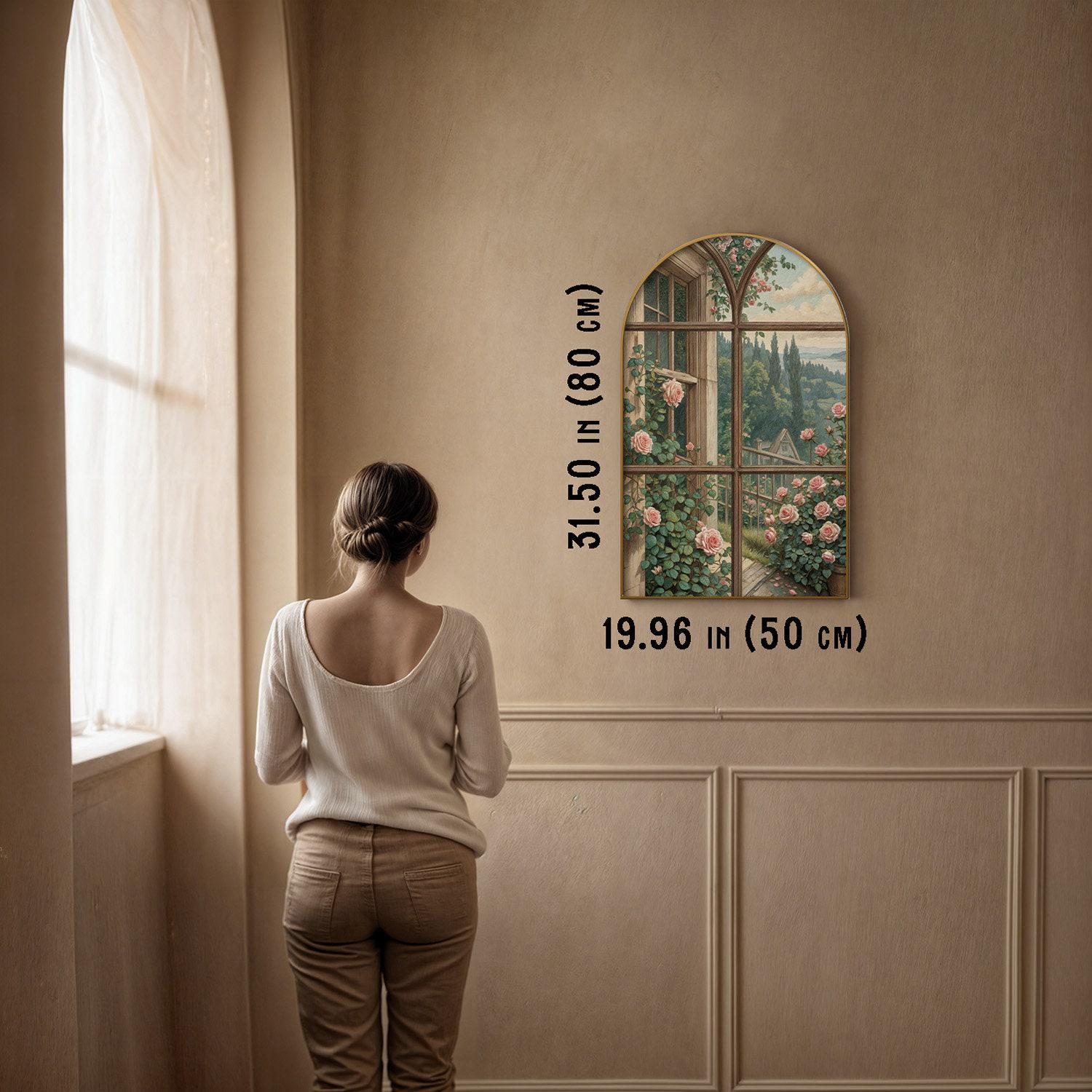 Step into a serene moment with this arched rose garden canvas print, where the gentle beauty of floral canvas art meets the sophistication of a brushed gold frame. Inspired by vintage window art, this piece captures the timeless elegance of nature viewed through a golden aluminum frame, creating a luxurious wall hanging that transforms any room. Perfect for those seeking elegant wall art that evokes nostalgia and a refined garden ambiance.