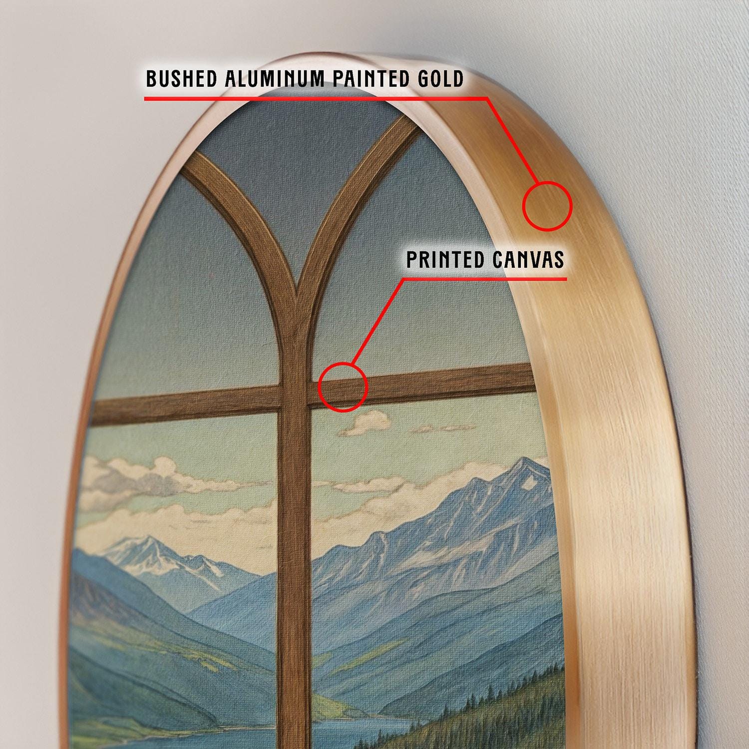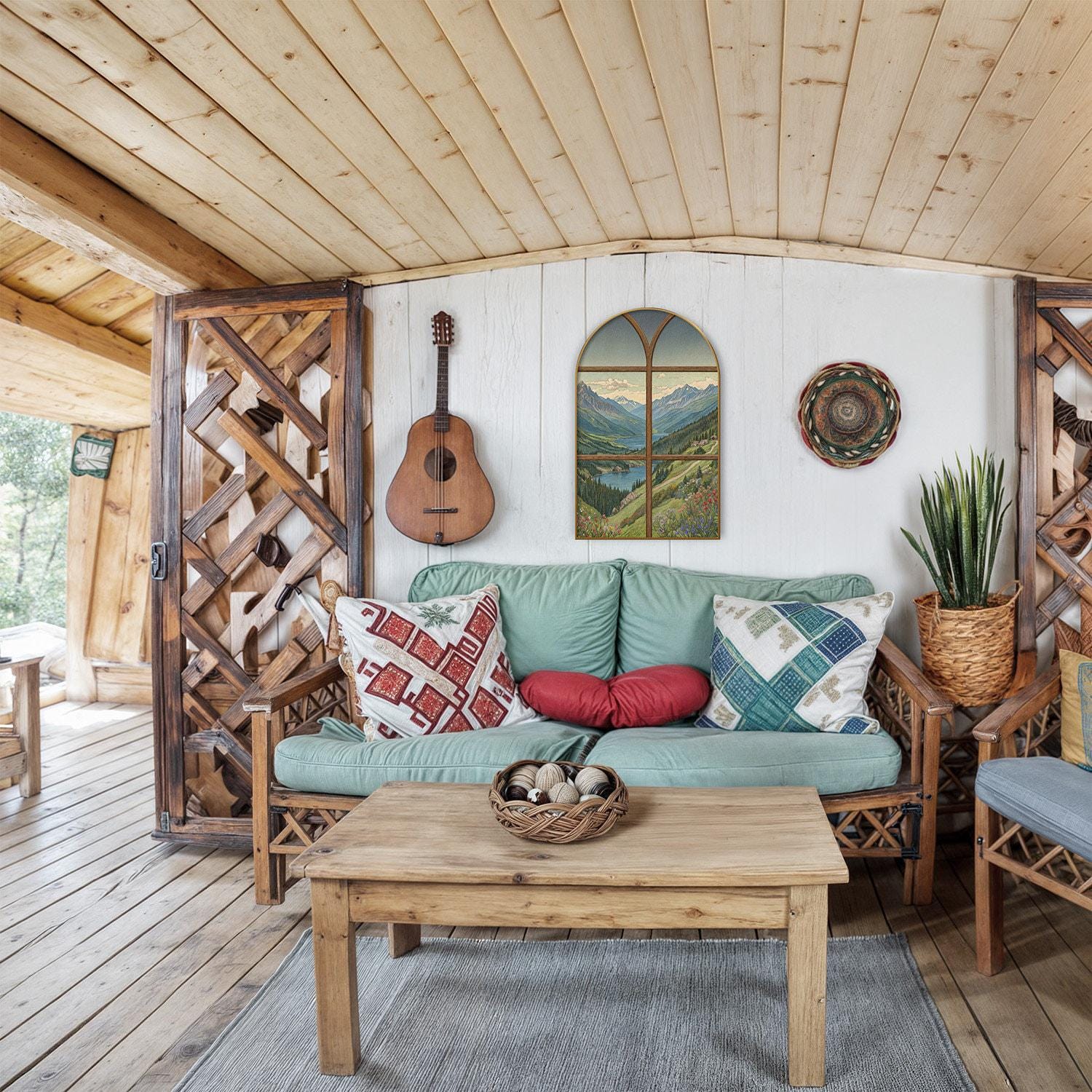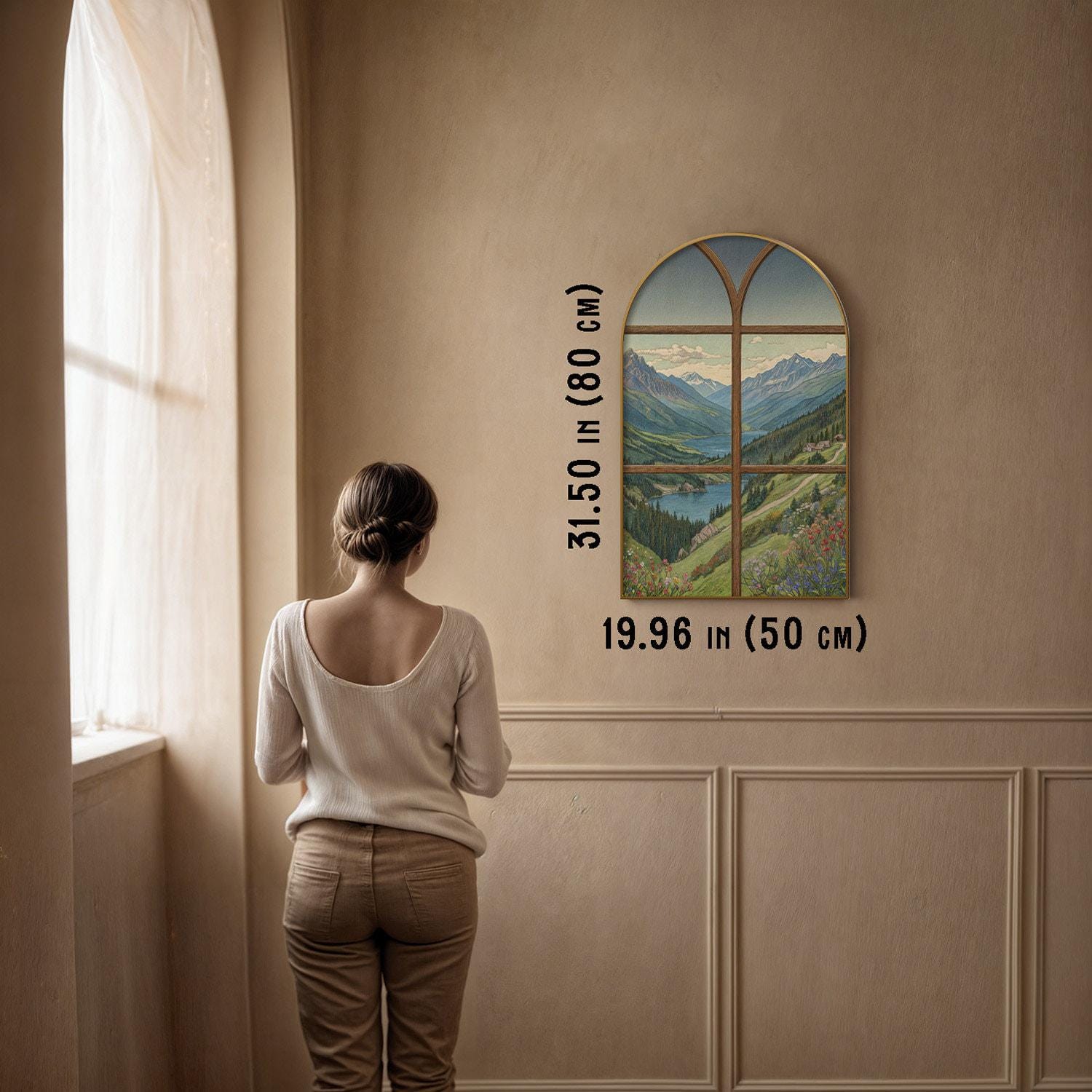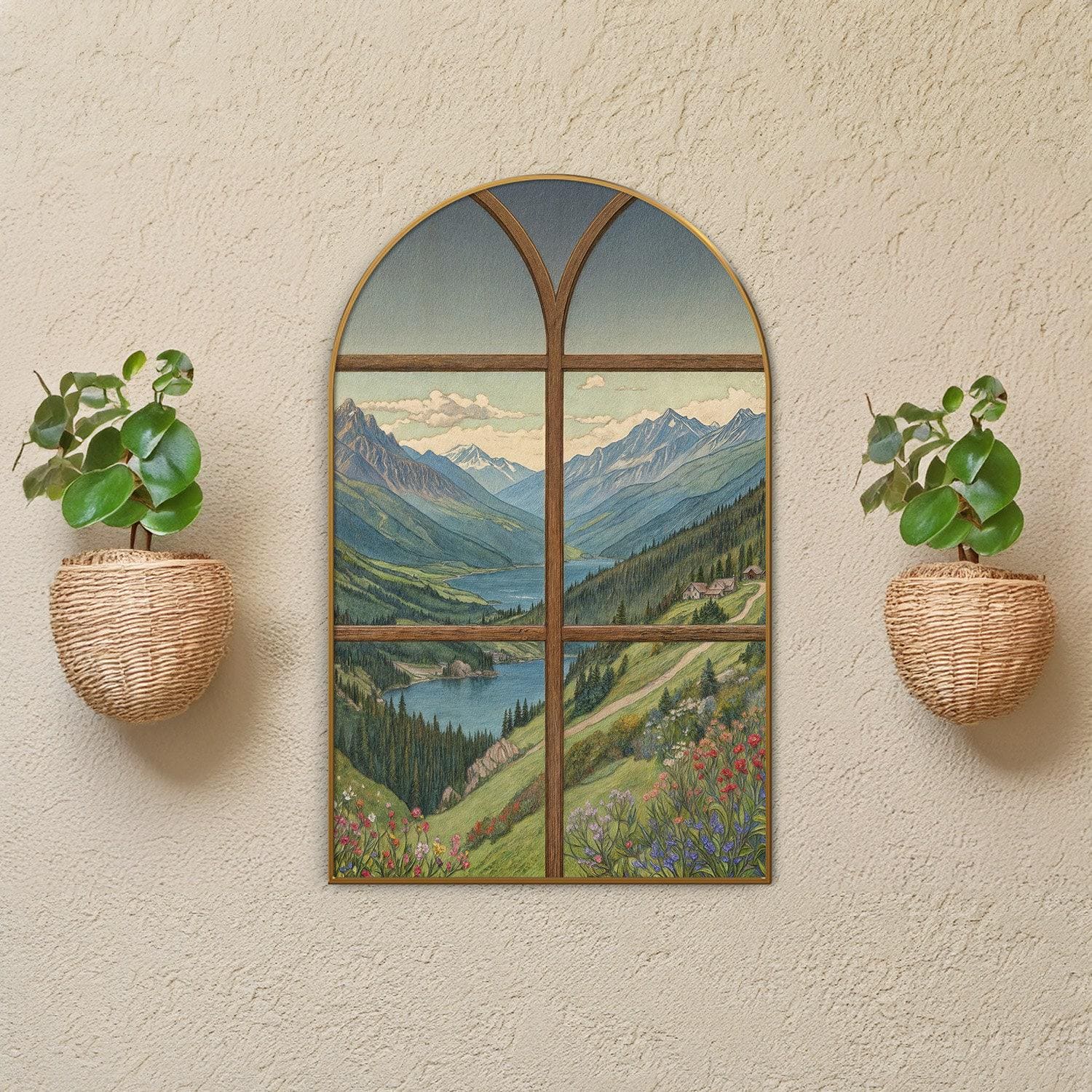 Transform your living space with this exquisite arched wall print that captures a serene landscape of a mountain lake, bringing peaceful nature right into your home. Inspired by rustic wall decor and designed to evoke calmness, this unique window frame art serves as a tranquil room decor centerpiece. Every brushstroke and digital technique combines to create an elegant home style piece that invites relaxation and reflection.