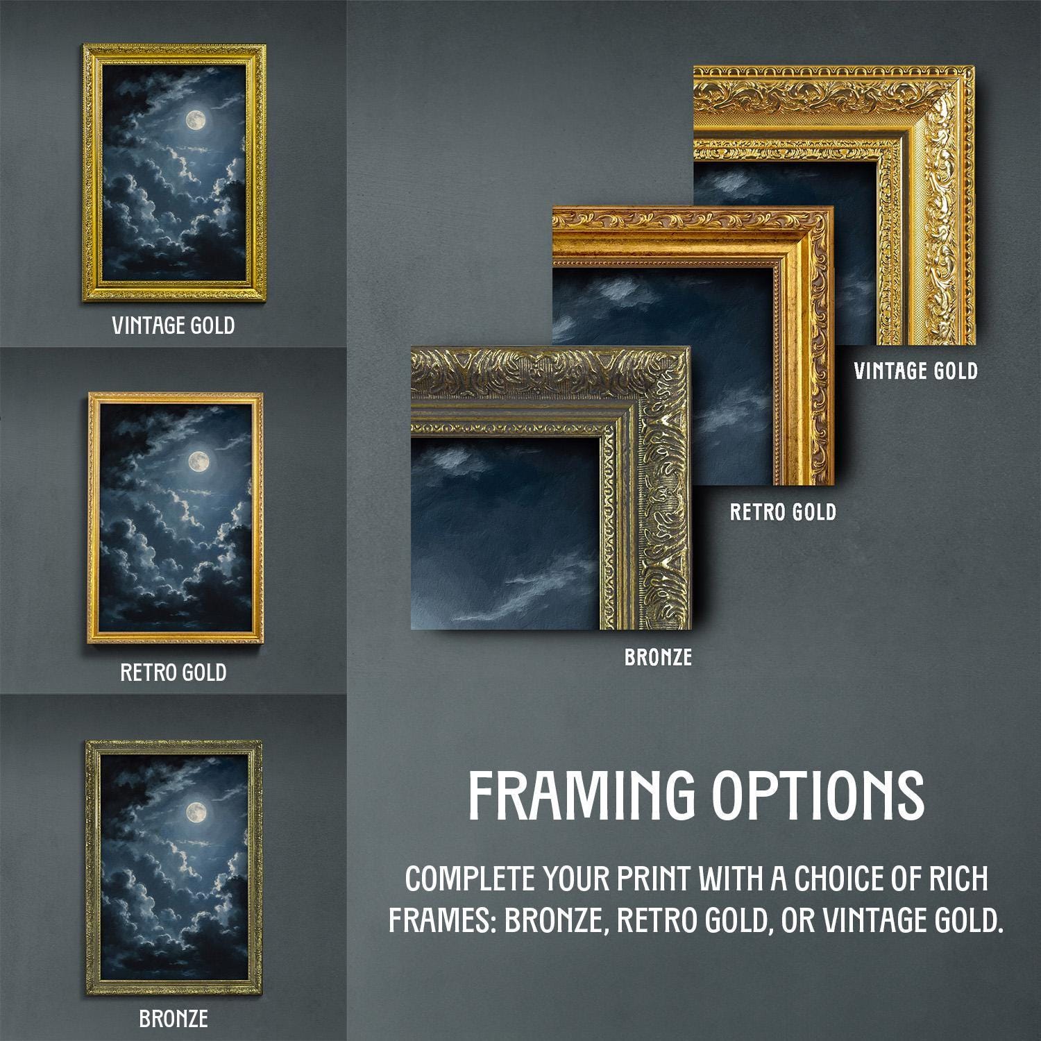Transform your room with this vintage wall art that captures an enigmatic skyline under a tranquil moonlit sky. This ethereal cloud art print is perfect for adding a nocturnal sky art vibe that inspires calm and wonder.