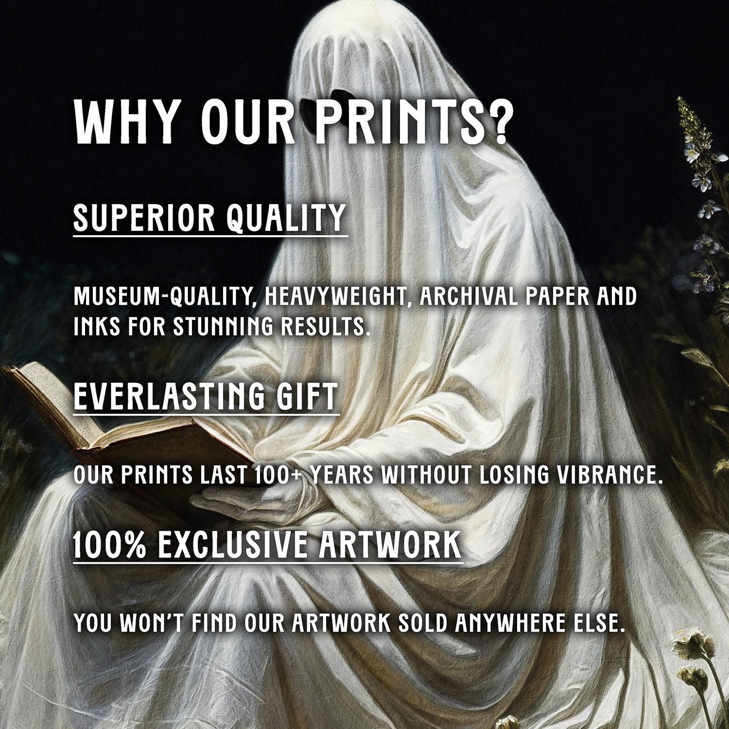 Transform your space with this hauntingly beautiful art print that captures the supernatural charm of a literary ghost immersed in a quiet meadow. This gothic wall art blends moody, mysterious decor with a touch of fantasy, making it an ideal centerpiece for any dark academia enthusiast or fan of eerie night paintings.