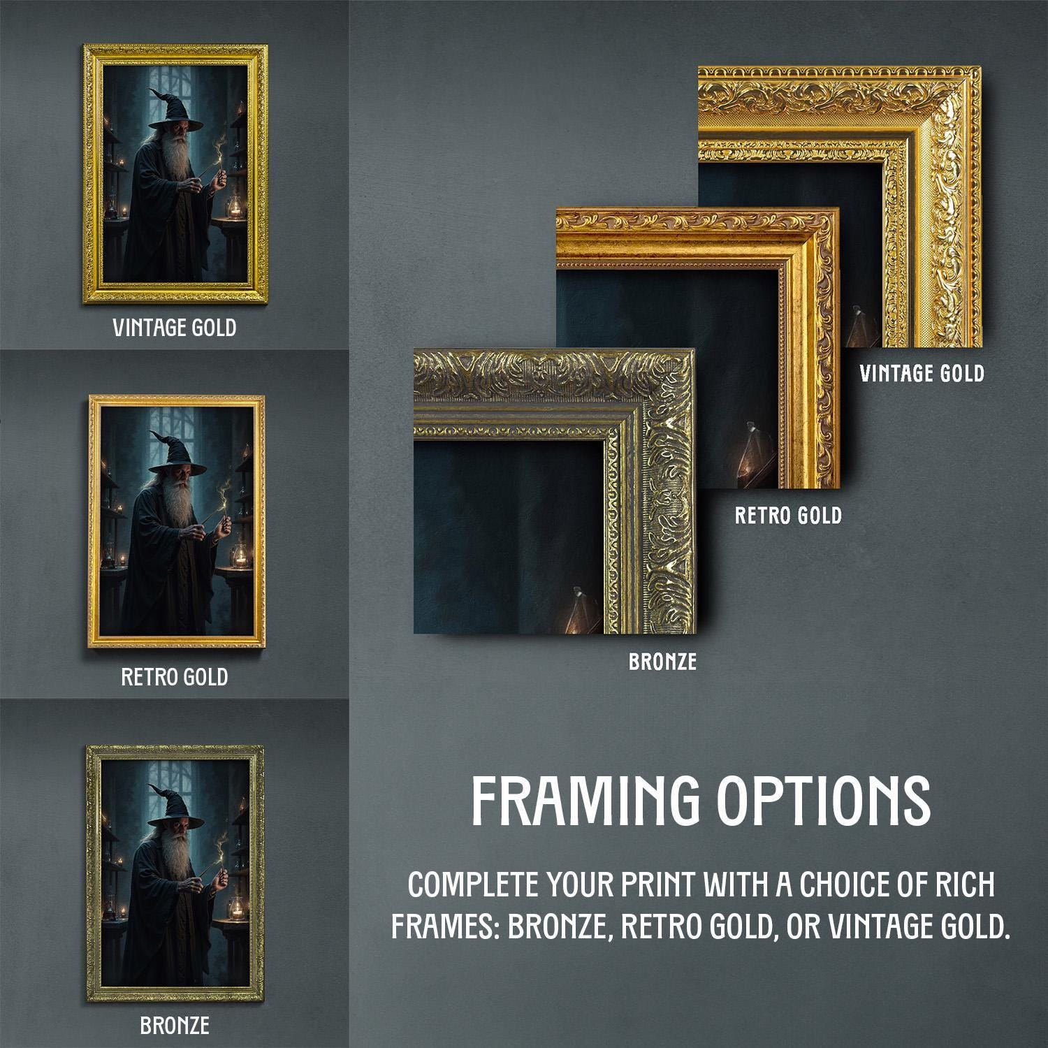 β’ Choice of bronze, retro gold, and vintage gold frame.