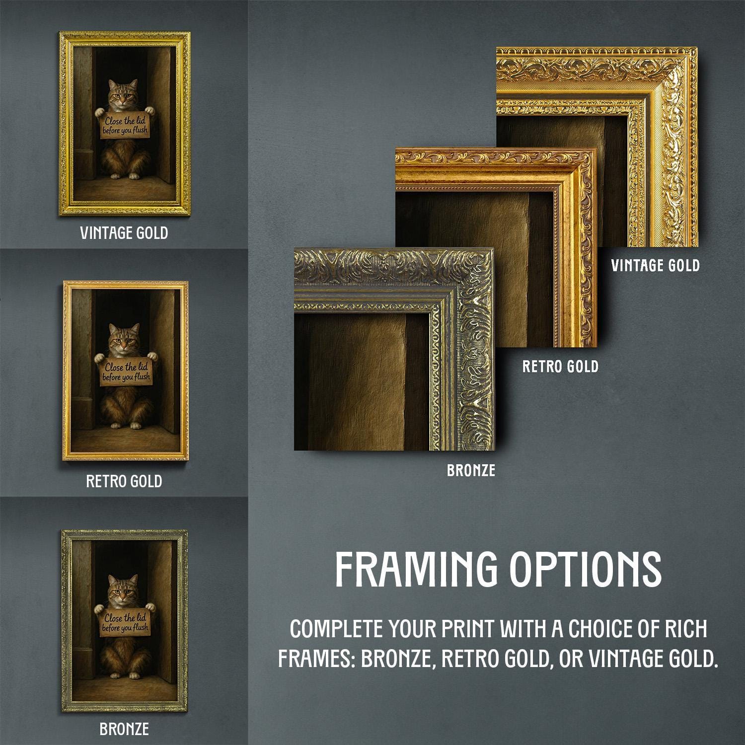 Elevate your bathroom or toilet wall with this unique cat poster that blends humor and vintage style. Printed on luxurious archival paper using museum-quality inks, this print promises vibrant colors and lasting beauty. Choose from elegant bronze, retro gold, or vintage gold frames to complement your quirky restroom decoration.