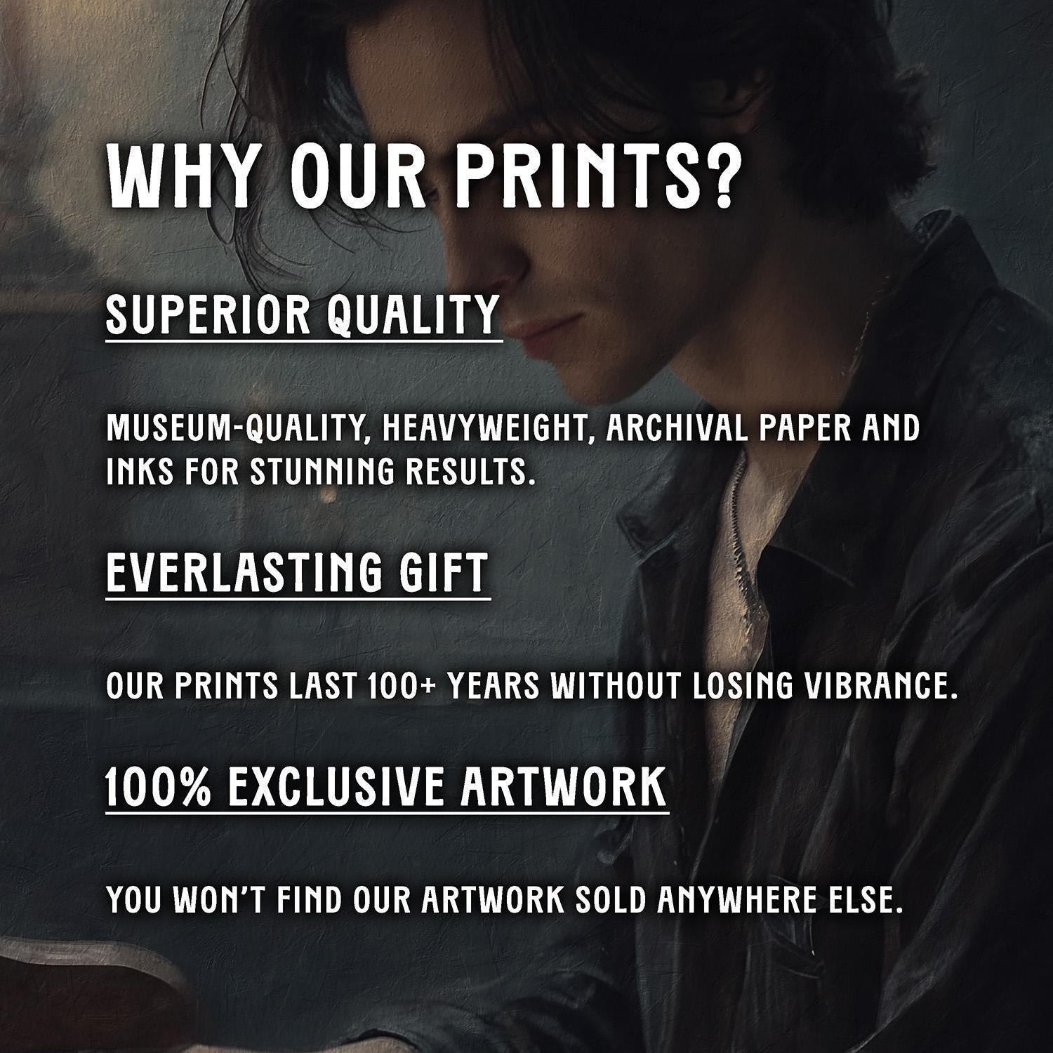 Our art prints are produced on museum-quality paper using archival inks to guarantee they last a lifetime without fading or losing color.