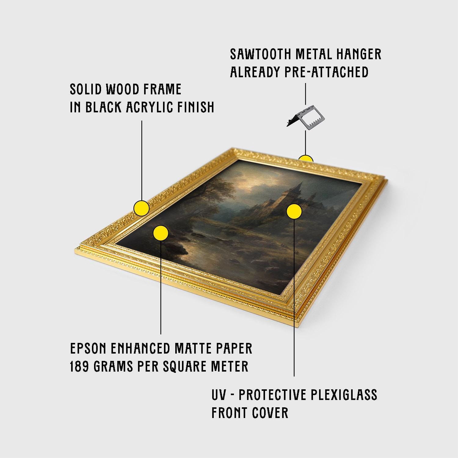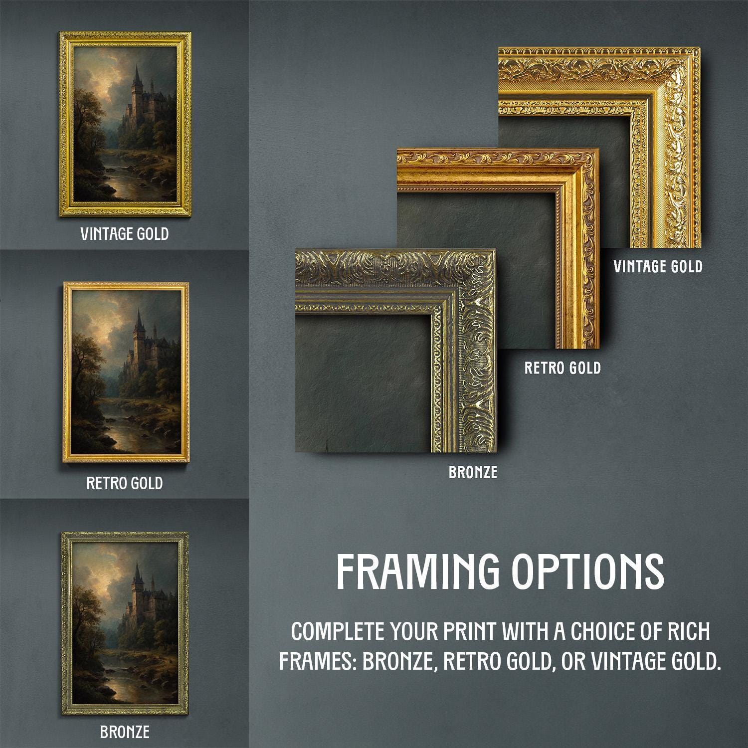 β’ Choice of bronze, retro gold, and vintage gold frame.