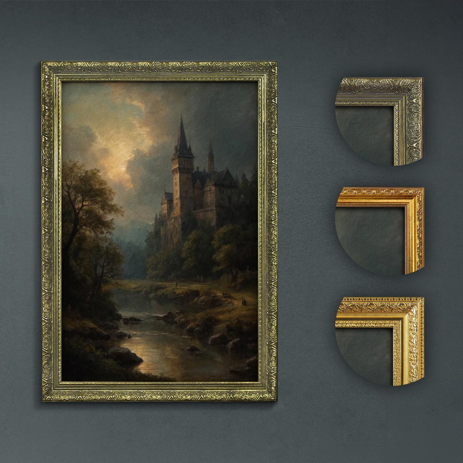 Discover the enchanting allure of moody dark wall art featuring a castle by a river, perfect for dark academia decor and lovers of nostalgic, witchy vibes.